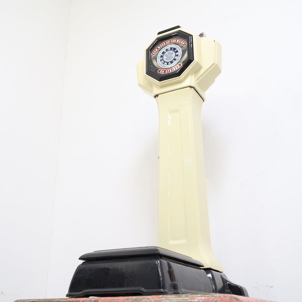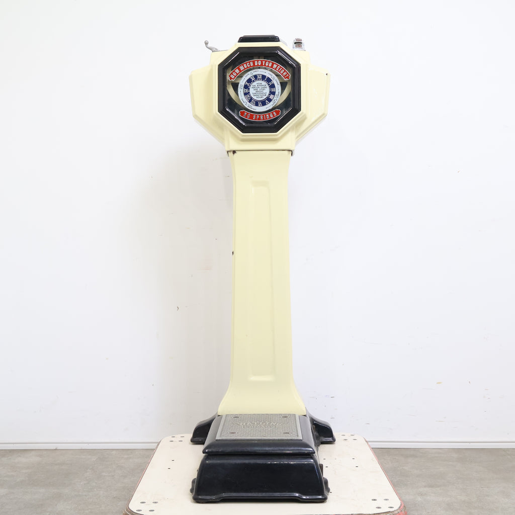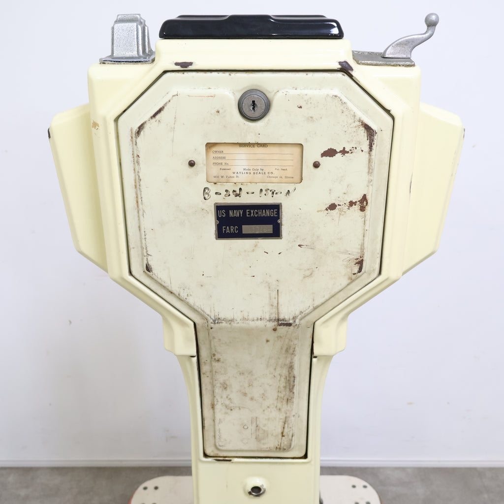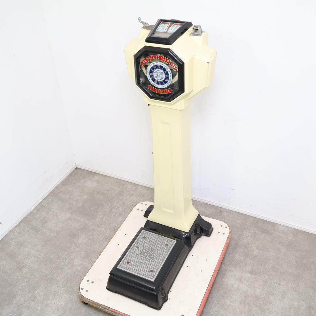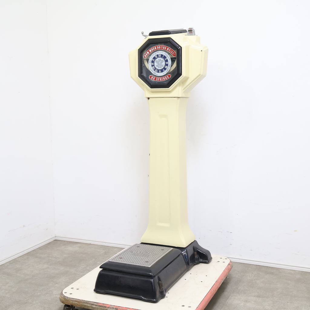 アメリカンヴィンテージな雰囲気漂う、コイン投入式の体重計です。