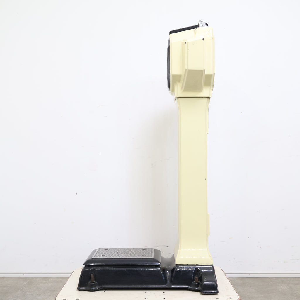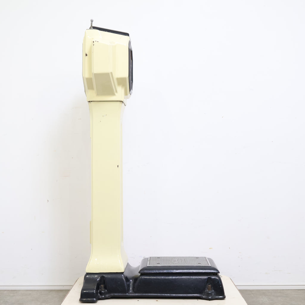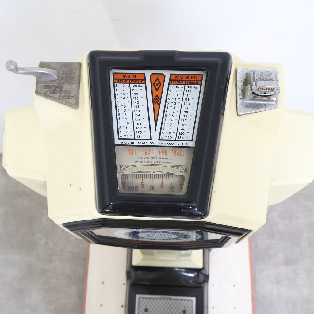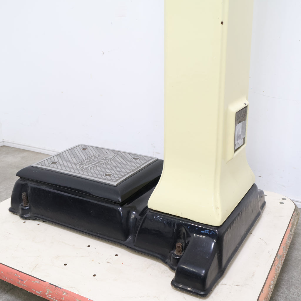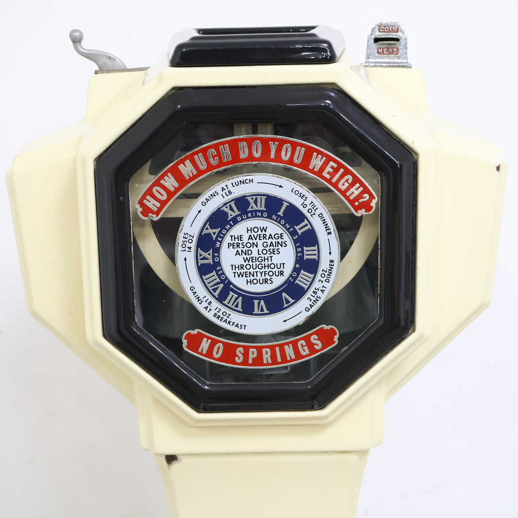 アメリカンヴィンテージな雰囲気漂う、コイン投入式の体重計です。