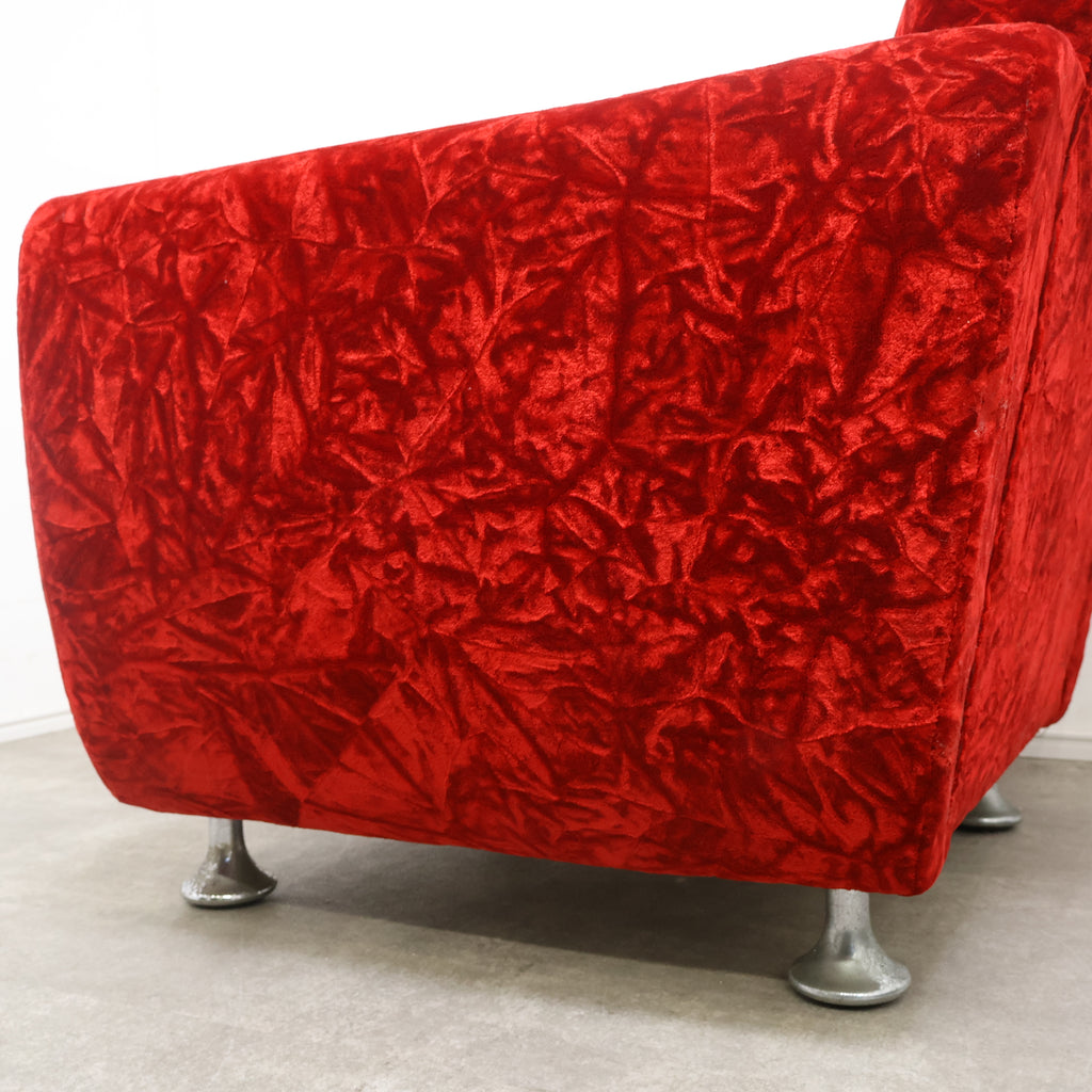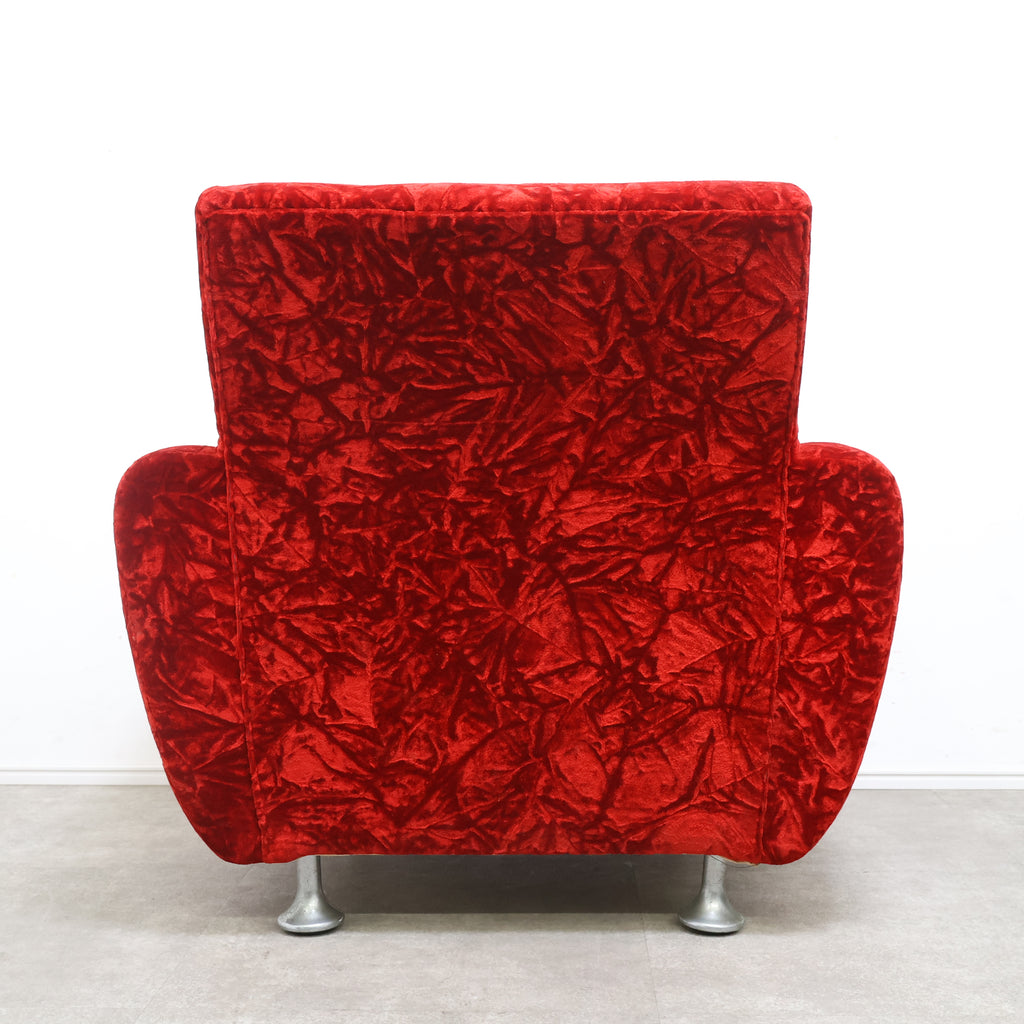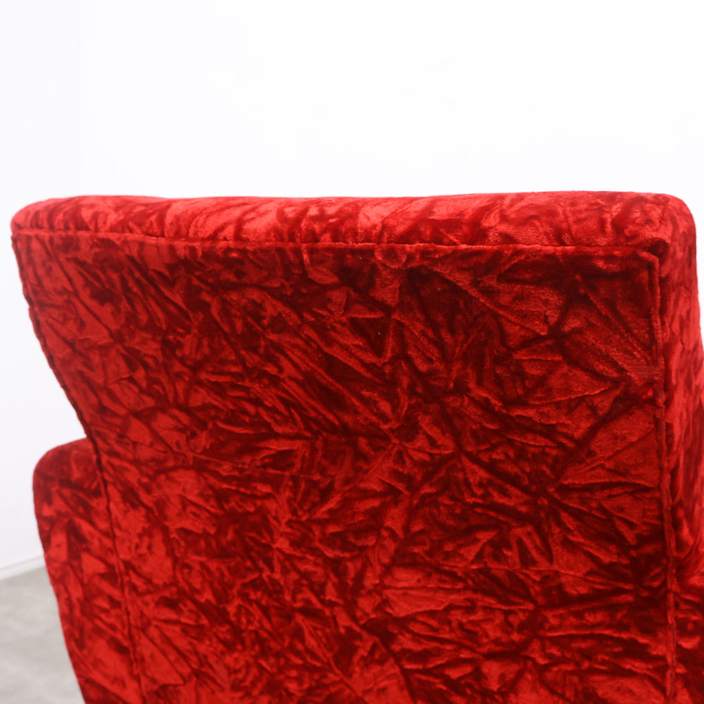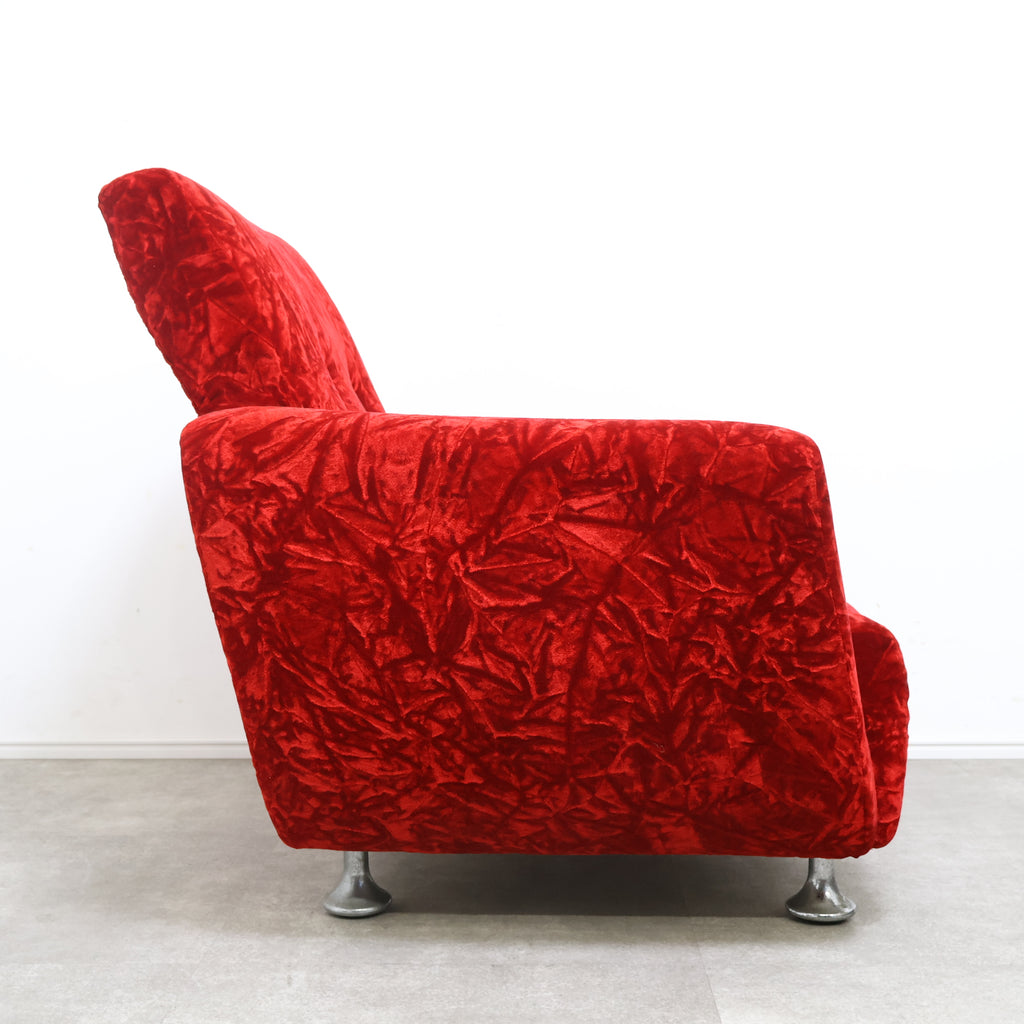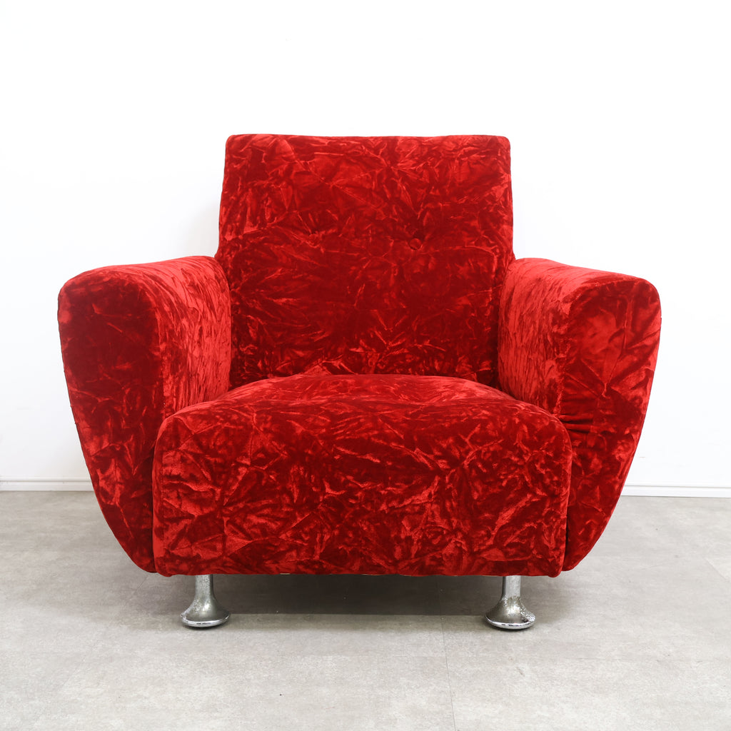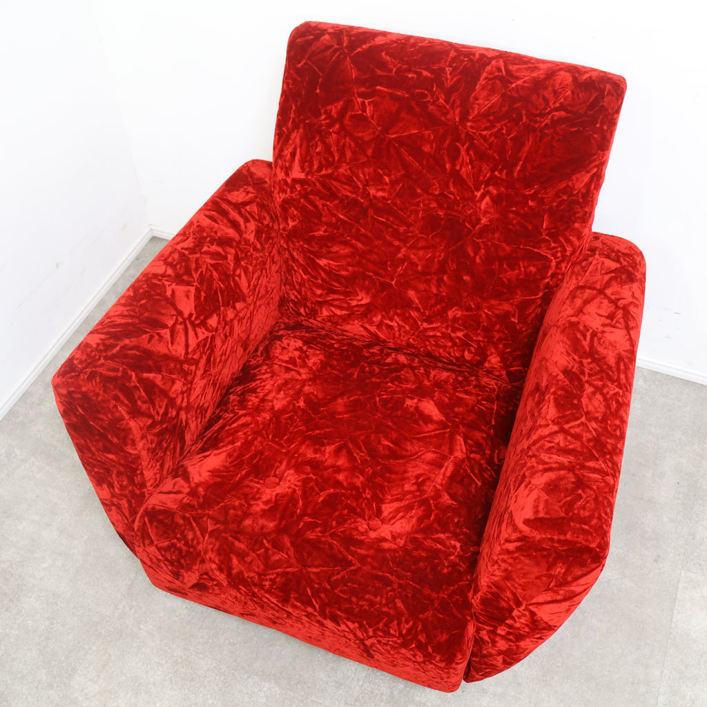 深みのあるレッドベルベットが印象的な、昭和レトロの一人掛けソファ。
