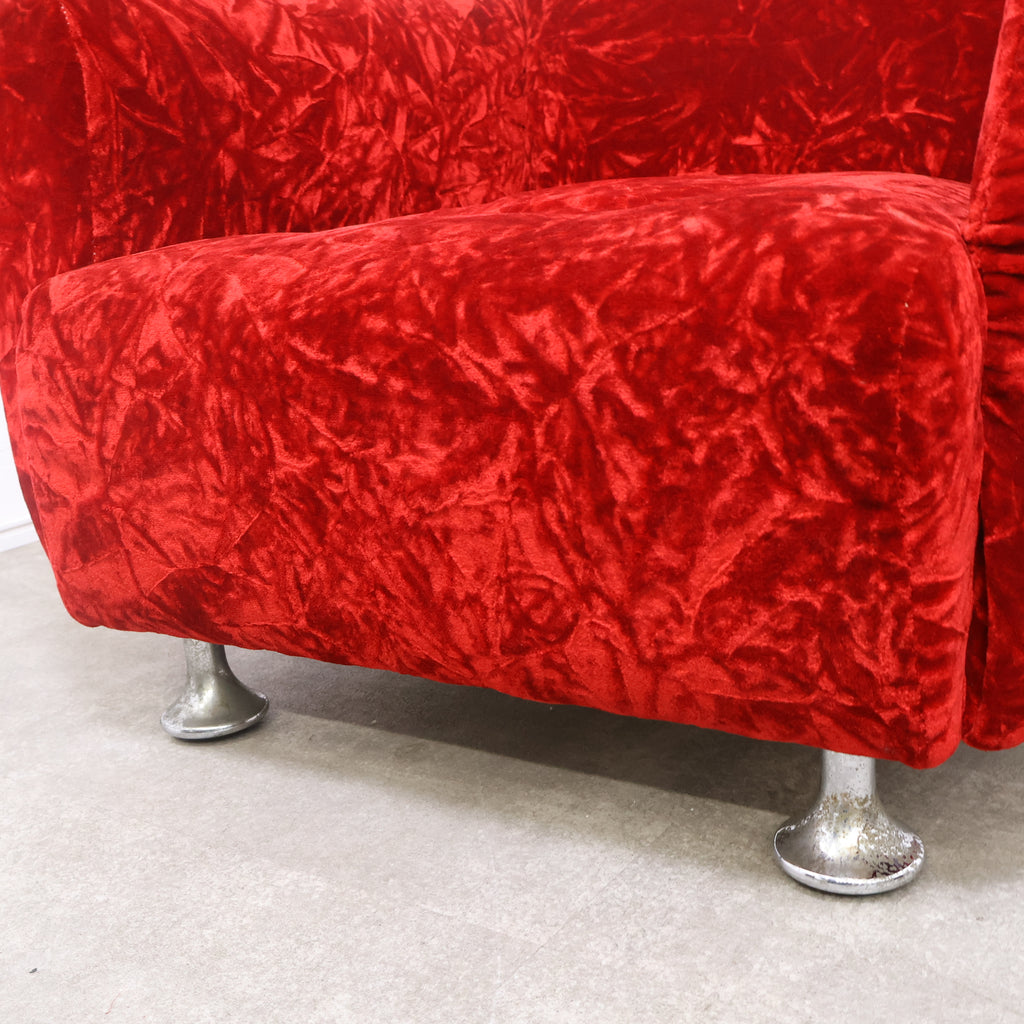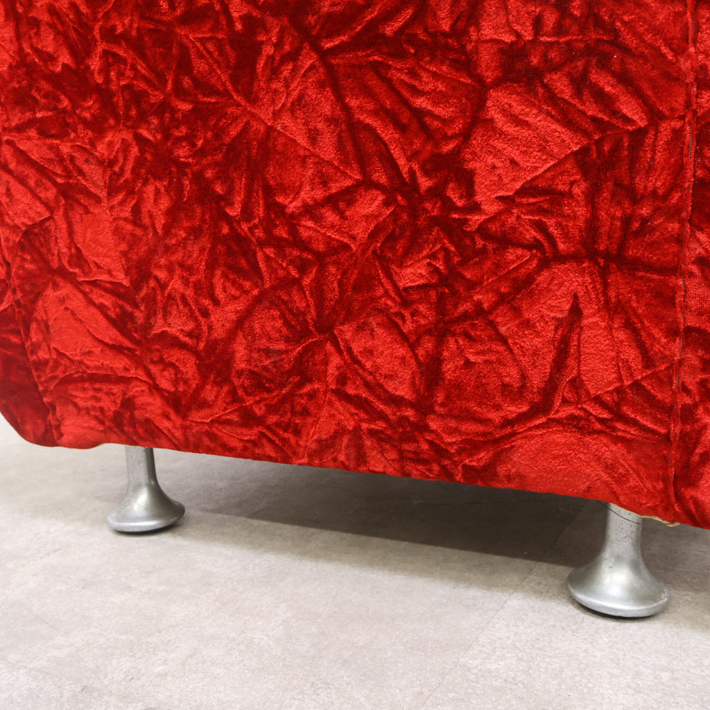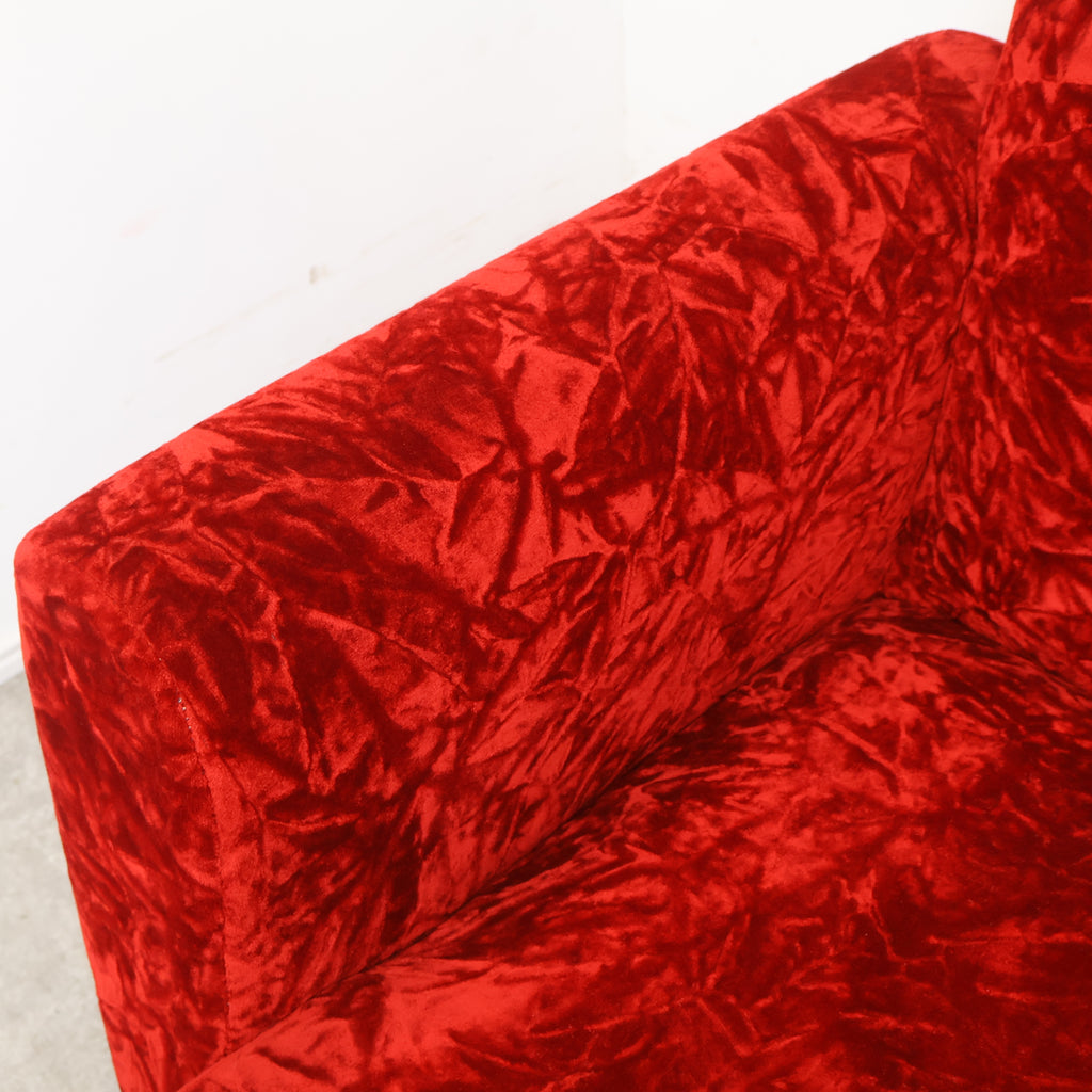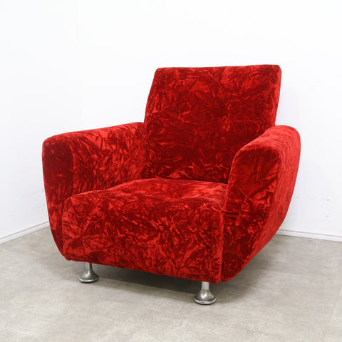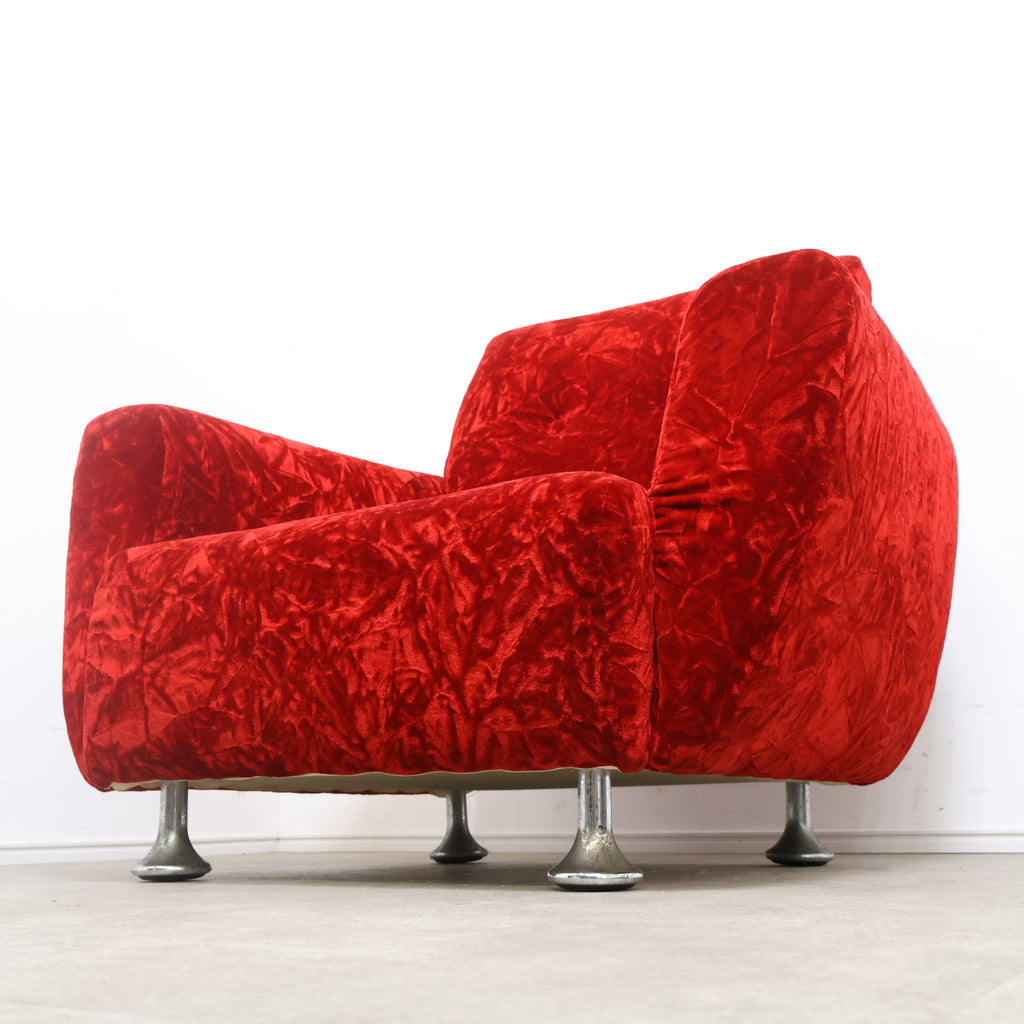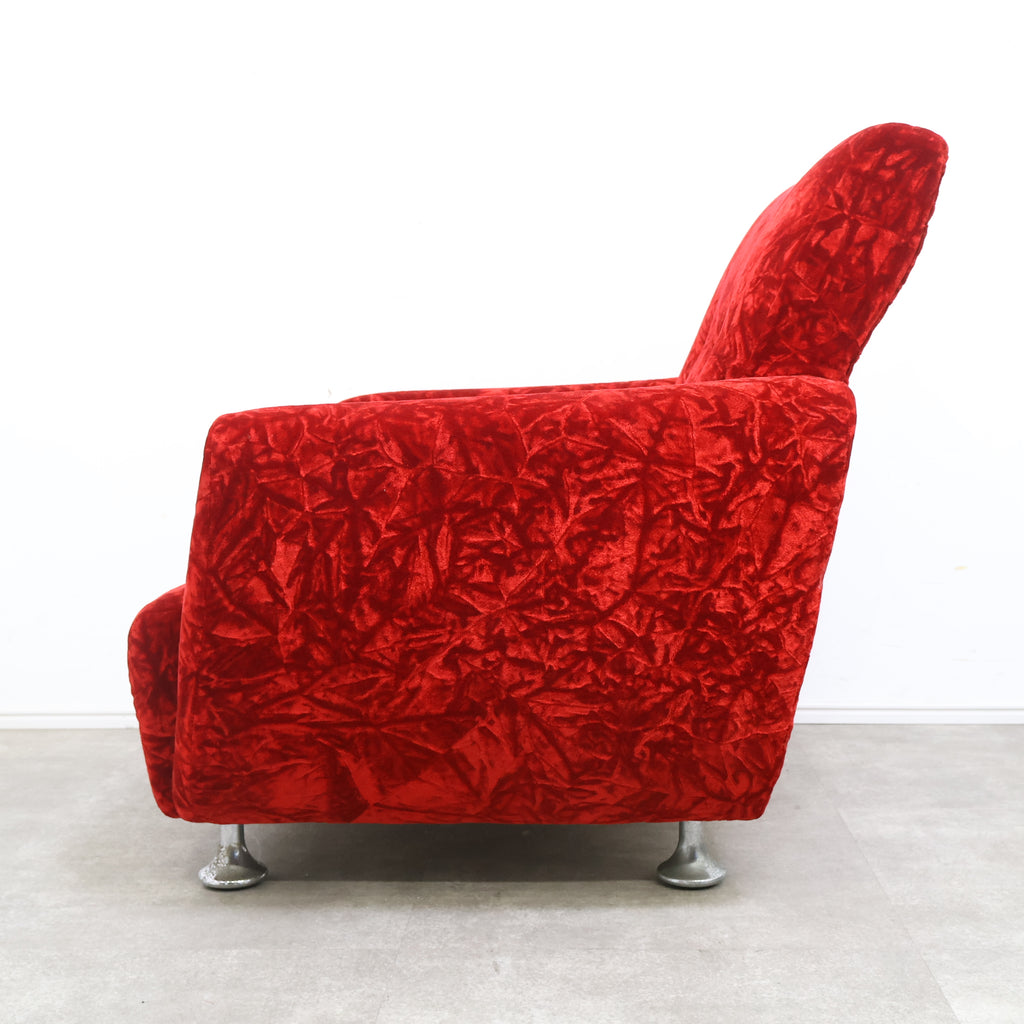 深みのあるレッドベルベットが印象的な、昭和レトロの一人掛けソファ。