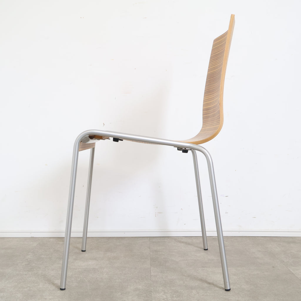 流れるようなカーブを描く背座面と、細身のメタリックな四本脚が、シャープでモダンな印象を与えます。軽量でありながら頑丈な設計で、複数脚をスタッキングが可能。使わない時も省スペースで収納できます。