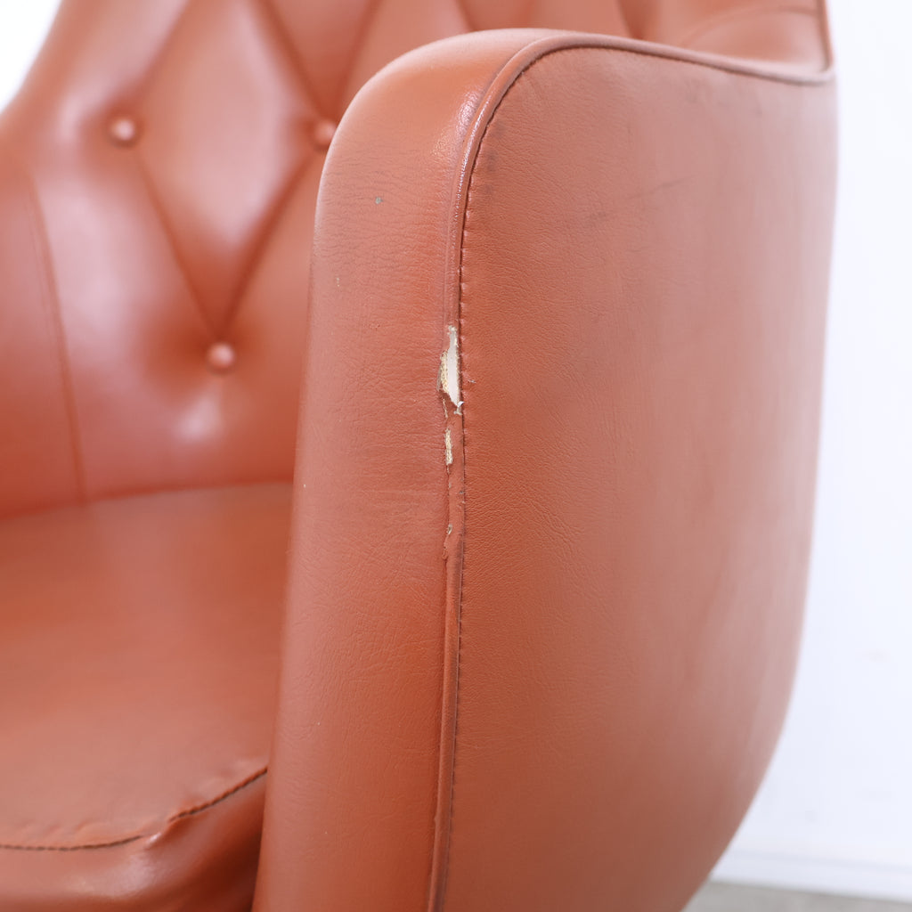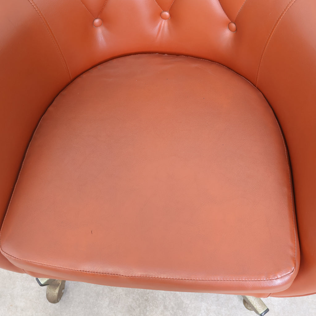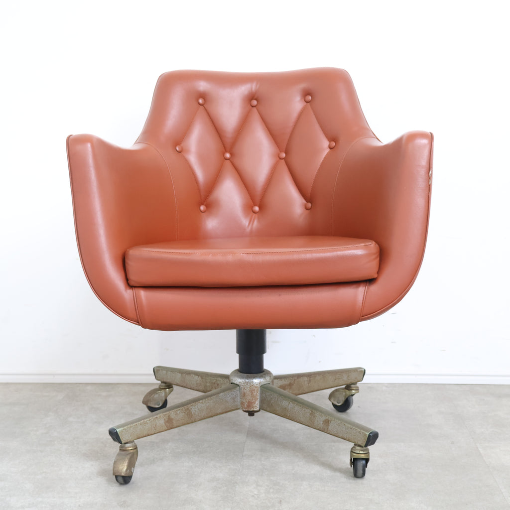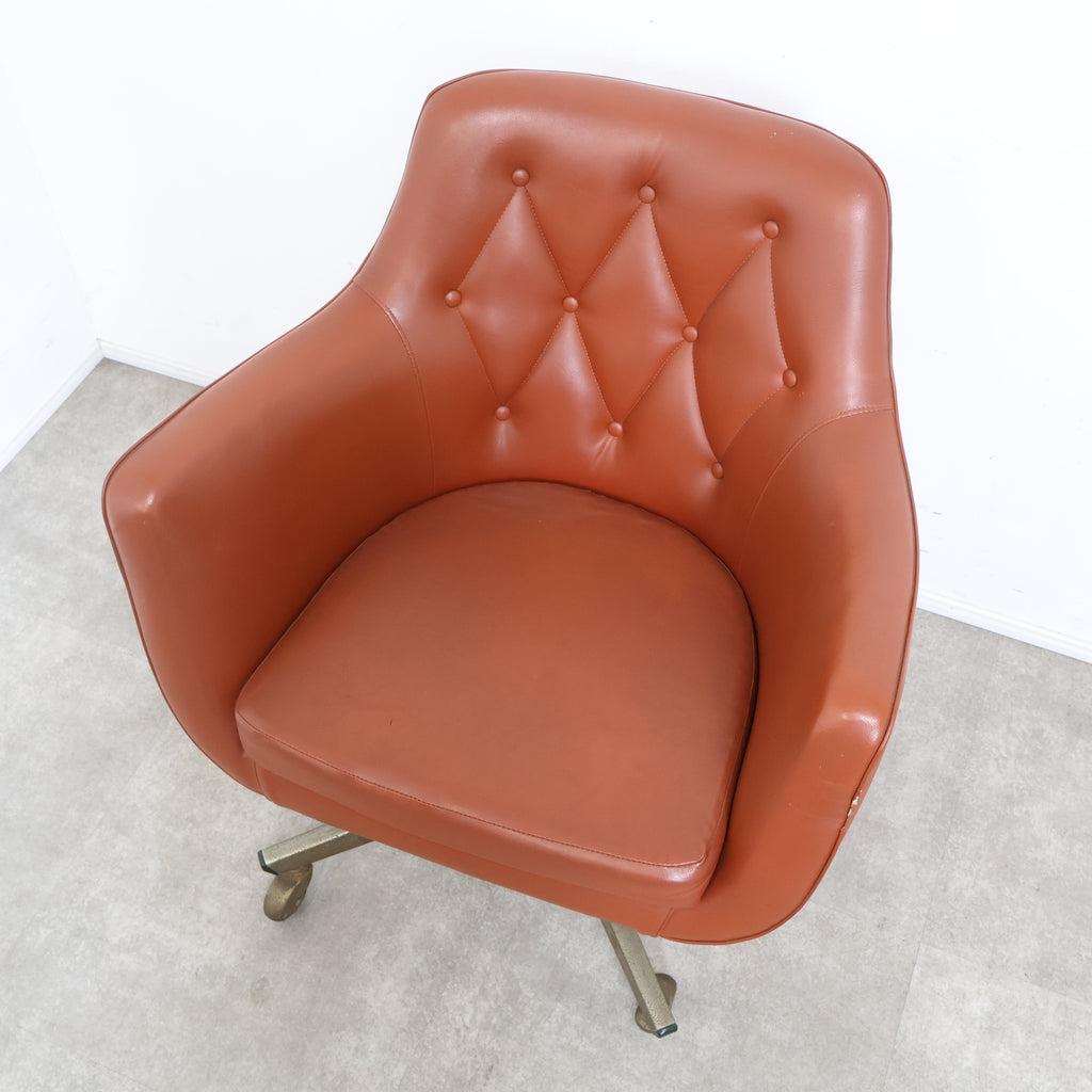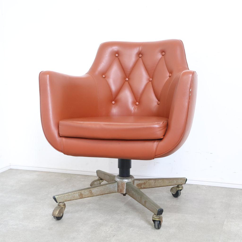 深みのあるオレンジブラウンの合皮と、背もたれのボタン留めデザインが印象的で、どこか懐かしく温かみのある佇まいです。 アーム付きでしっかりとした座り心地があり、デスクワーク用としてはもちろん、ショップ什器やインテリアのアクセントにもおすすめ。
