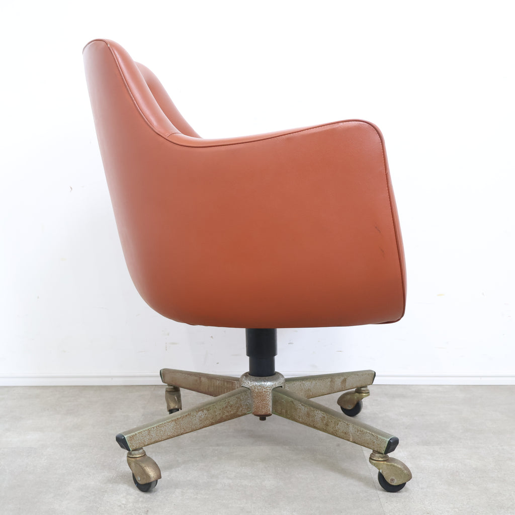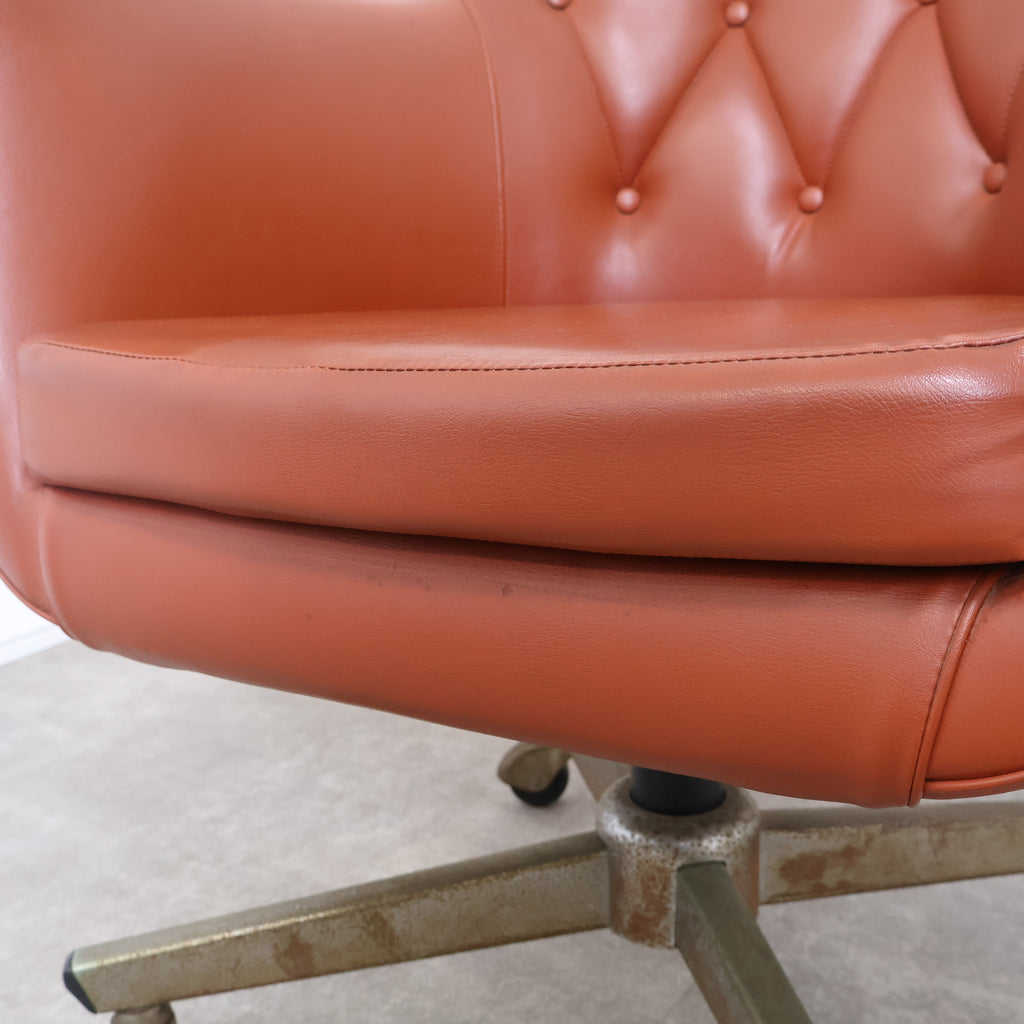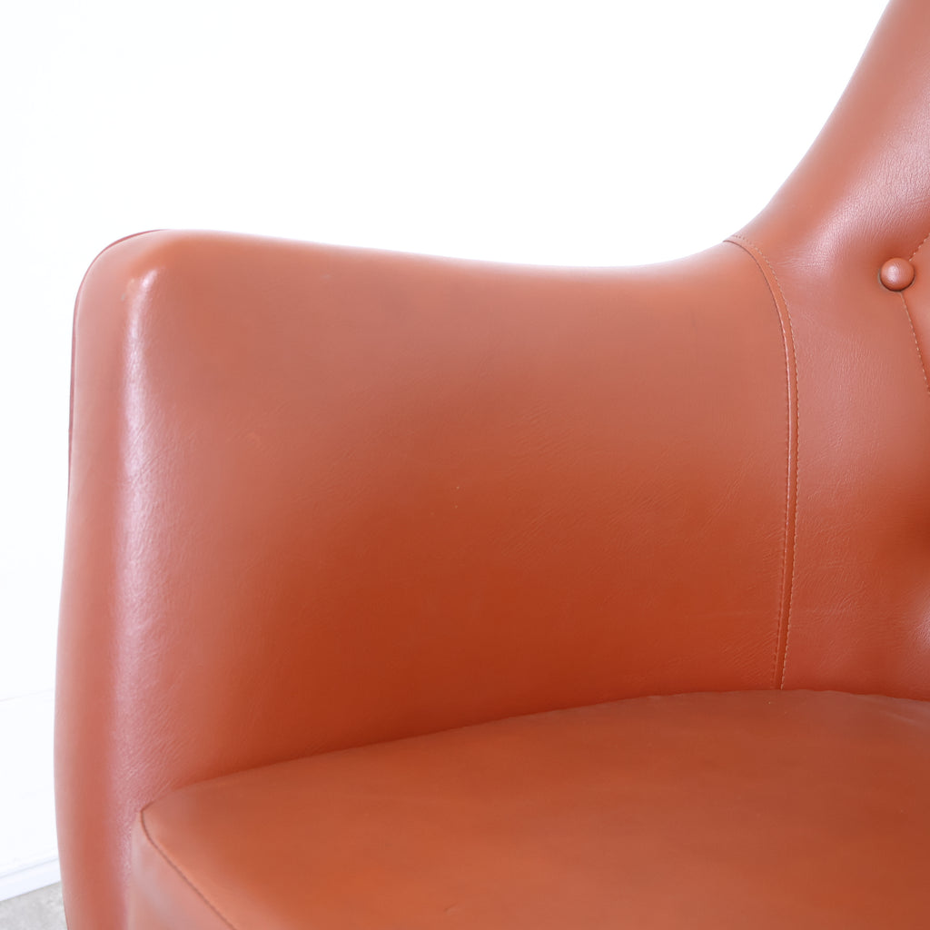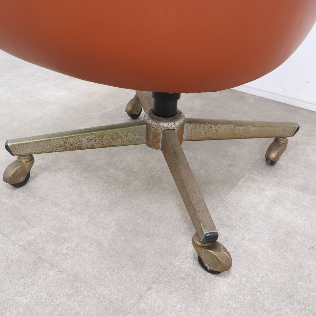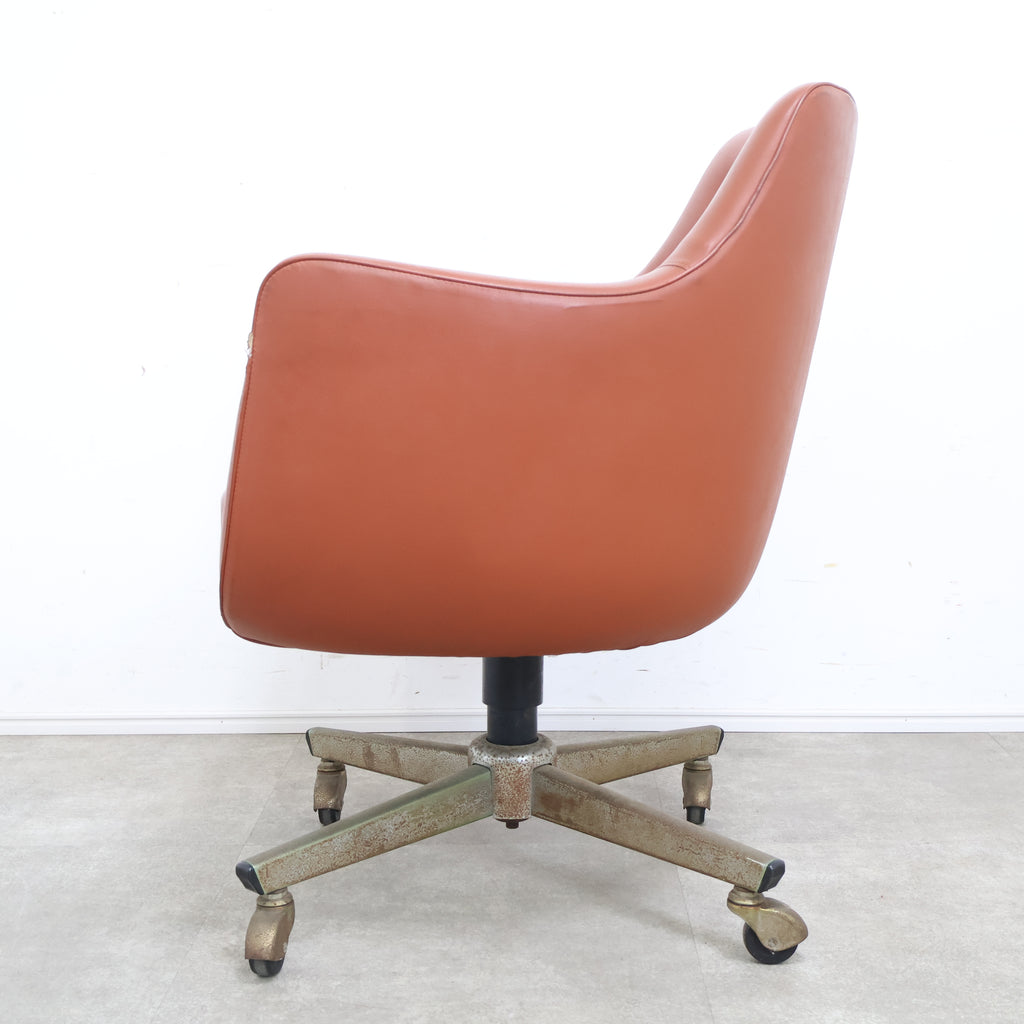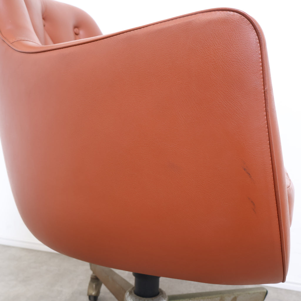 深みのあるオレンジブラウンの合皮と、背もたれのボタン留めデザインが印象的で、どこか懐かしく温かみのある佇まいです。 アーム付きでしっかりとした座り心地があり、デスクワーク用としてはもちろん、ショップ什器やインテリアのアクセントにもおすすめ。