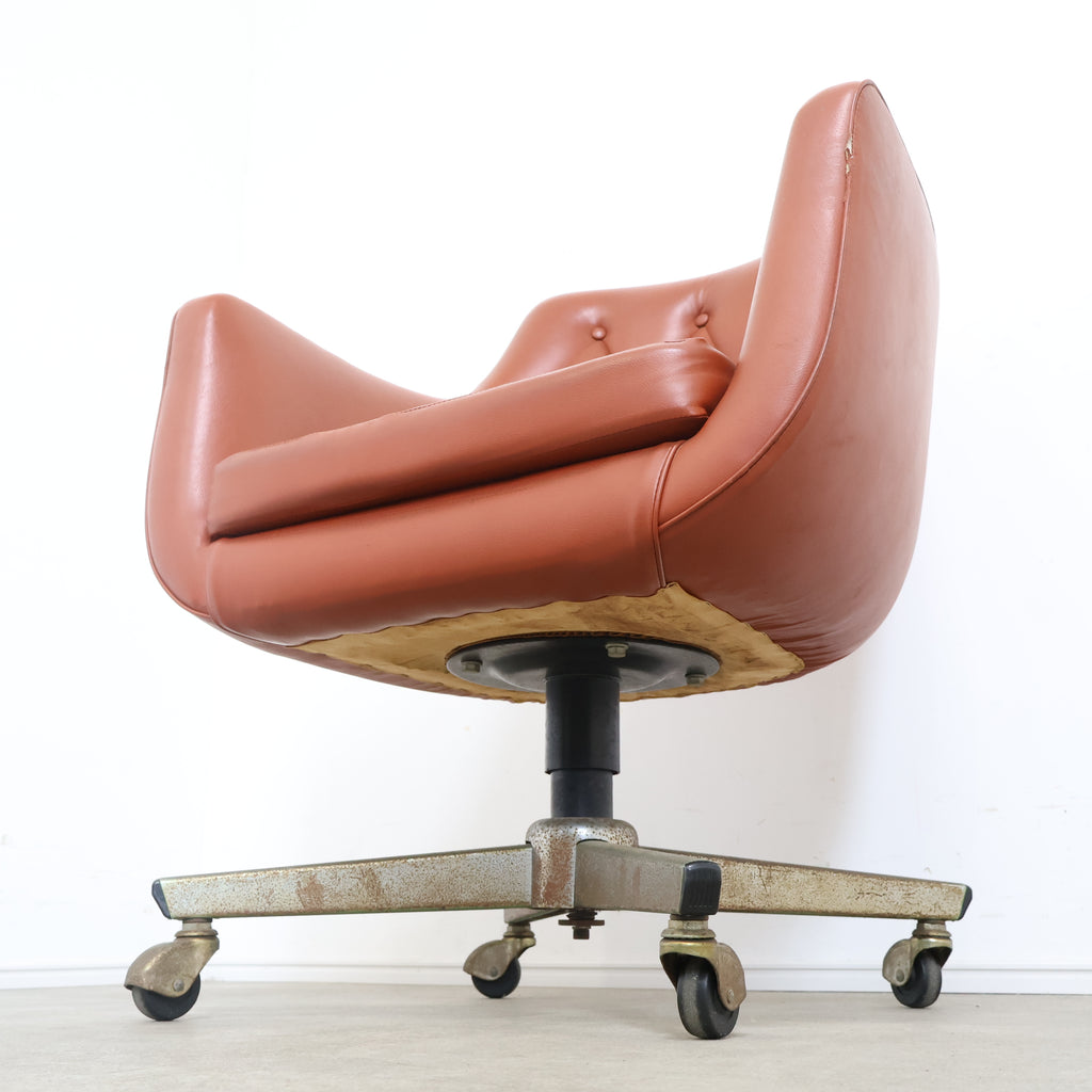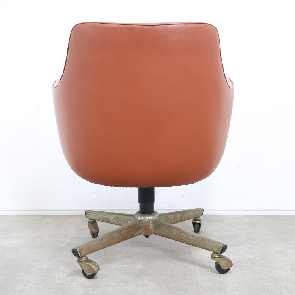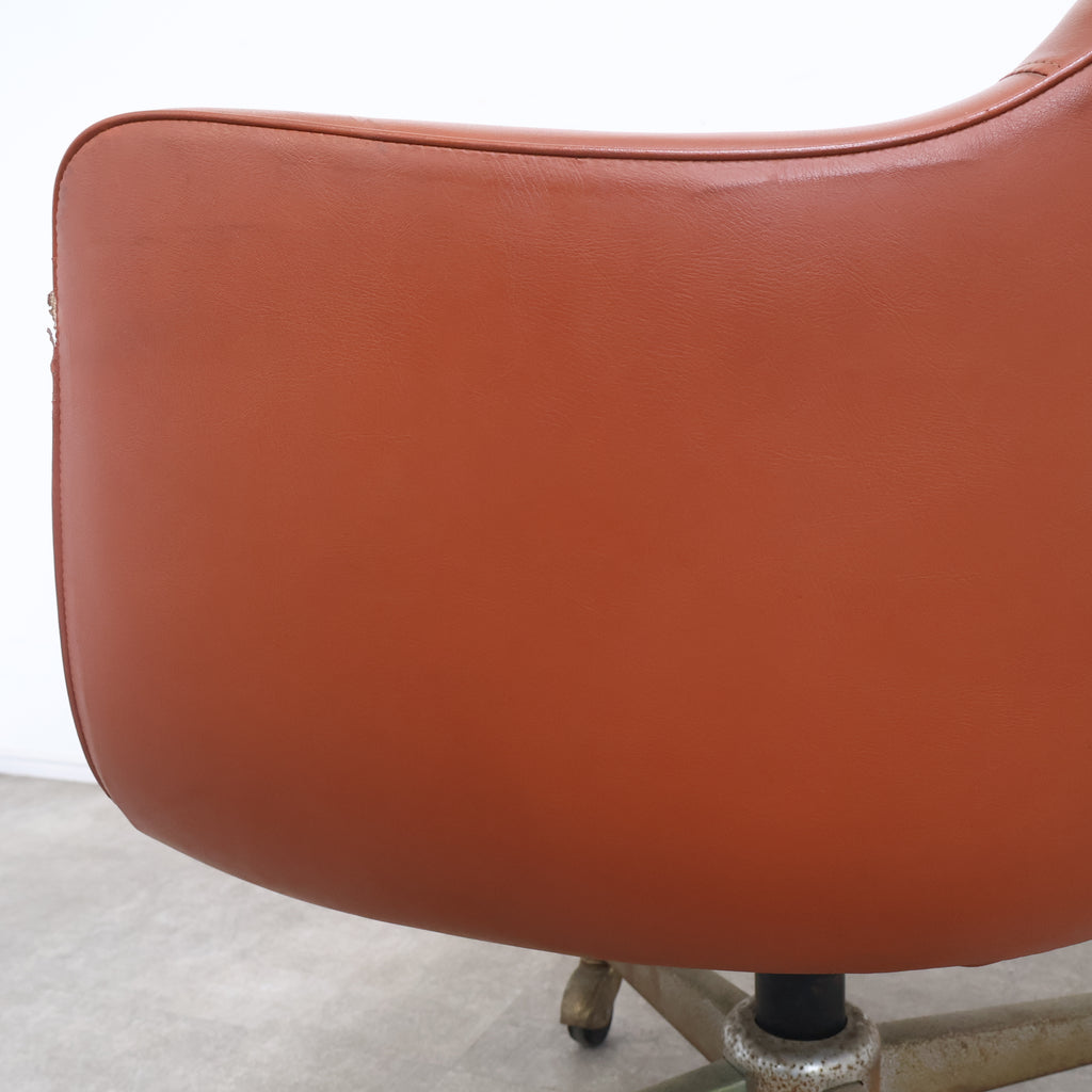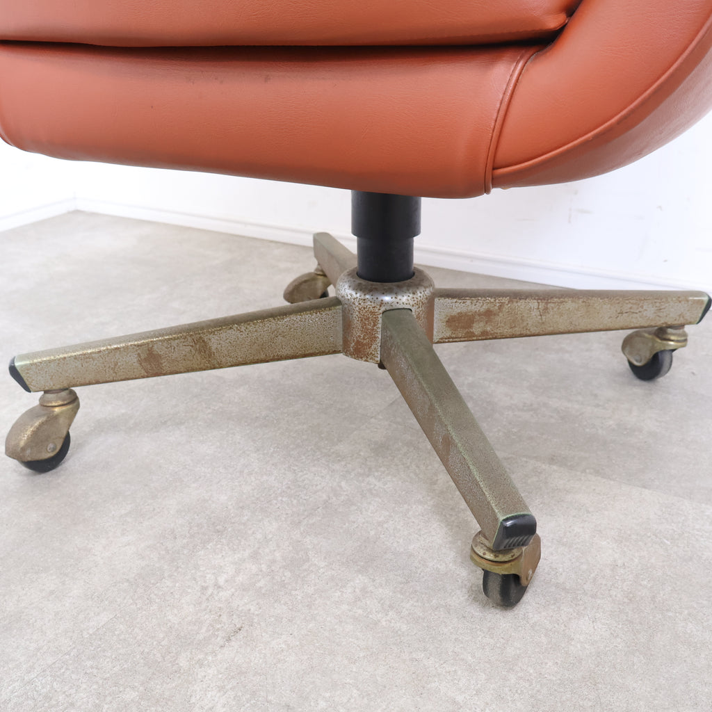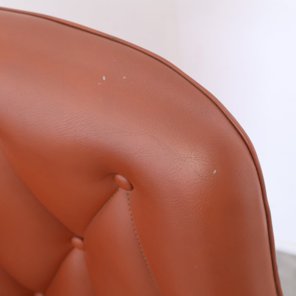 深みのあるオレンジブラウンの合皮と、背もたれのボタン留めデザインが印象的で、どこか懐かしく温かみのある佇まいです。 アーム付きでしっかりとした座り心地があり、デスクワーク用としてはもちろん、ショップ什器やインテリアのアクセントにもおすすめ。