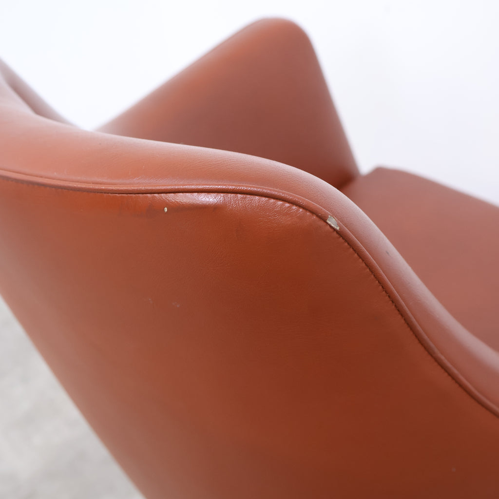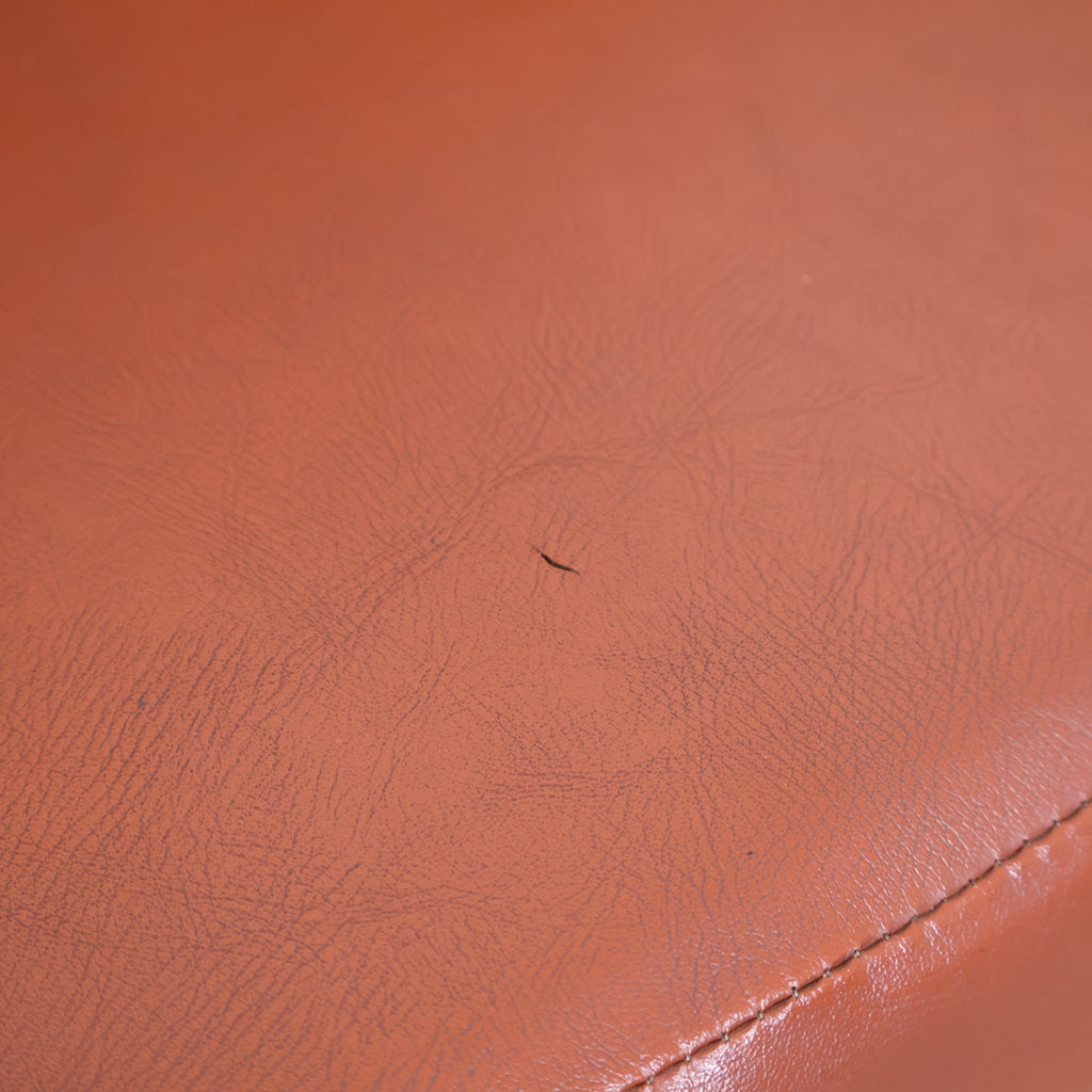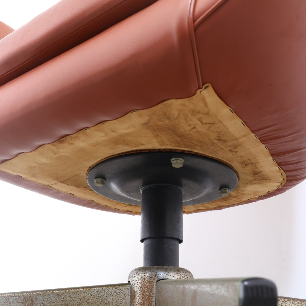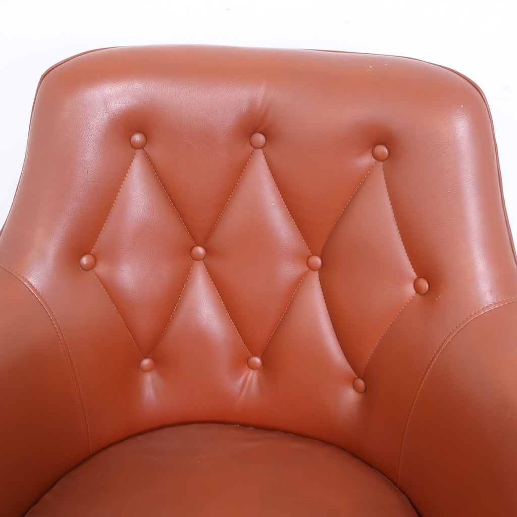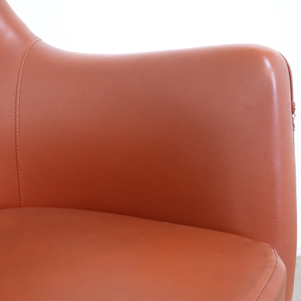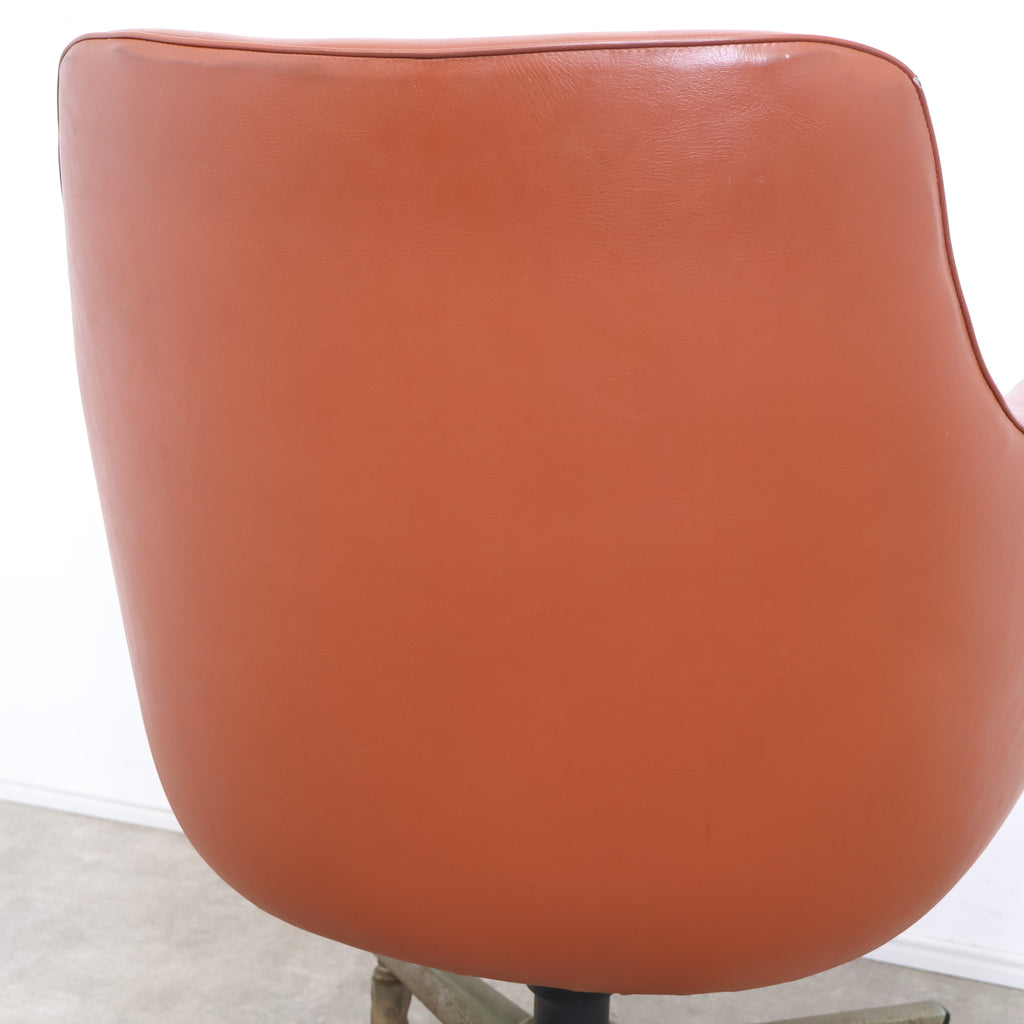 深みのあるオレンジブラウンの合皮と、背もたれのボタン留めデザインが印象的で、どこか懐かしく温かみのある佇まいです。 アーム付きでしっかりとした座り心地があり、デスクワーク用としてはもちろん、ショップ什器やインテリアのアクセントにもおすすめ。