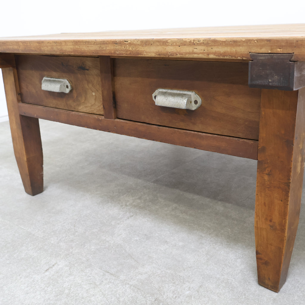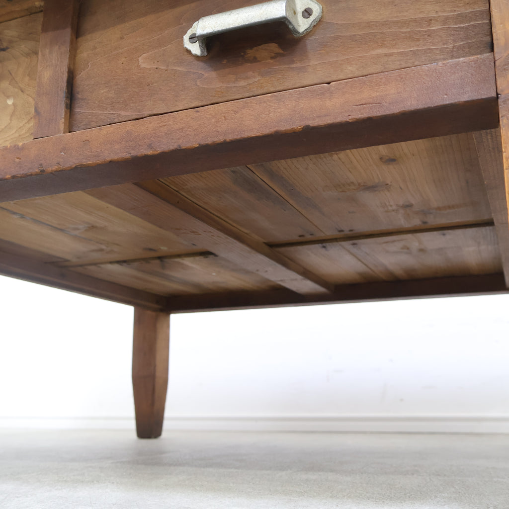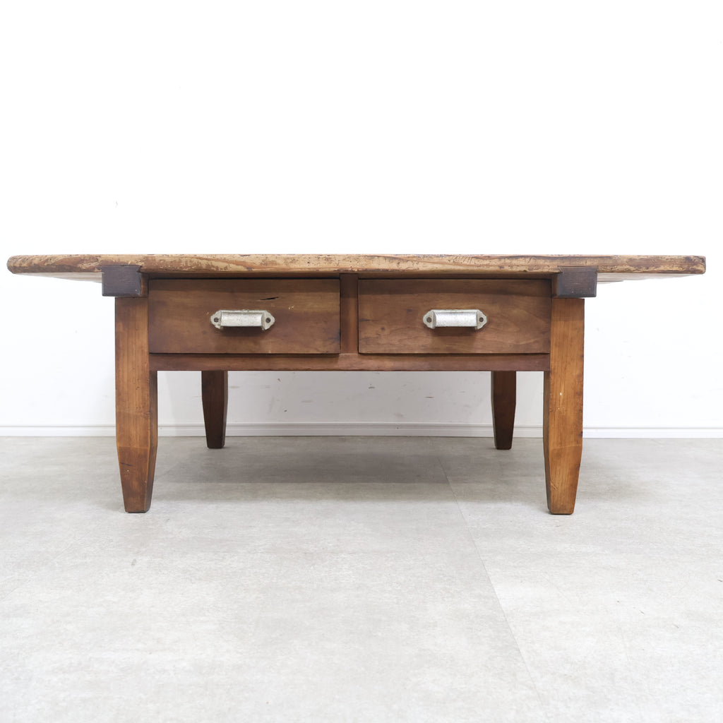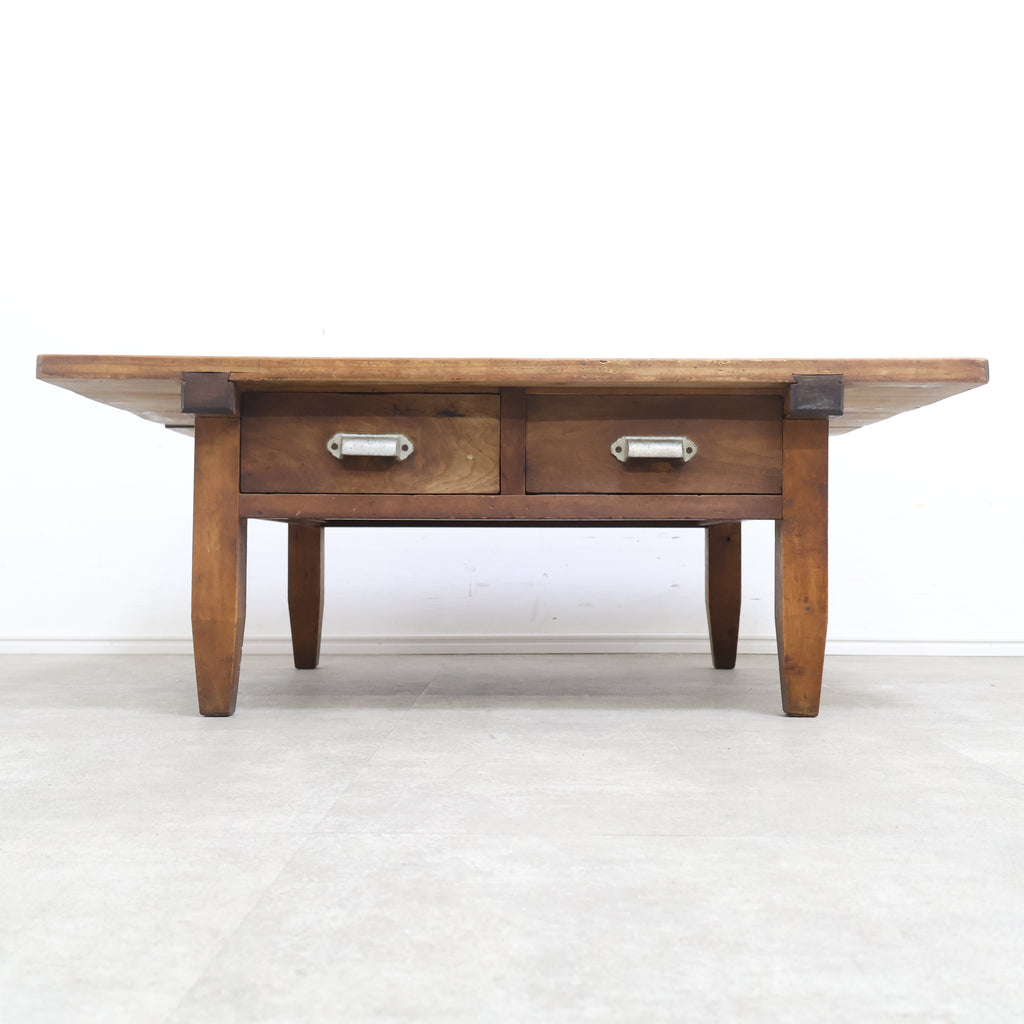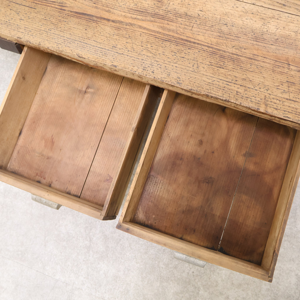 天板には厚みのある無垢材が使用され、長い年月を経た木の風合い、色艶、そして使用による傷や凹みが、唯一無二のヴィンテージな表情を作り出しています。 最大の特徴は、テーブルの対面(両サイド)に引き出しが2杯ずつ、合計4杯の収納を備えている点です。カトラリーや文房具、リモコンなどを整理でき、二人で向かい合って座っても便利に使える実用性の高い設計です。