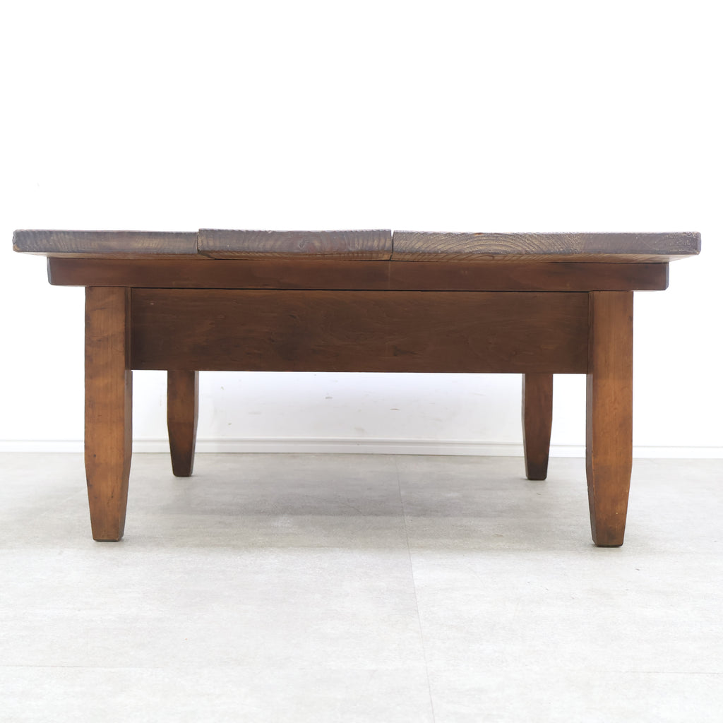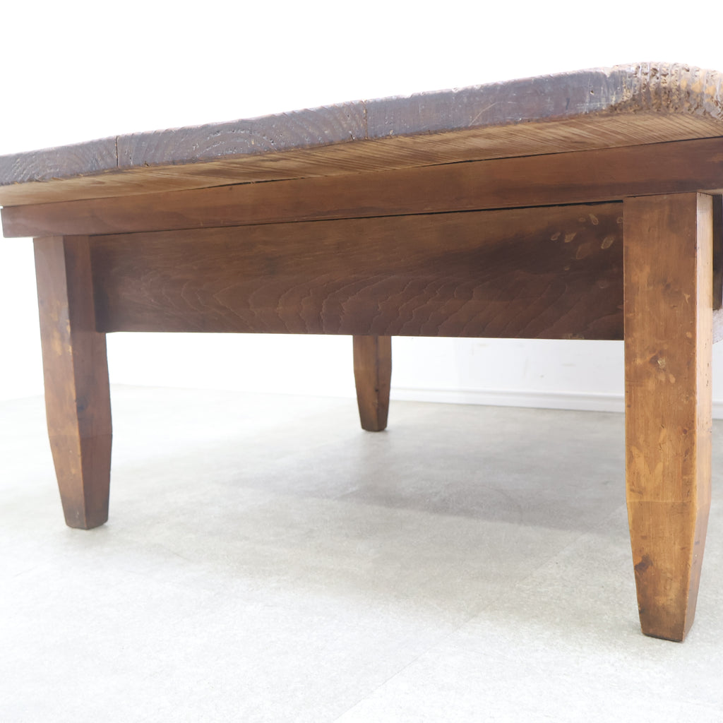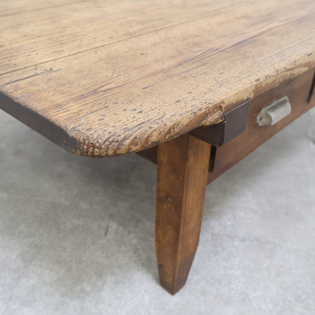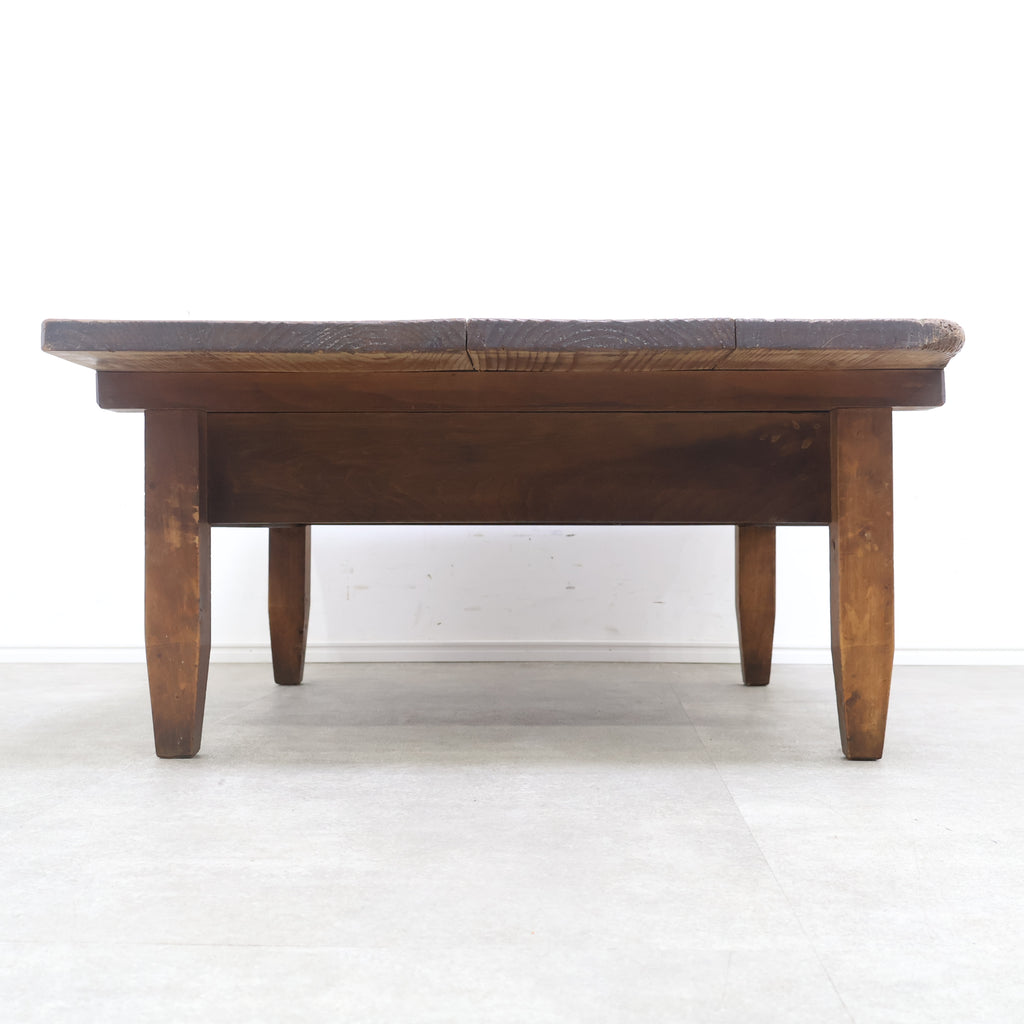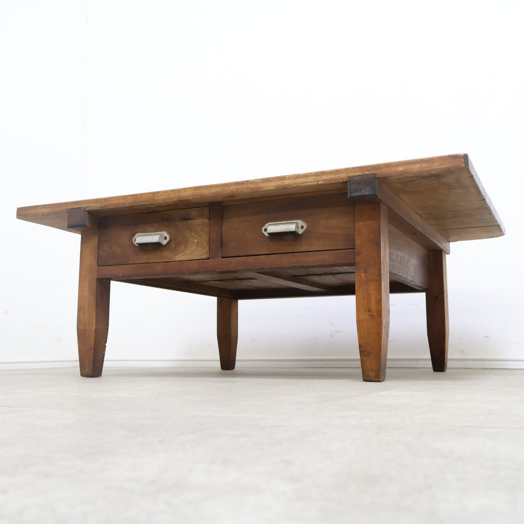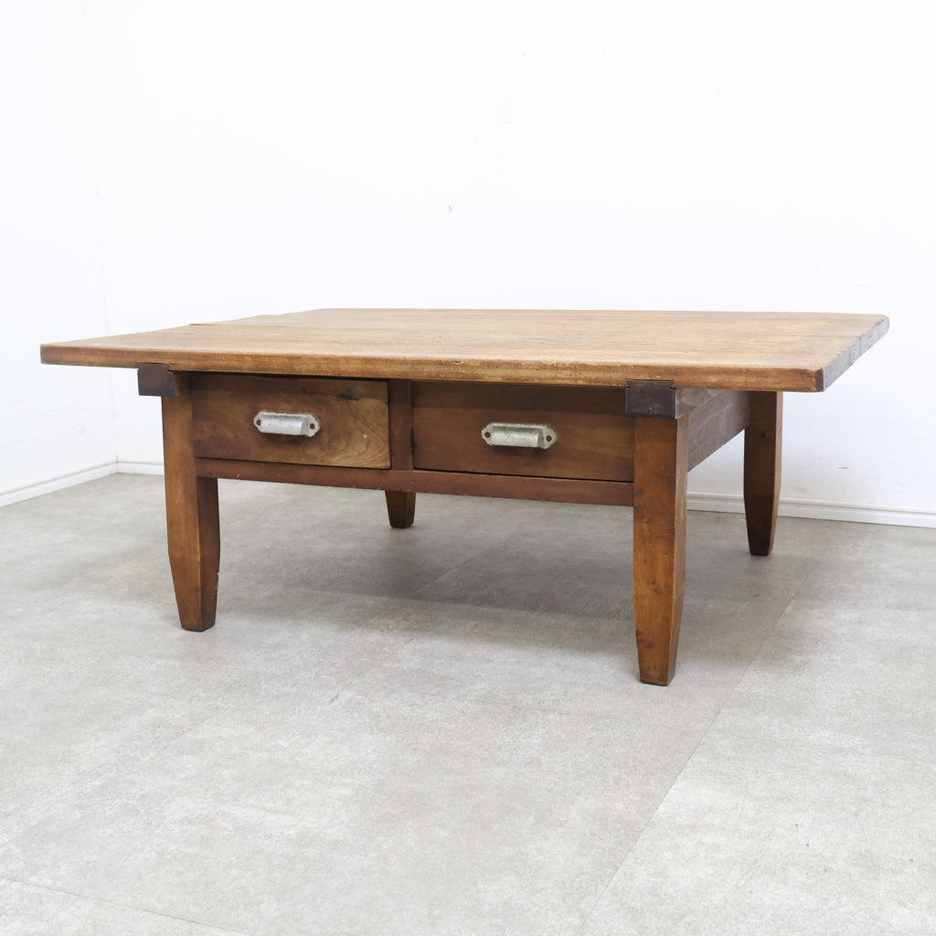 天板には厚みのある無垢材が使用され、長い年月を経た木の風合い、色艶、そして使用による傷や凹みが、唯一無二のヴィンテージな表情を作り出しています。 最大の特徴は、テーブルの対面(両サイド)に引き出しが2杯ずつ、合計4杯の収納を備えている点です。カトラリーや文房具、リモコンなどを整理でき、二人で向かい合って座っても便利に使える実用性の高い設計です。