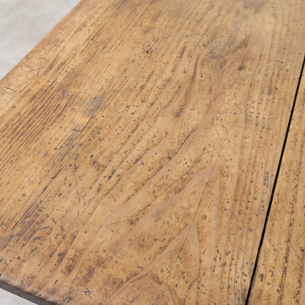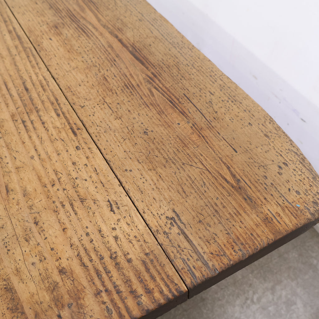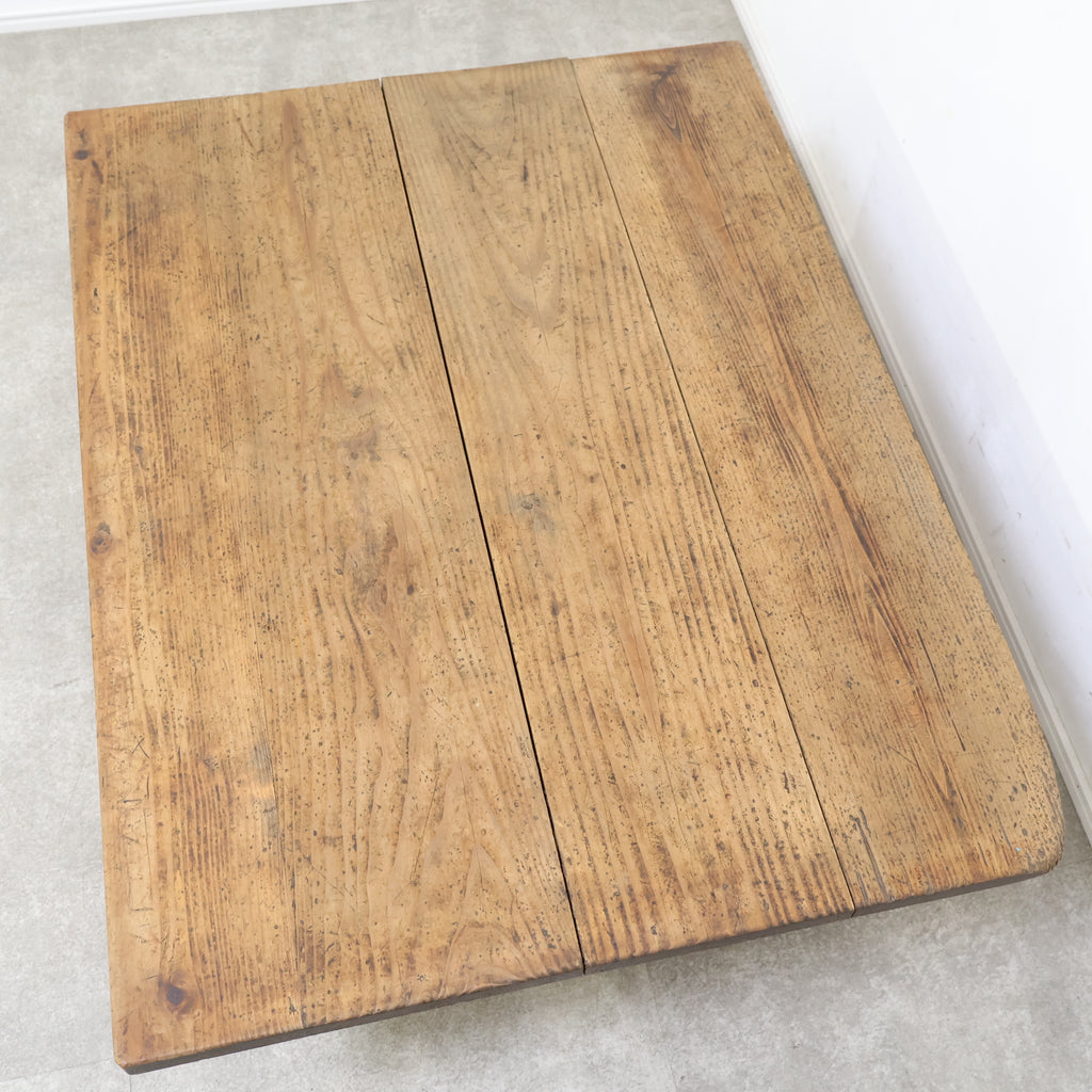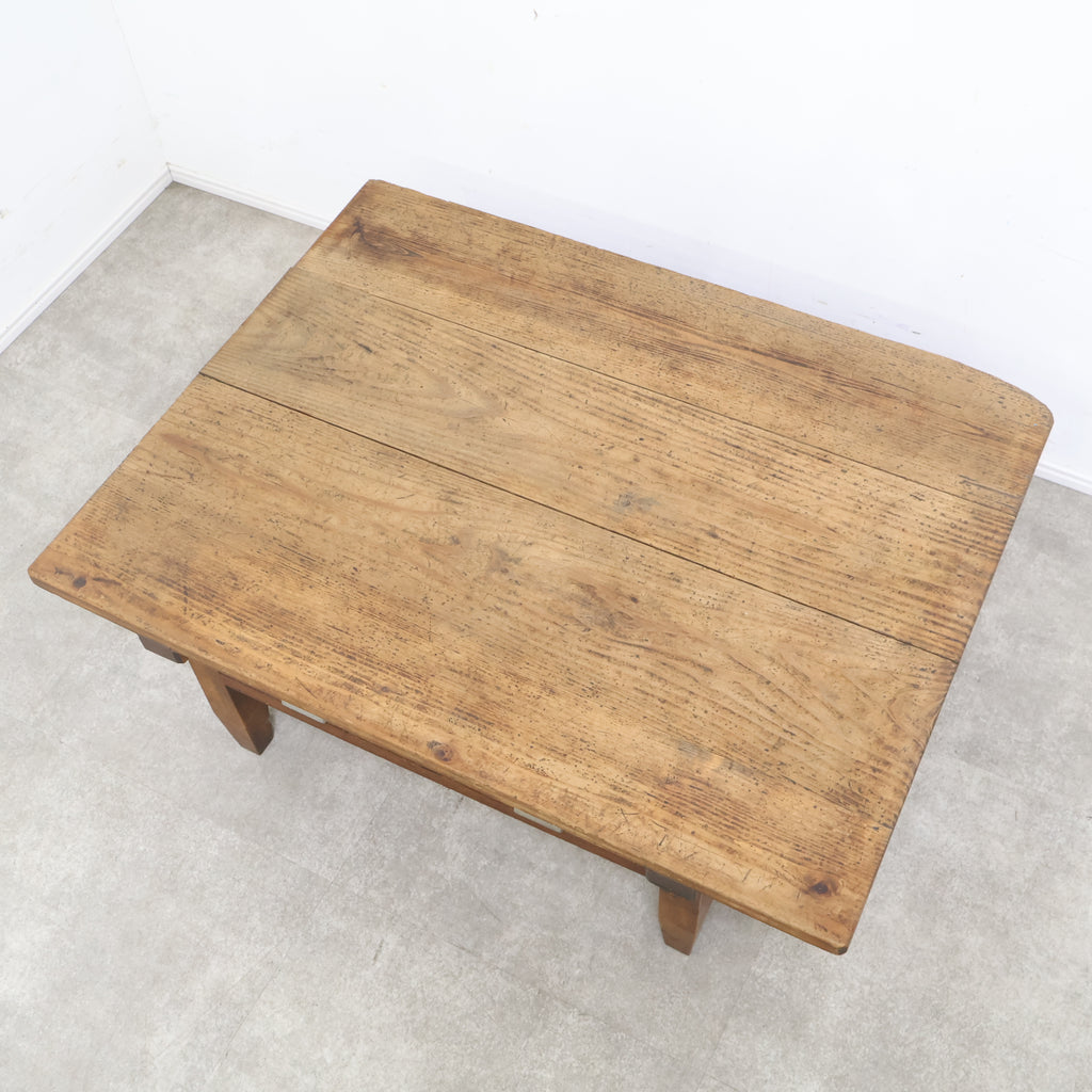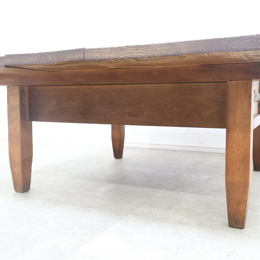天板には厚みのある無垢材が使用され、長い年月を経た木の風合い、色艶、そして使用による傷や凹みが、唯一無二のヴィンテージな表情を作り出しています。 最大の特徴は、テーブルの対面(両サイド)に引き出しが2杯ずつ、合計4杯の収納を備えている点です。カトラリーや文房具、リモコンなどを整理でき、二人で向かい合って座っても便利に使える実用性の高い設計です。