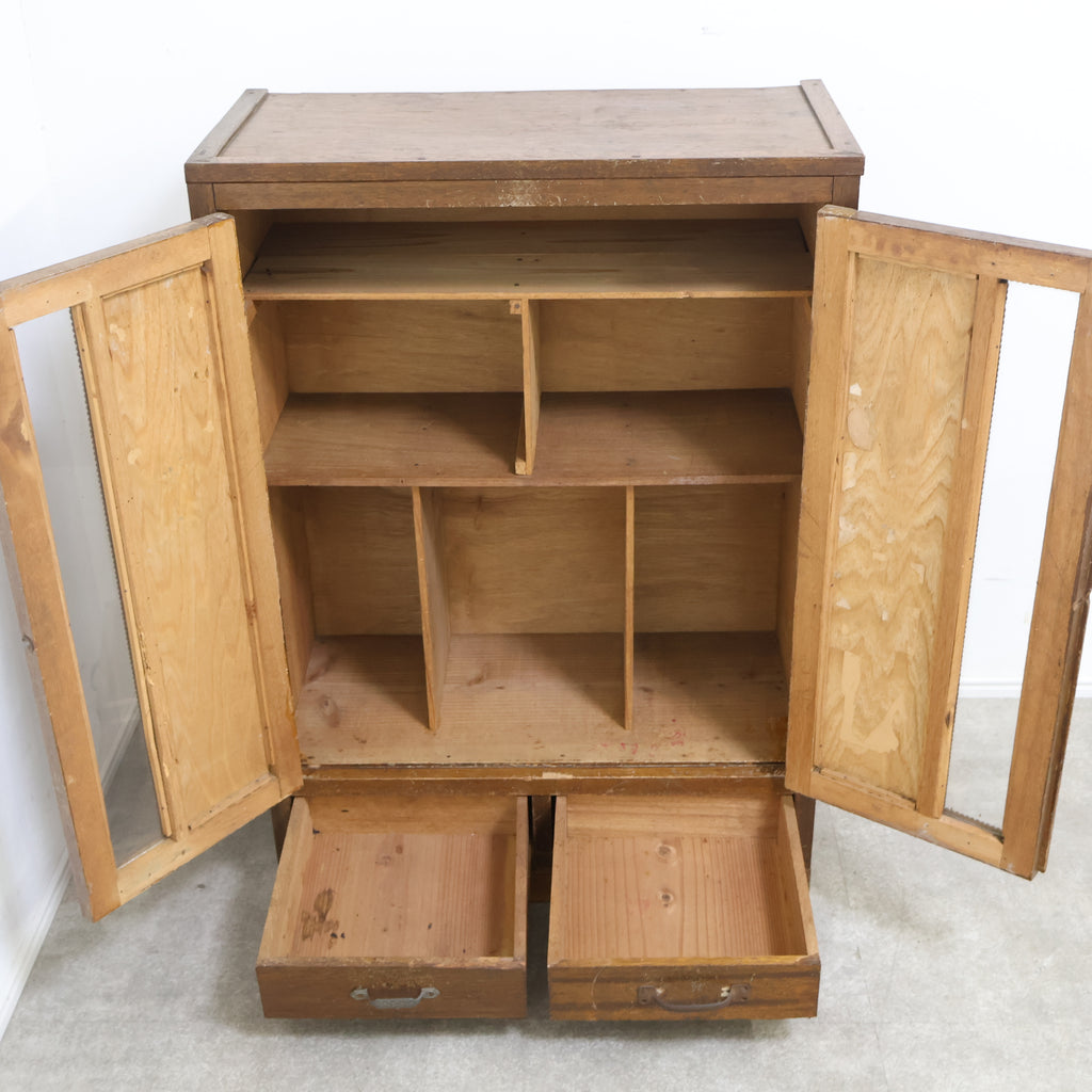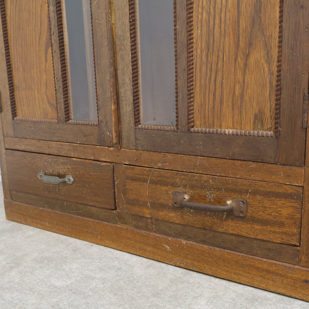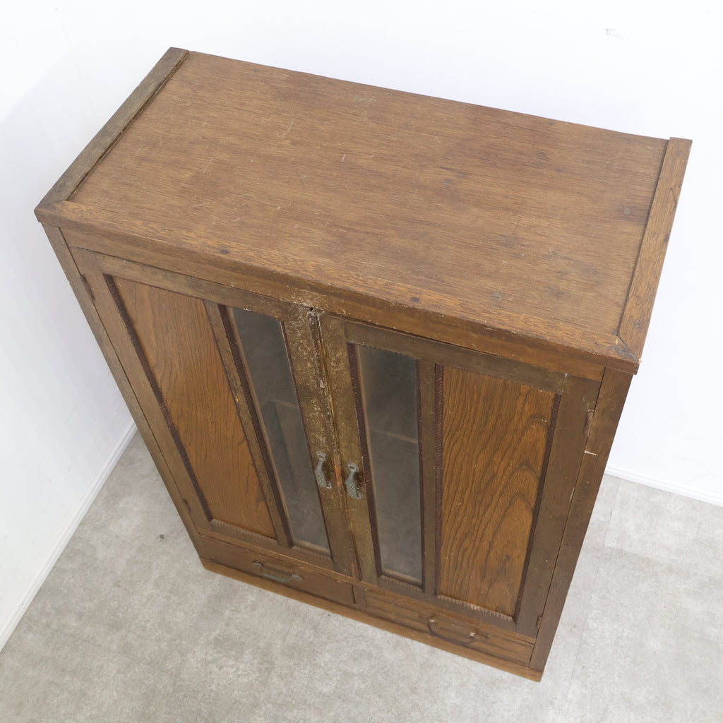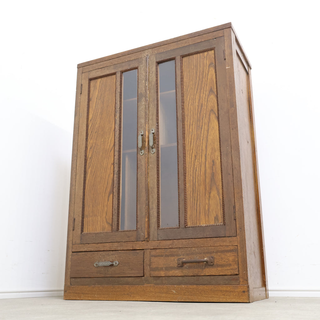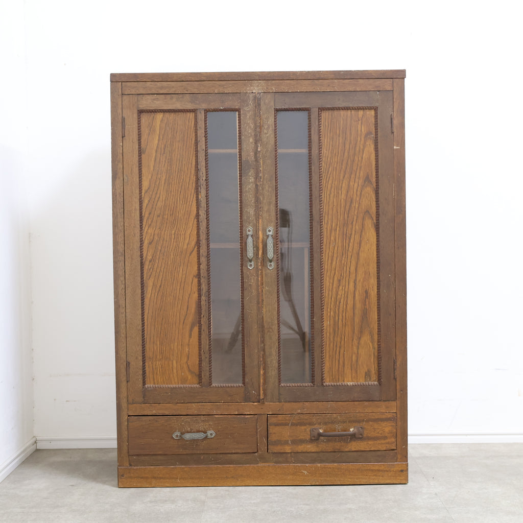 横幅96.5cm、奥行34cmという圧迫感のないサイズ感が魅力。深みのある木目と経年による味わいが、落ち着いた雰囲気を醸し出しています。 上段はガラス扉の棚収納で、食器や本、コレクションを飾る飾り棚として最適です。下段には便利な引き出しが2杯あり、小物や書類の整理に役立ちます。 シンプルなデザインながら、扉や引き出し周りの木枠の作り込み、素朴な金具が古家具としての趣を深めます。