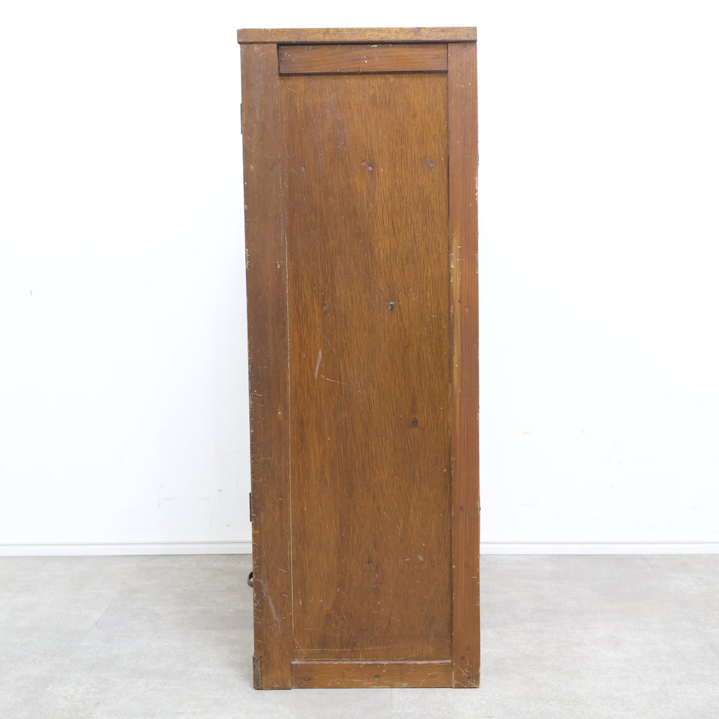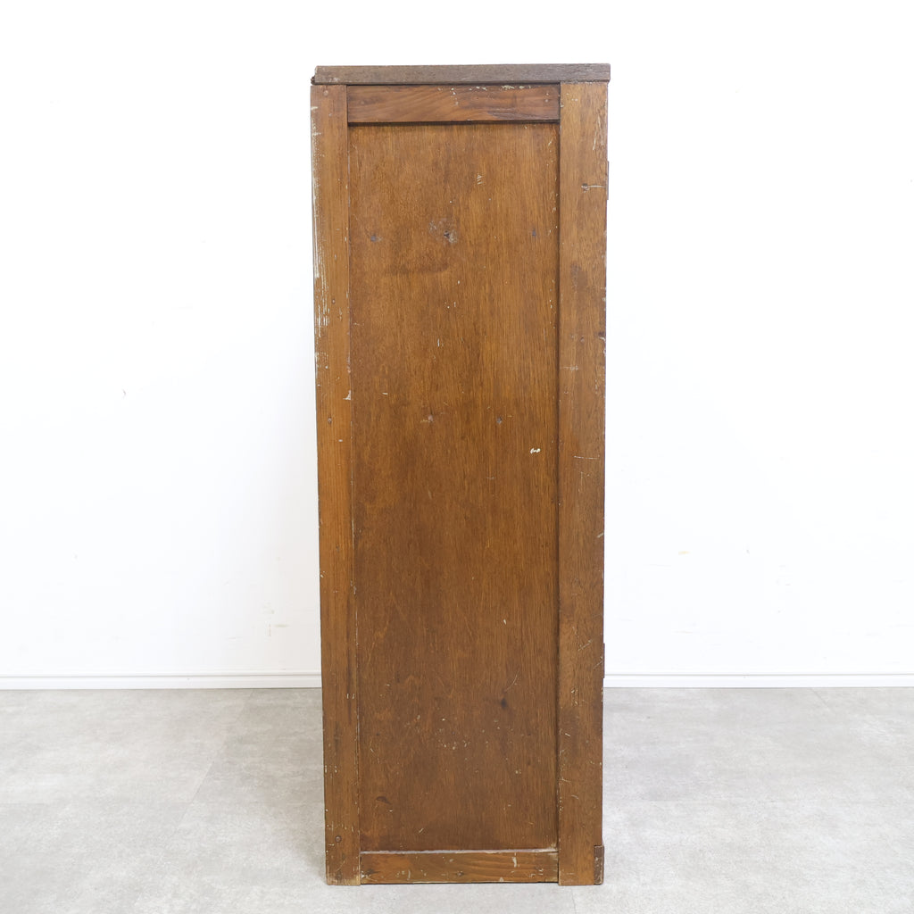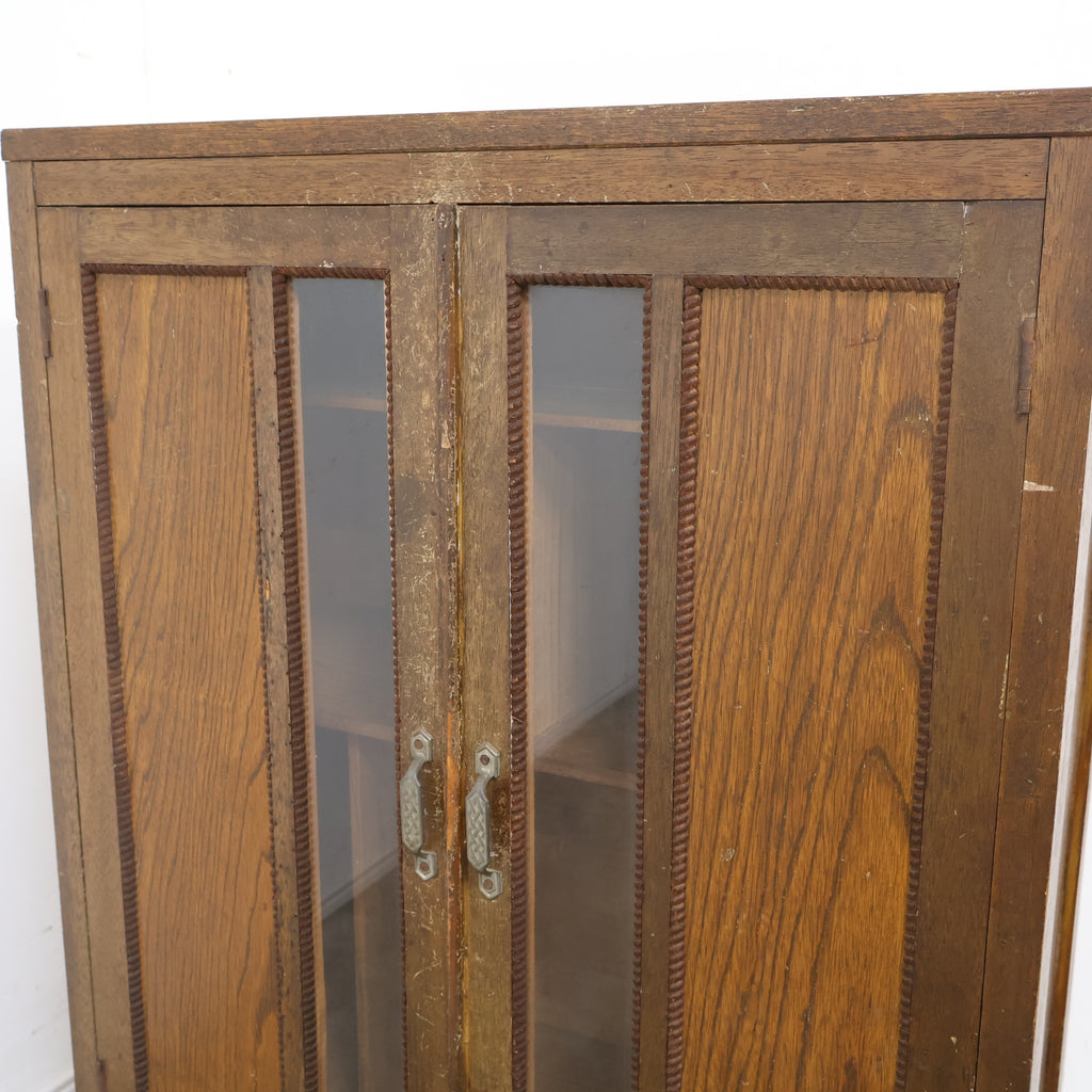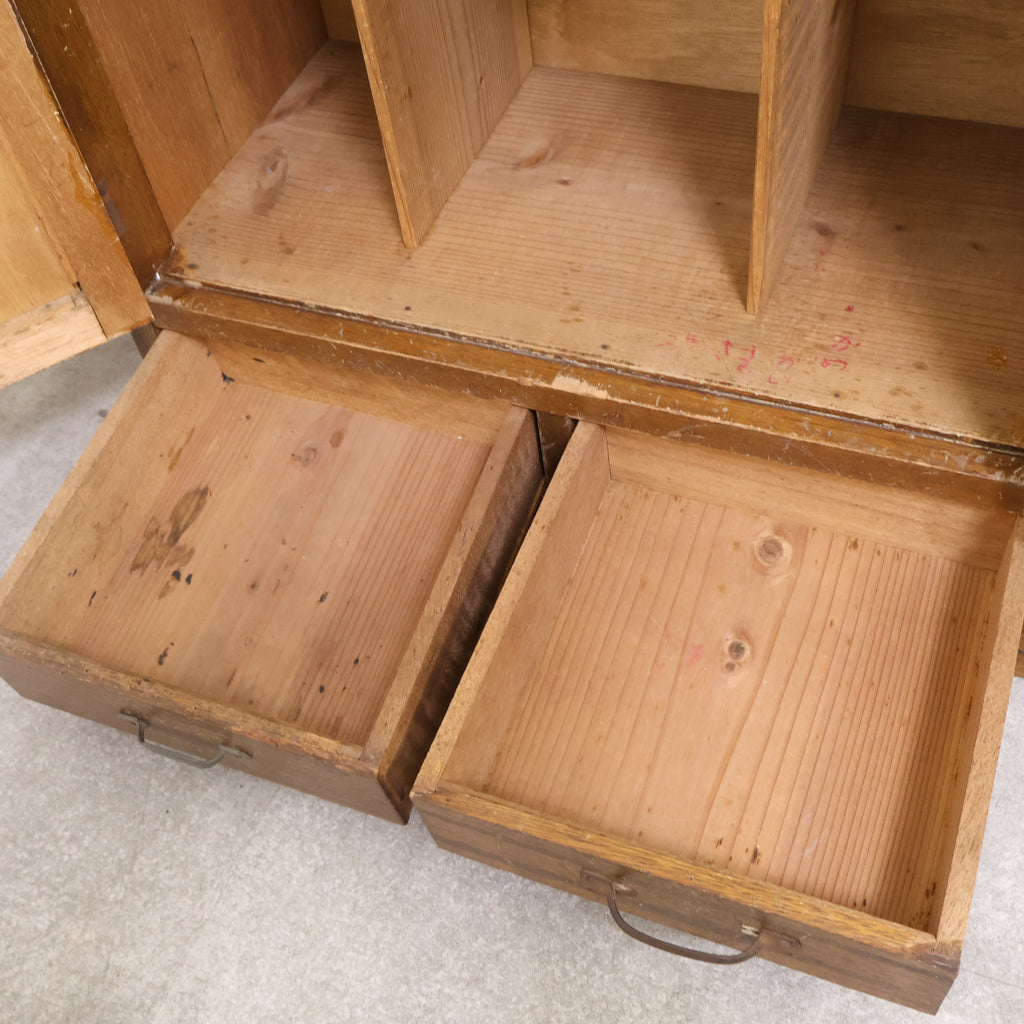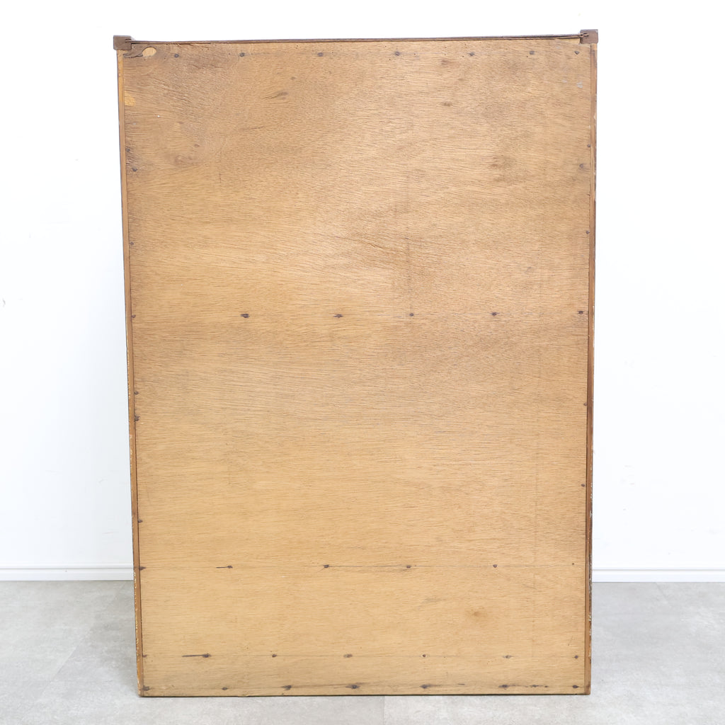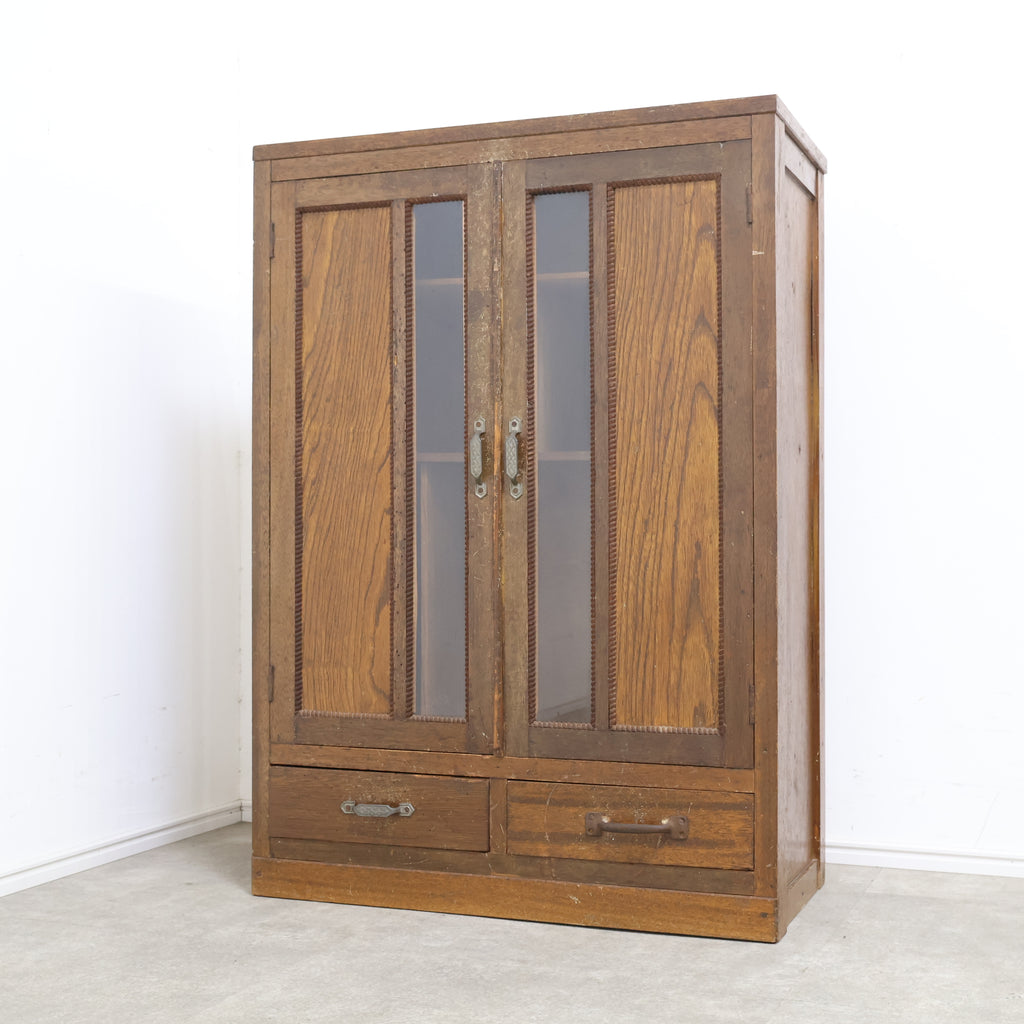 横幅96.5cm、奥行34cmという圧迫感のないサイズ感が魅力。深みのある木目と経年による味わいが、落ち着いた雰囲気を醸し出しています。 上段はガラス扉の棚収納で、食器や本、コレクションを飾る飾り棚として最適です。下段には便利な引き出しが2杯あり、小物や書類の整理に役立ちます。 シンプルなデザインながら、扉や引き出し周りの木枠の作り込み、素朴な金具が古家具としての趣を深めます。