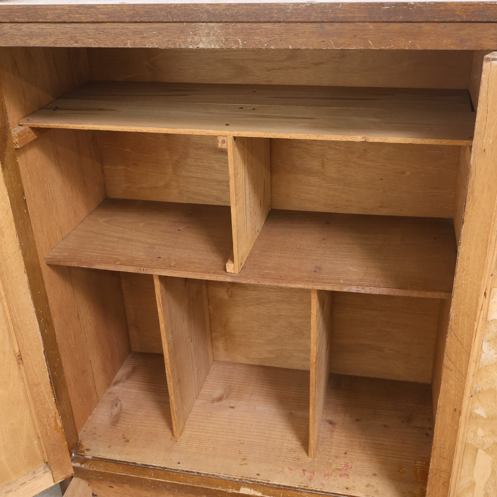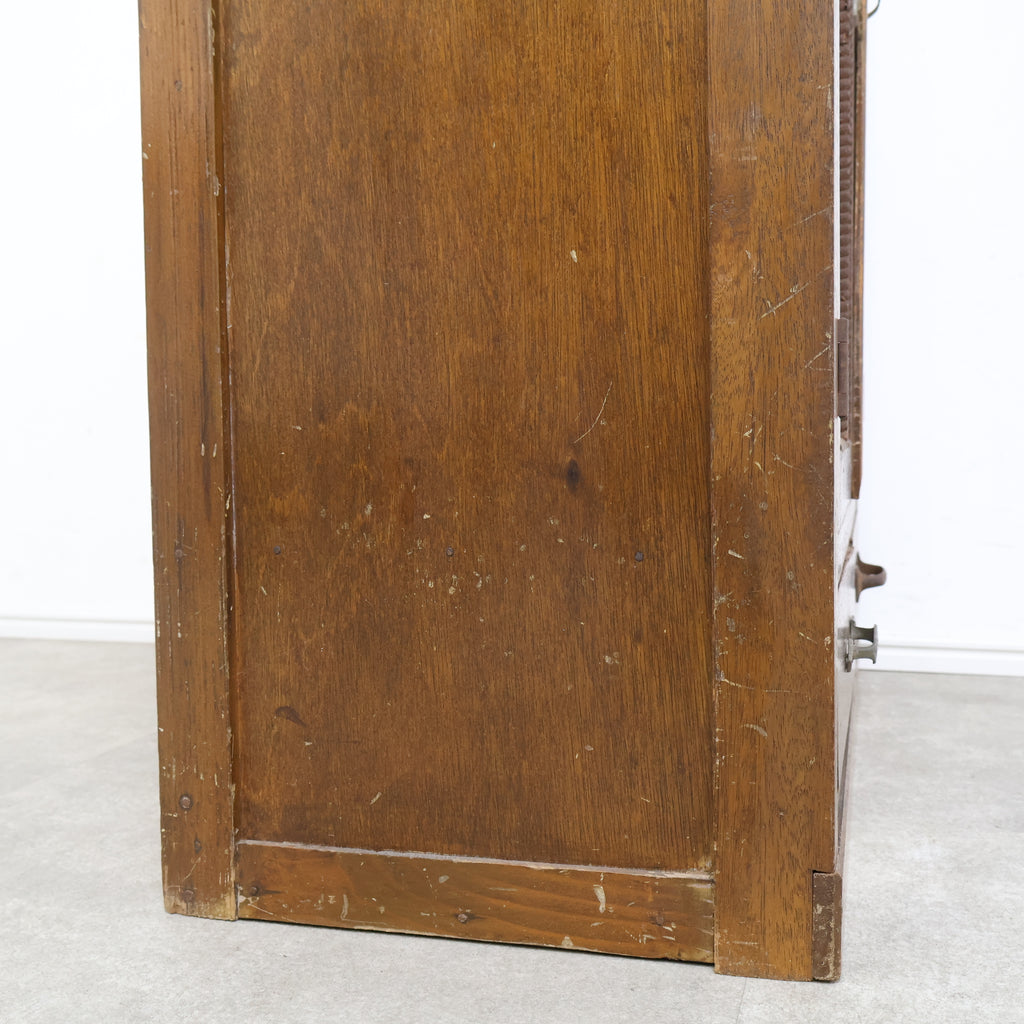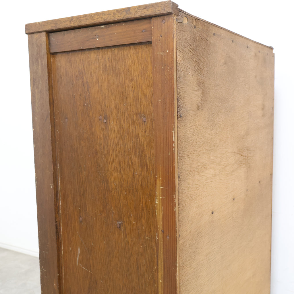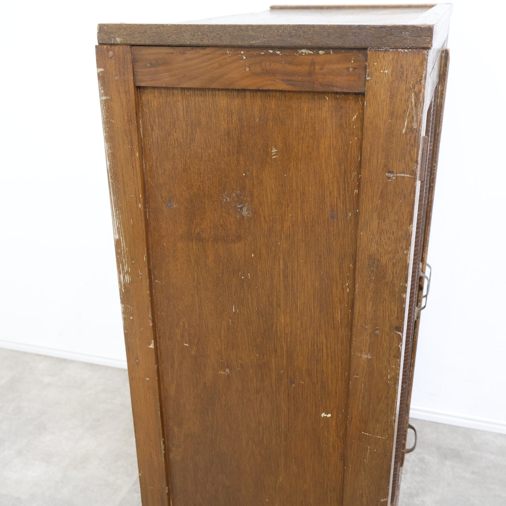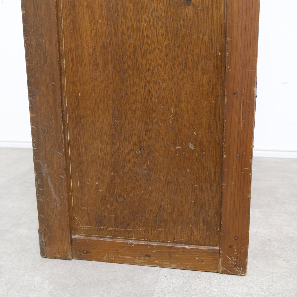 横幅96.5cm、奥行34cmという圧迫感のないサイズ感が魅力。深みのある木目と経年による味わいが、落ち着いた雰囲気を醸し出しています。 上段はガラス扉の棚収納で、食器や本、コレクションを飾る飾り棚として最適です。下段には便利な引き出しが2杯あり、小物や書類の整理に役立ちます。 シンプルなデザインながら、扉や引き出し周りの木枠の作り込み、素朴な金具が古家具としての趣を深めます。