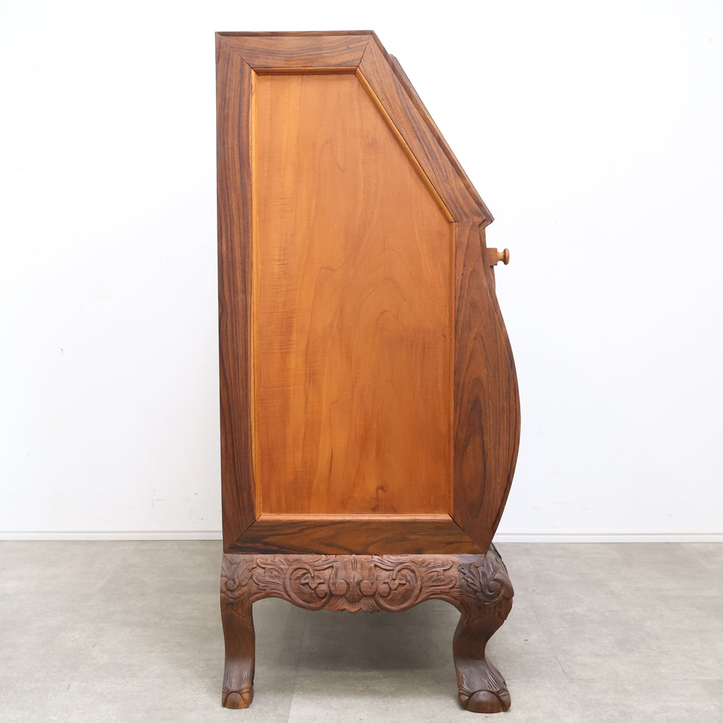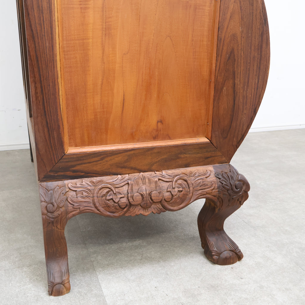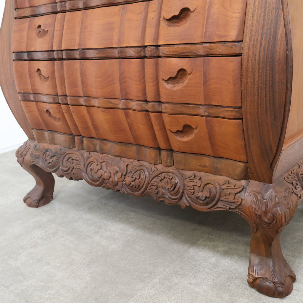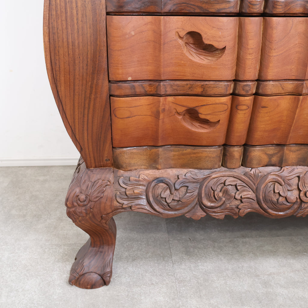正面の曲面を描く引き出し、そして足元の力強い獣脚(クローフット/猫足)の彫刻が、アンティーク家具ならではの重厚な風格を醸し出します。