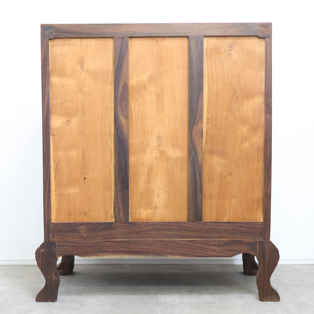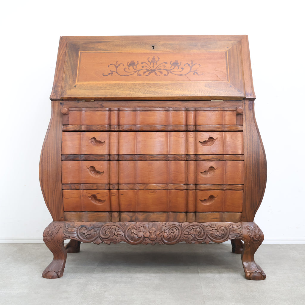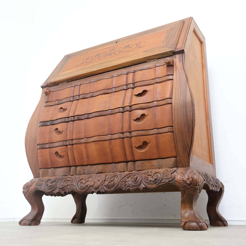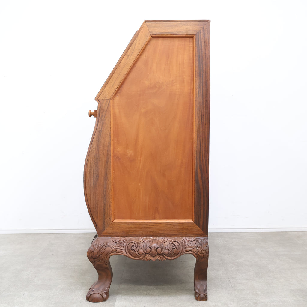 正面の曲面を描く引き出し、そして足元の力強い獣脚(クローフット/猫足)の彫刻が、アンティーク家具ならではの重厚な風格を醸し出します。