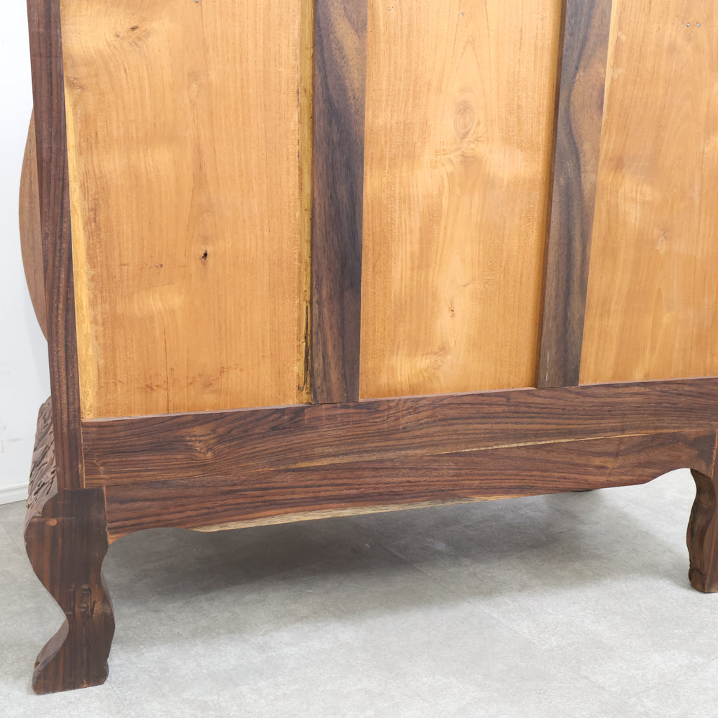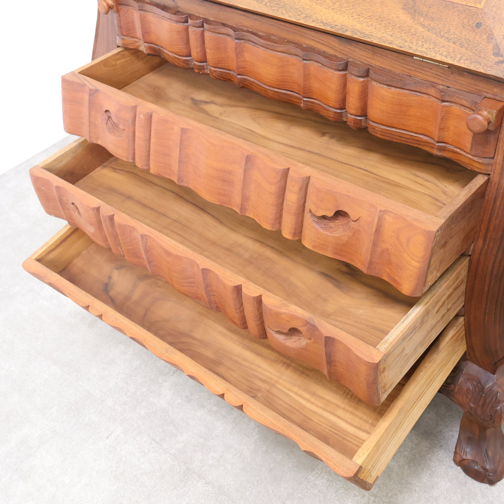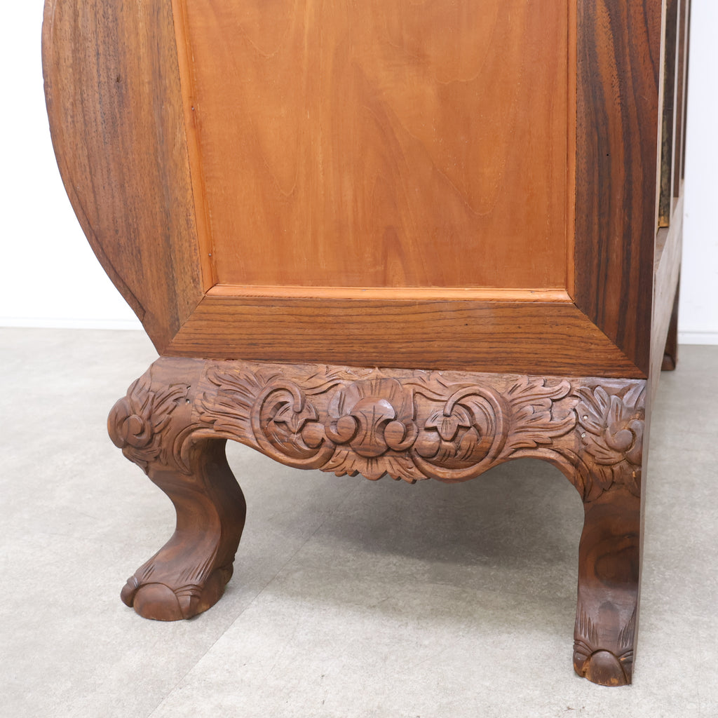 全体に施されたダイナミックな木彫装飾と、特徴的なバルカン様式を思わせる丸みを帯びたデザインが、空間の主役となる逸品です。