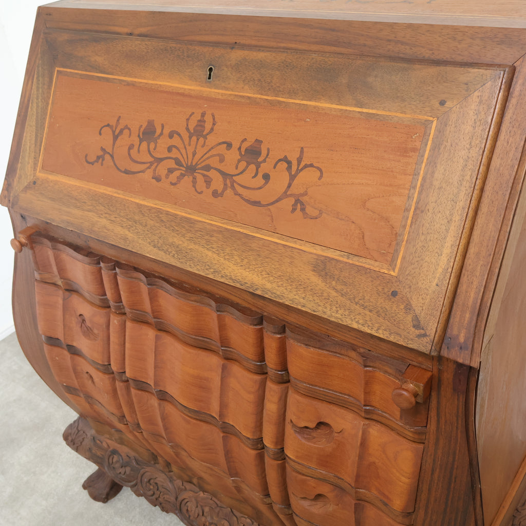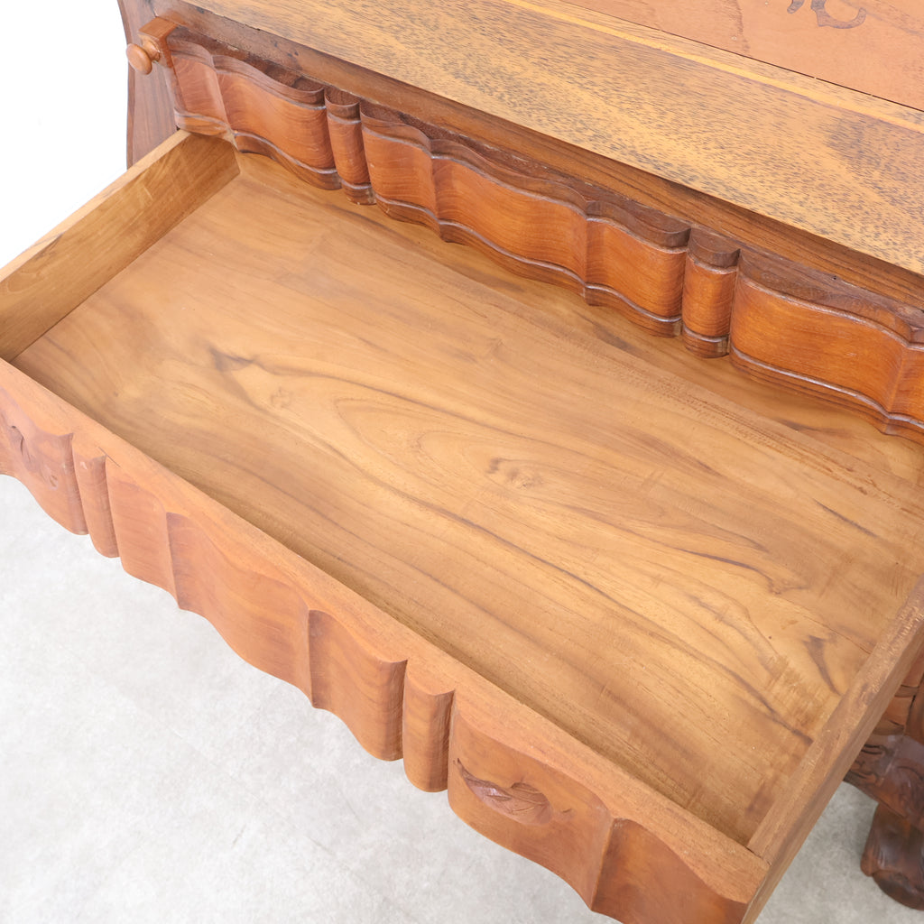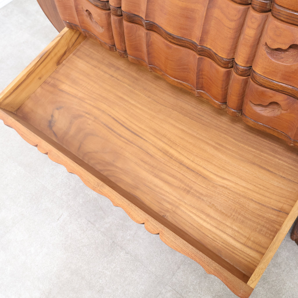 全体に施されたダイナミックな木彫装飾と、特徴的なバルカン様式を思わせる丸みを帯びたデザインが、空間の主役となる逸品です。