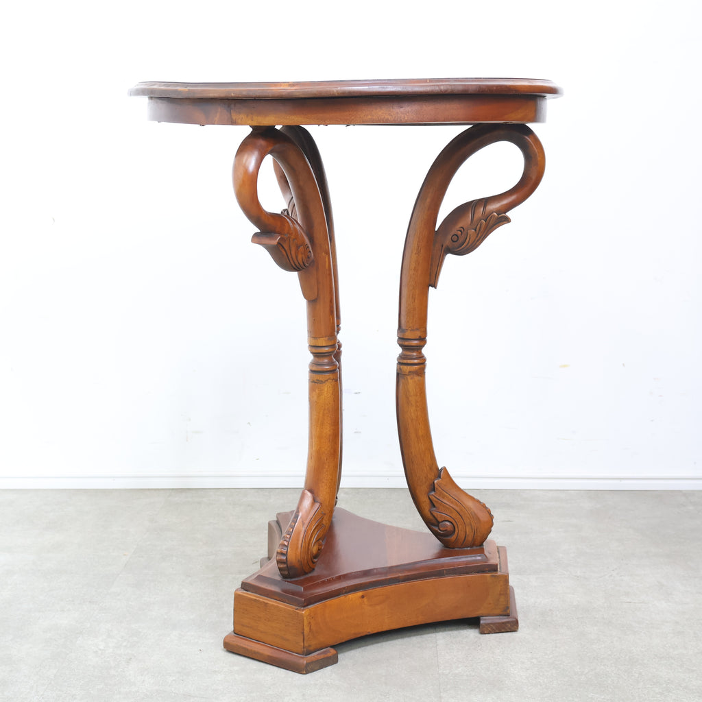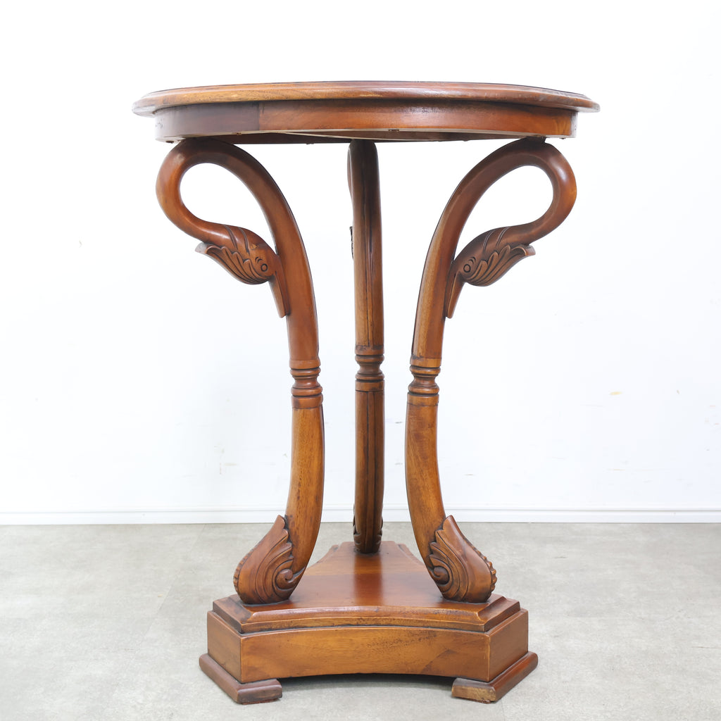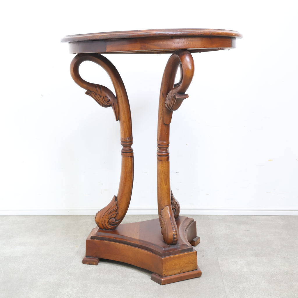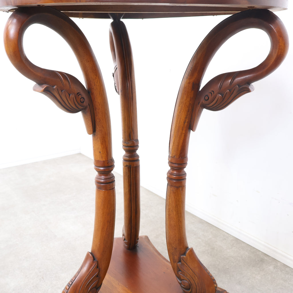最大の特徴は、脚部に施された**スワン(白鳥)**を思わせる、見事な木彫り装飾です。優美なカーブを描く二本の脚が、このテーブルに比類ない芸術的な価値を与えています。