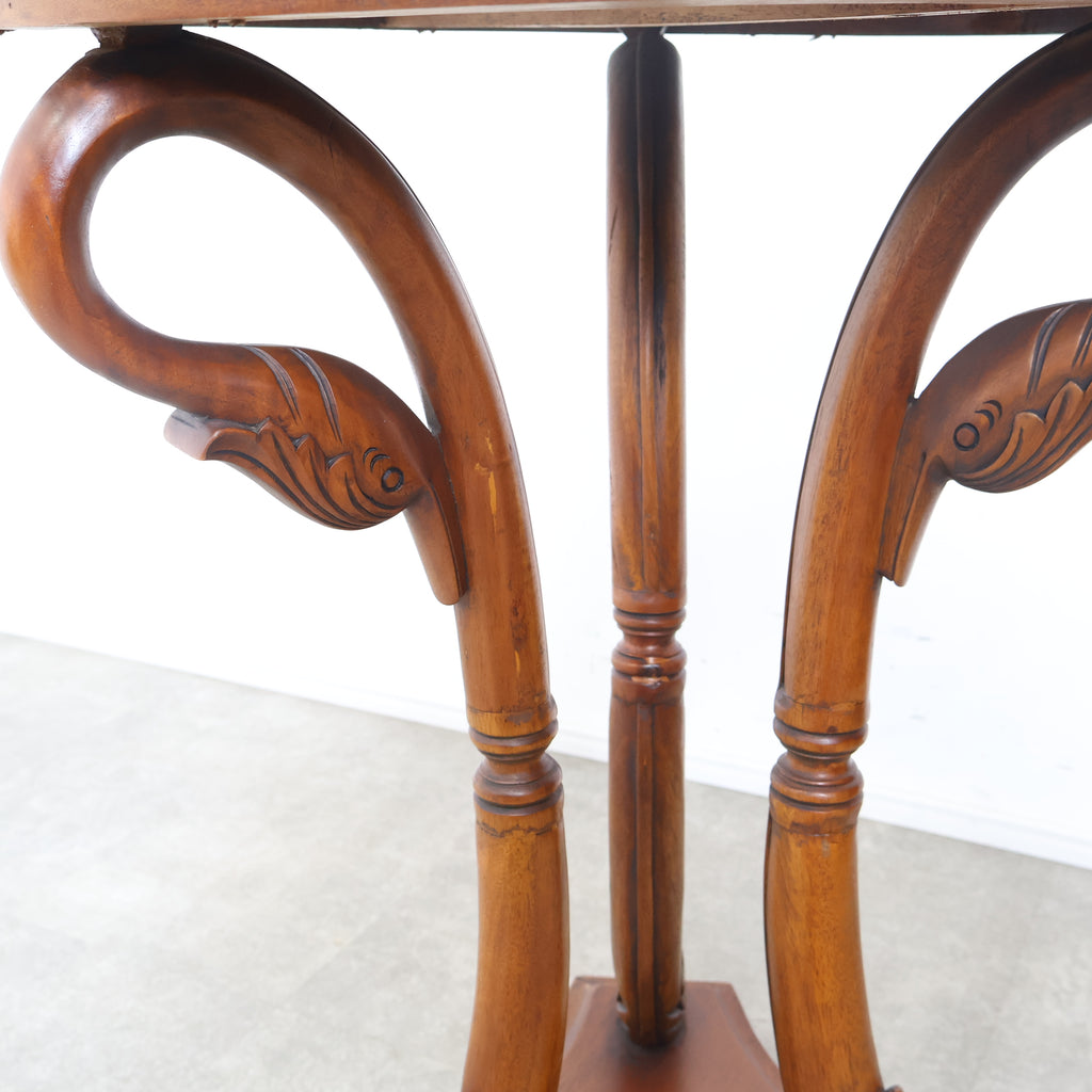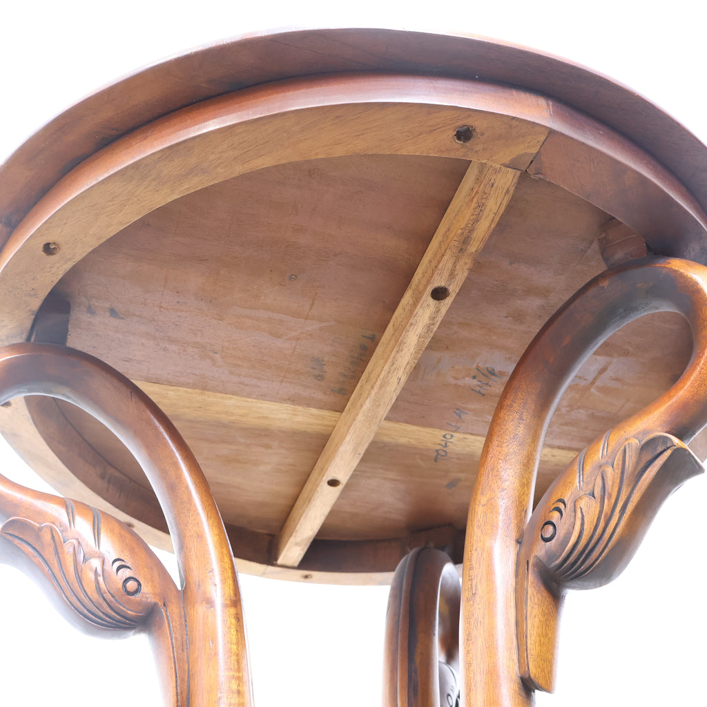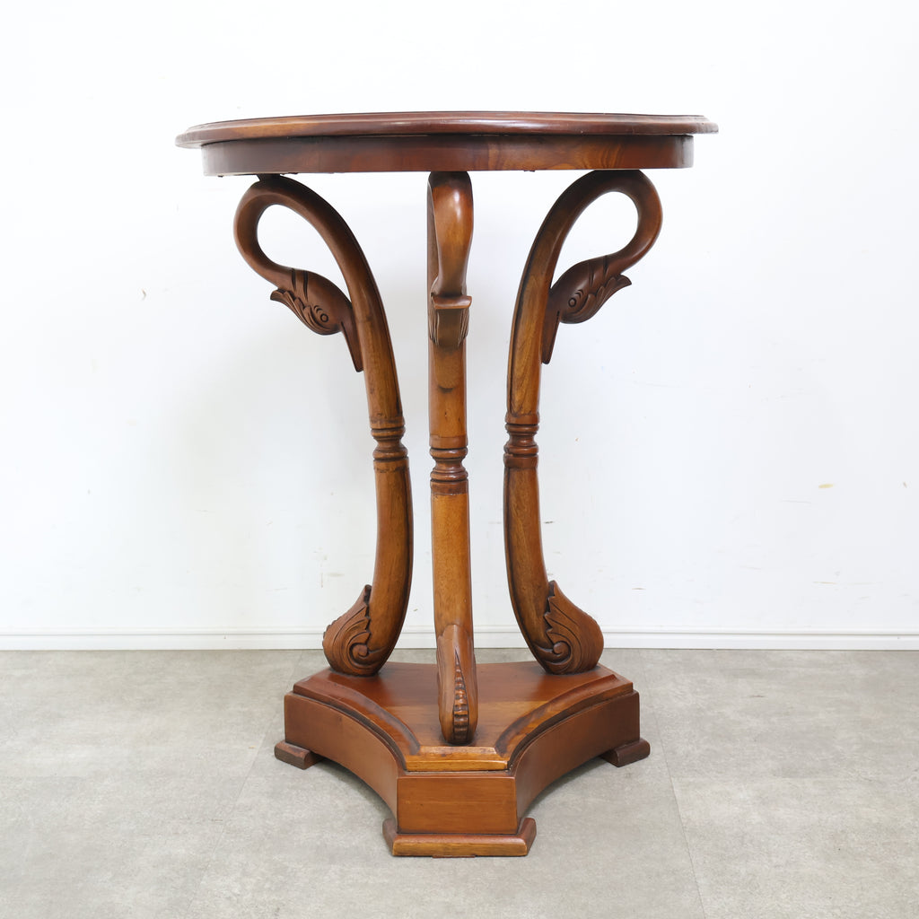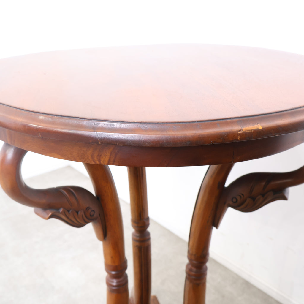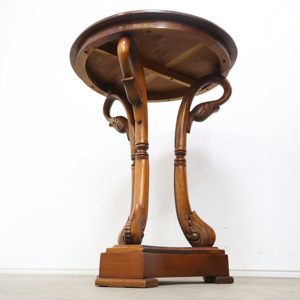 最大の特徴は、脚部に施された**スワン(白鳥)**を思わせる、見事な木彫り装飾です。優美なカーブを描く二本の脚が、このテーブルに比類ない芸術的な価値を与えています。