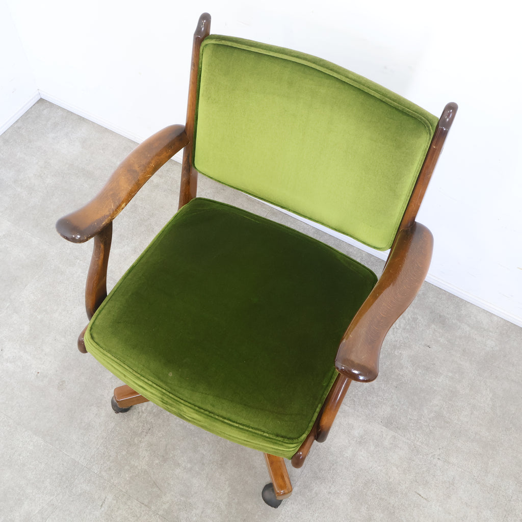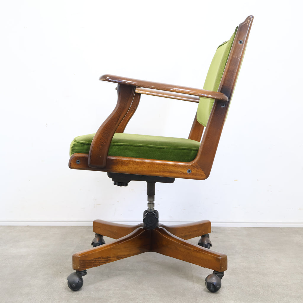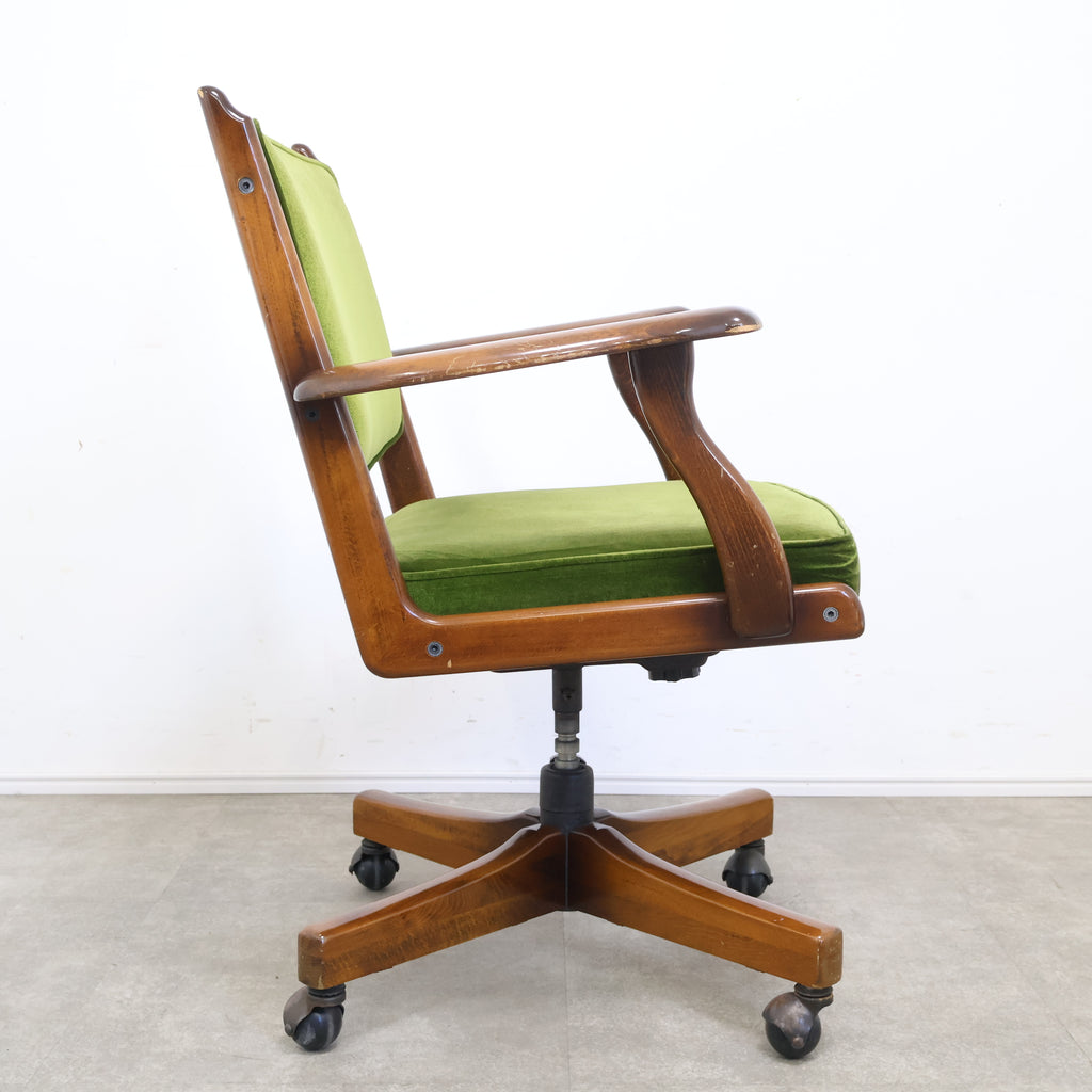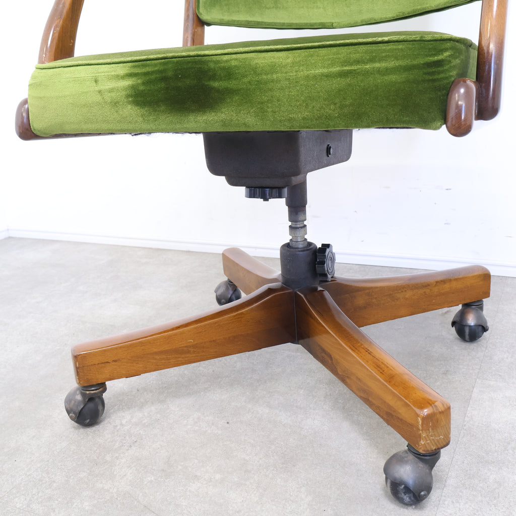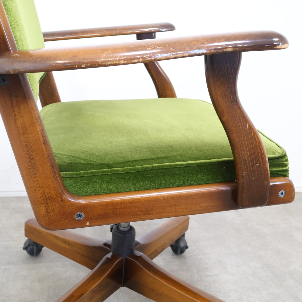 美しい曲線を描く木製フレームに、鮮やかなグリーンのベロア生地が張られた、非常に意匠性の高い一脚です。ベロアの光沢と、落ち着いた木部のコントラストが、レトロでありながらモダンな印象を与えます。 土台は安定感のある木製5本脚で、キャスター付きのため移動もスムーズ。機能的な回転・昇降機能(動作確認必須)も備えており、実用性も兼ね備えた設計です。
