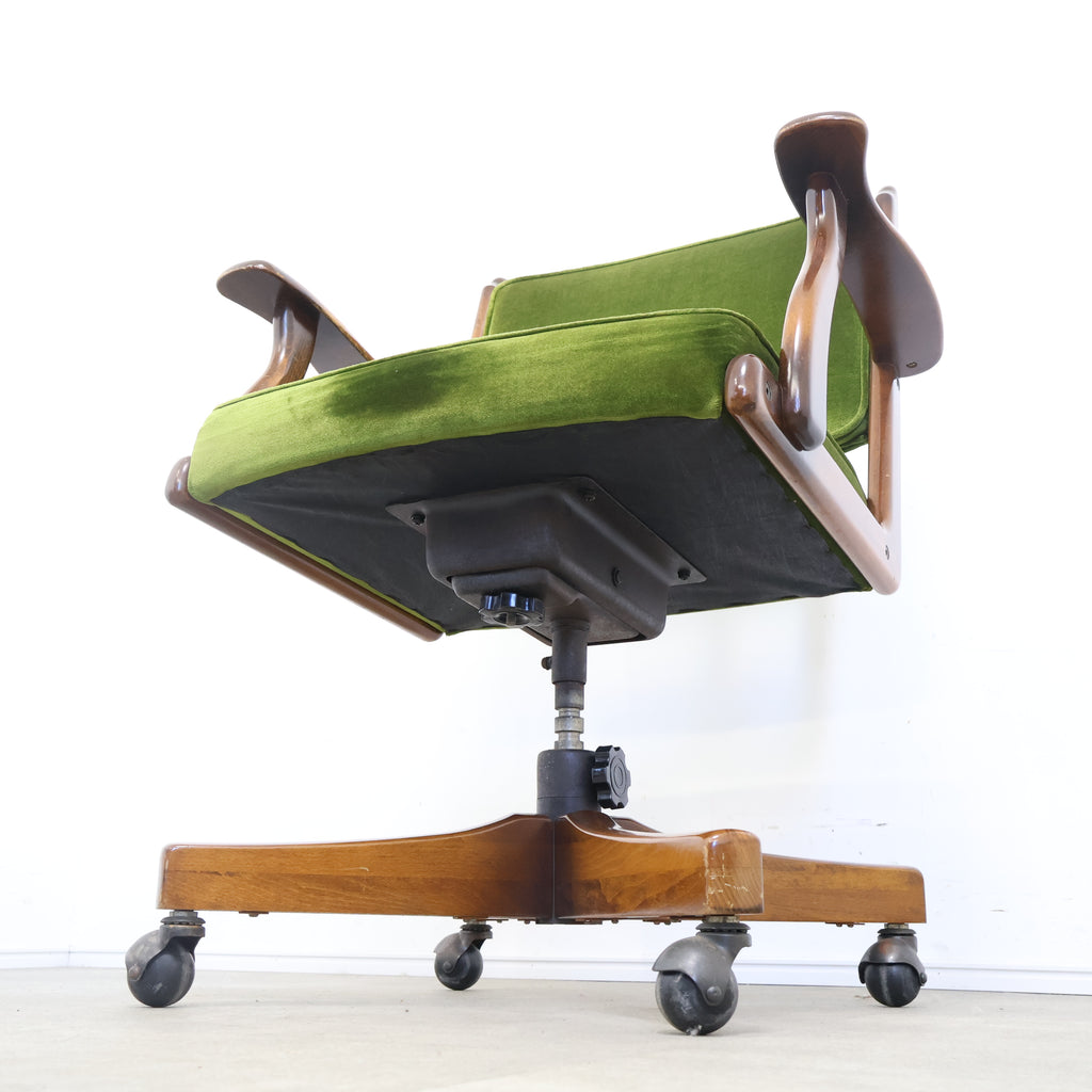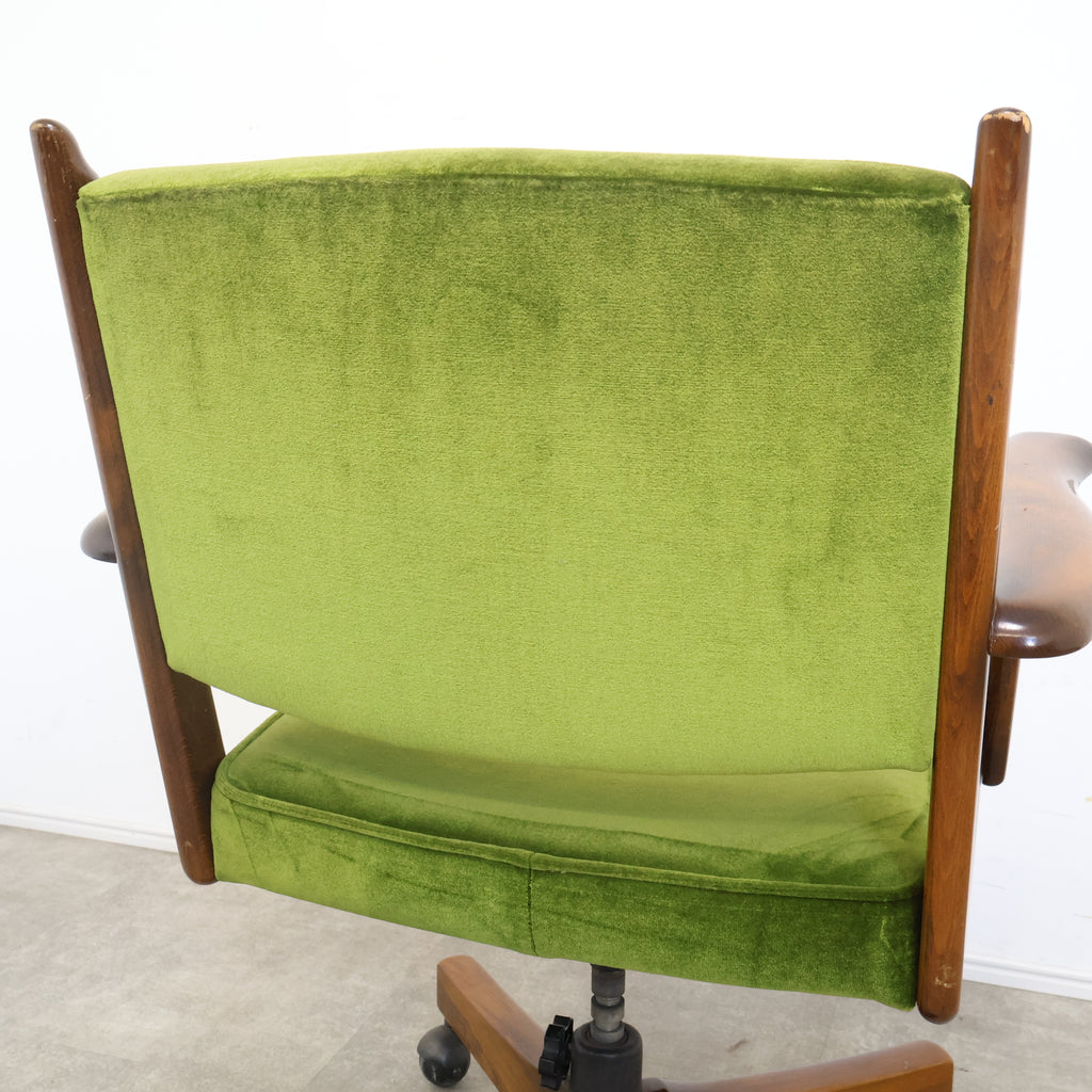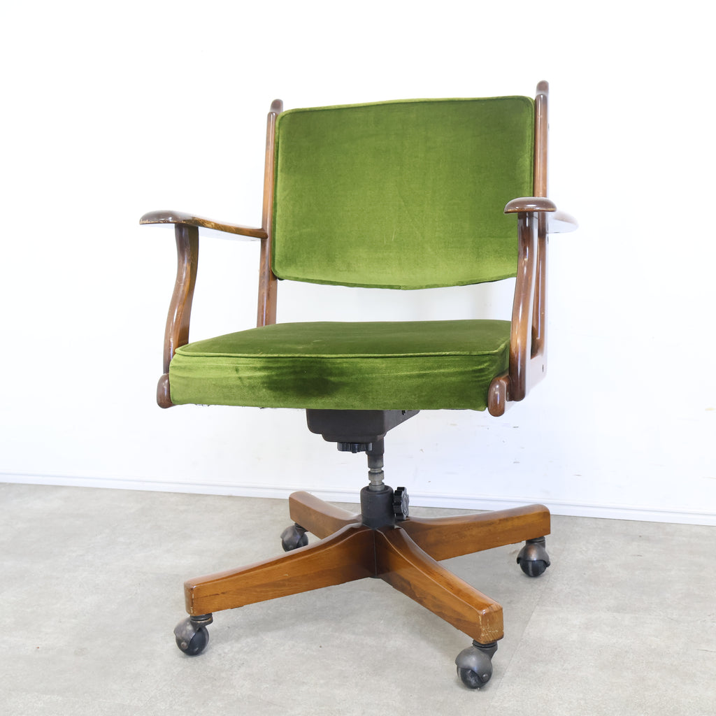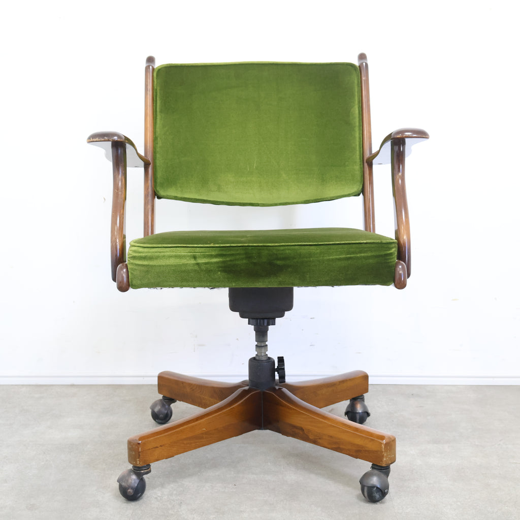 美しい曲線を描く木製フレームに、鮮やかなグリーンのベロア生地が張られた、非常に意匠性の高い一脚です。ベロアの光沢と、落ち着いた木部のコントラストが、レトロでありながらモダンな印象を与えます。 土台は安定感のある木製5本脚で、キャスター付きのため移動もスムーズ。機能的な回転・昇降機能(動作確認必須)も備えており、実用性も兼ね備えた設計です。