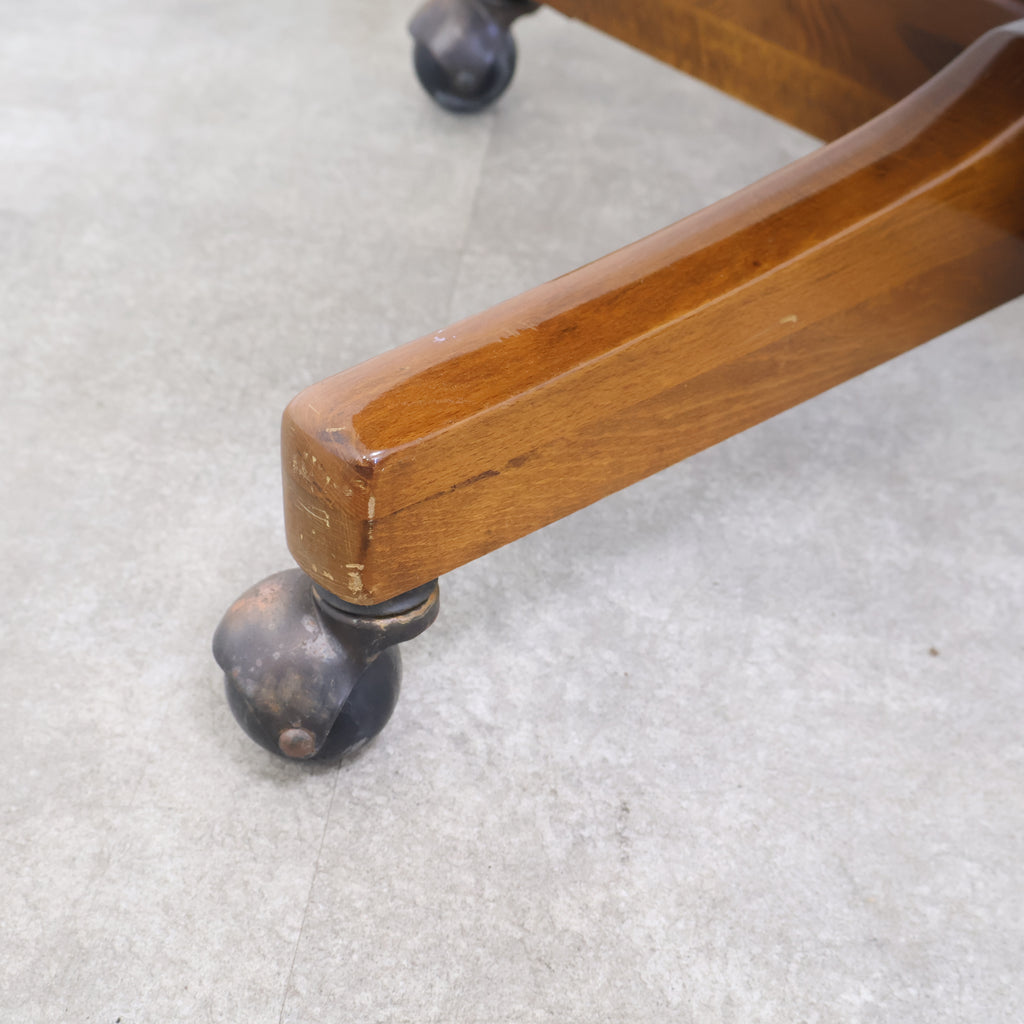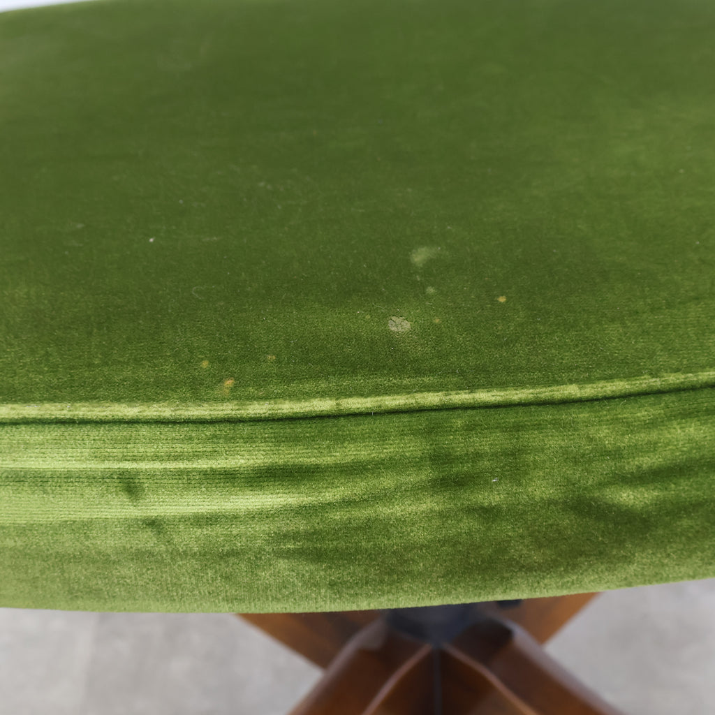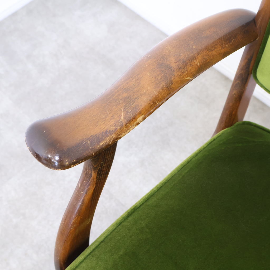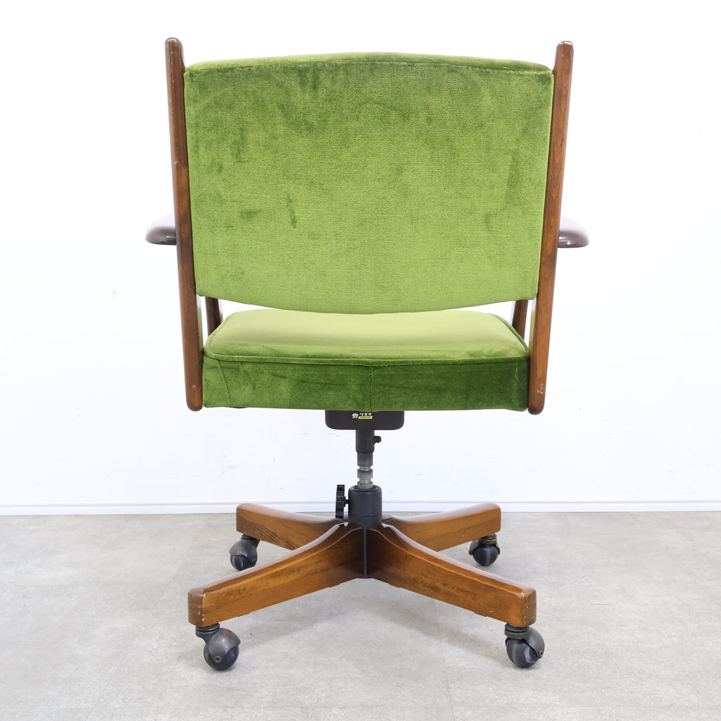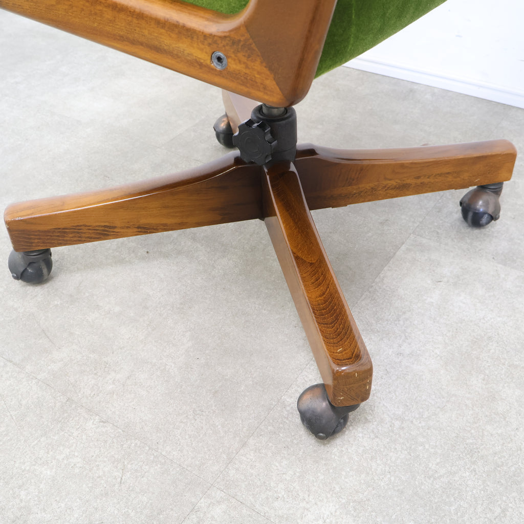 美しい曲線を描く木製フレームに、鮮やかなグリーンのベロア生地が張られた、非常に意匠性の高い一脚です。ベロアの光沢と、落ち着いた木部のコントラストが、レトロでありながらモダンな印象を与えます。 土台は安定感のある木製5本脚で、キャスター付きのため移動もスムーズ。機能的な回転・昇降機能(動作確認必須)も備えており、実用性も兼ね備えた設計です。