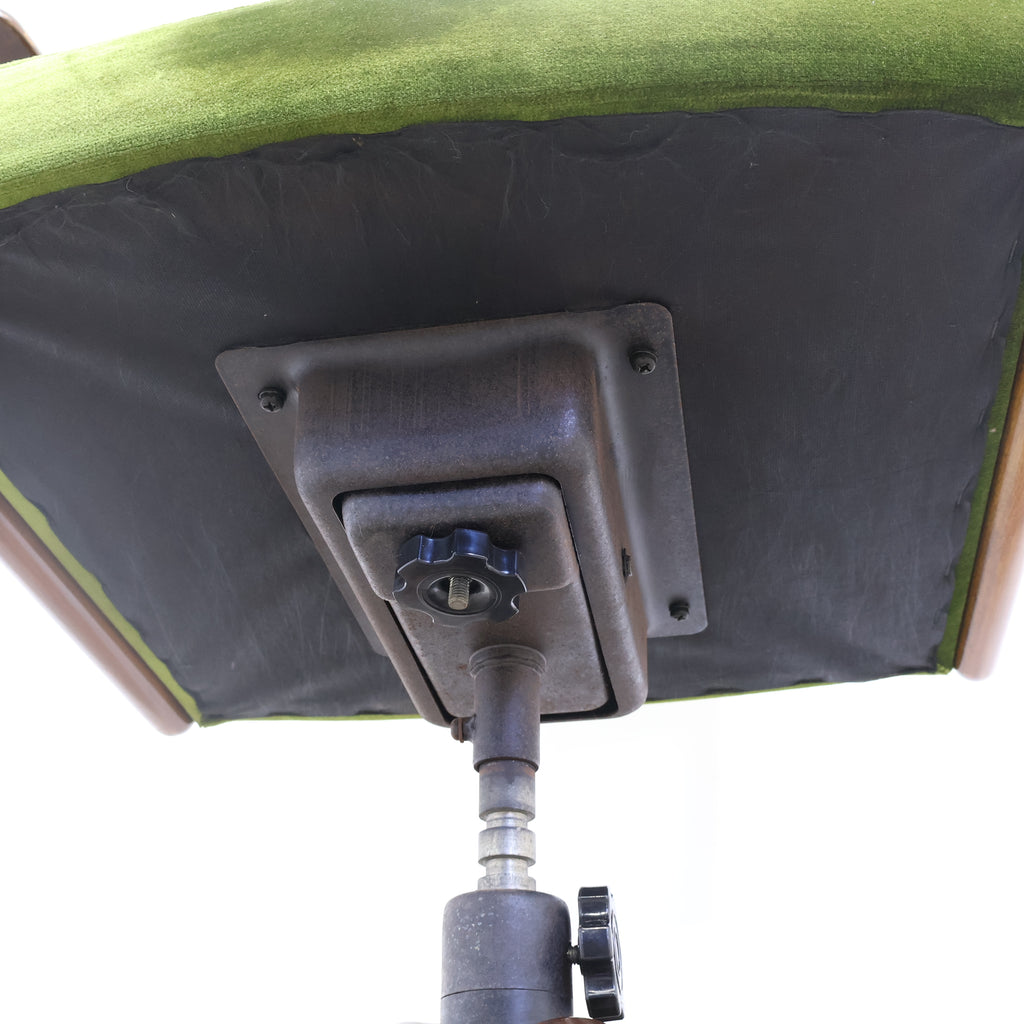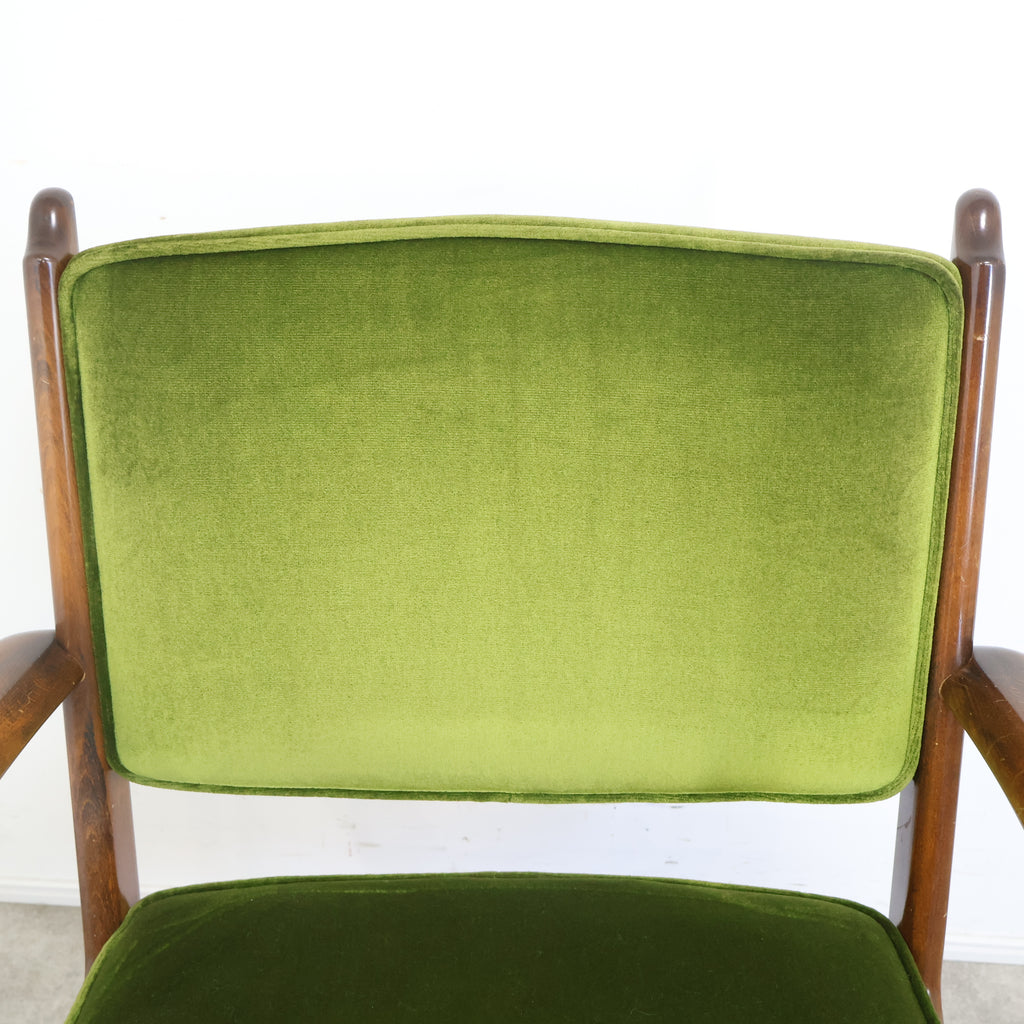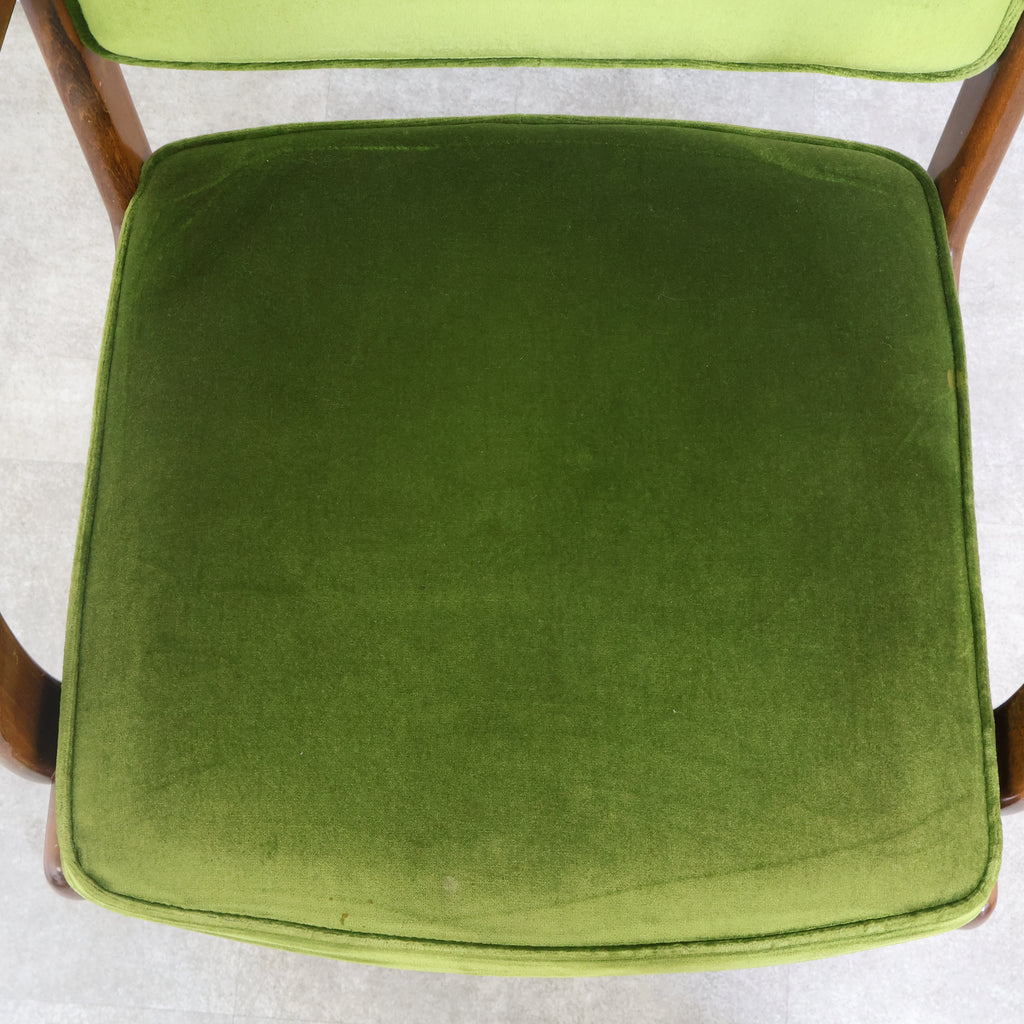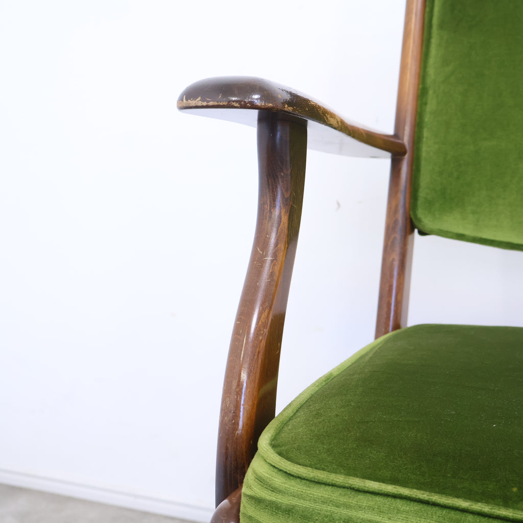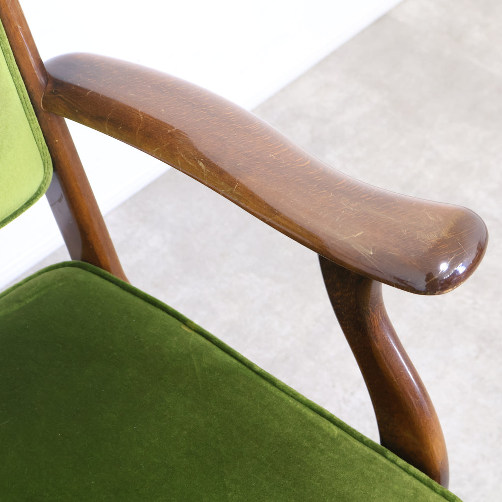 美しい曲線を描く木製フレームに、鮮やかなグリーンのベロア生地が張られた、非常に意匠性の高い一脚です。ベロアの光沢と、落ち着いた木部のコントラストが、レトロでありながらモダンな印象を与えます。 土台は安定感のある木製5本脚で、キャスター付きのため移動もスムーズ。機能的な回転・昇降機能(動作確認必須)も備えており、実用性も兼ね備えた設計です。