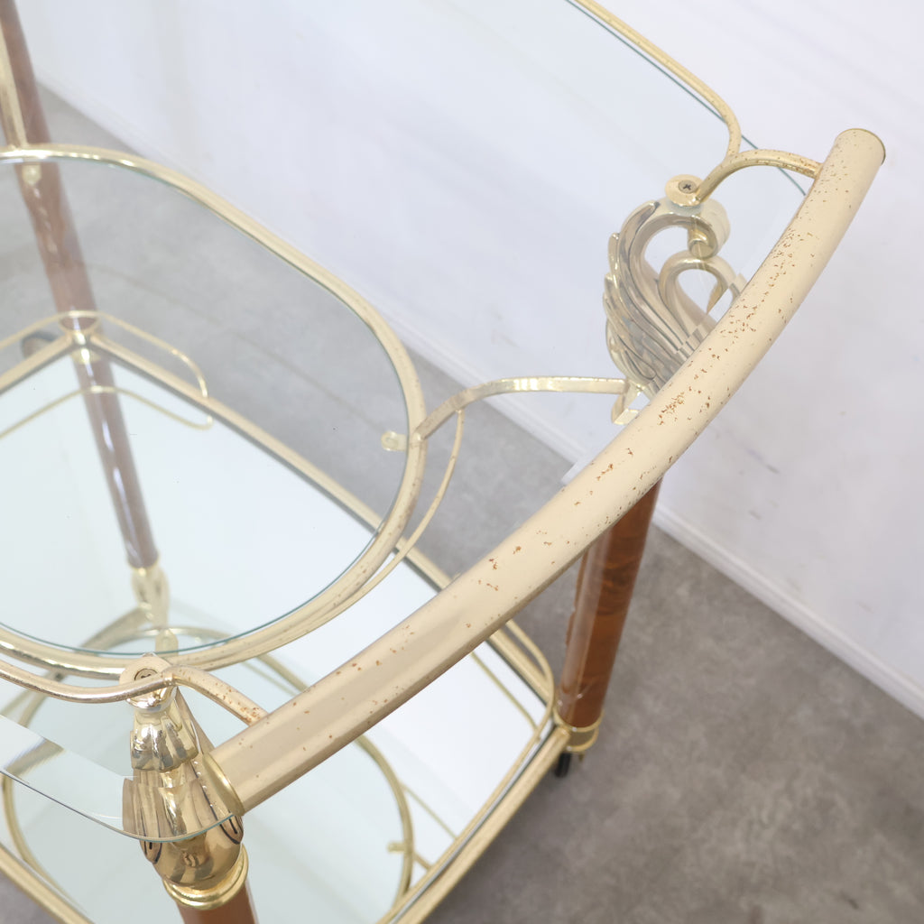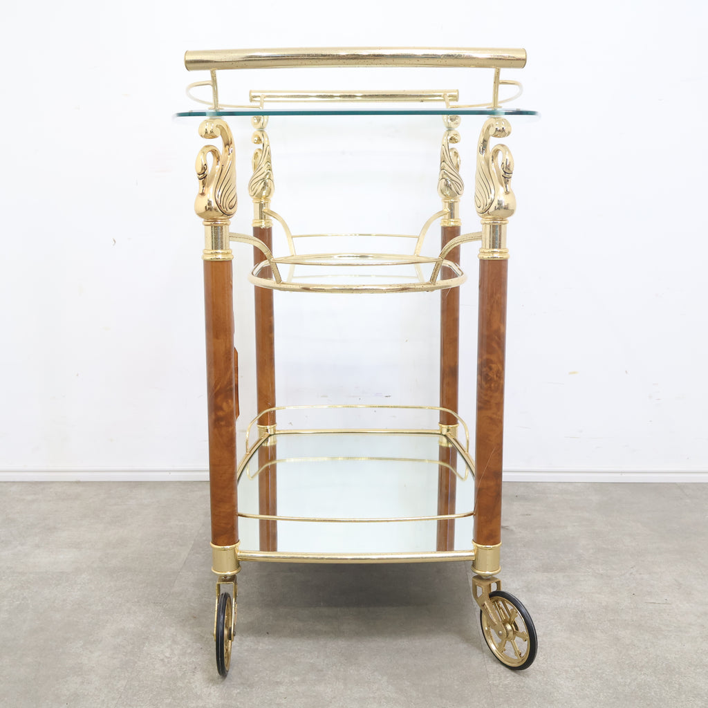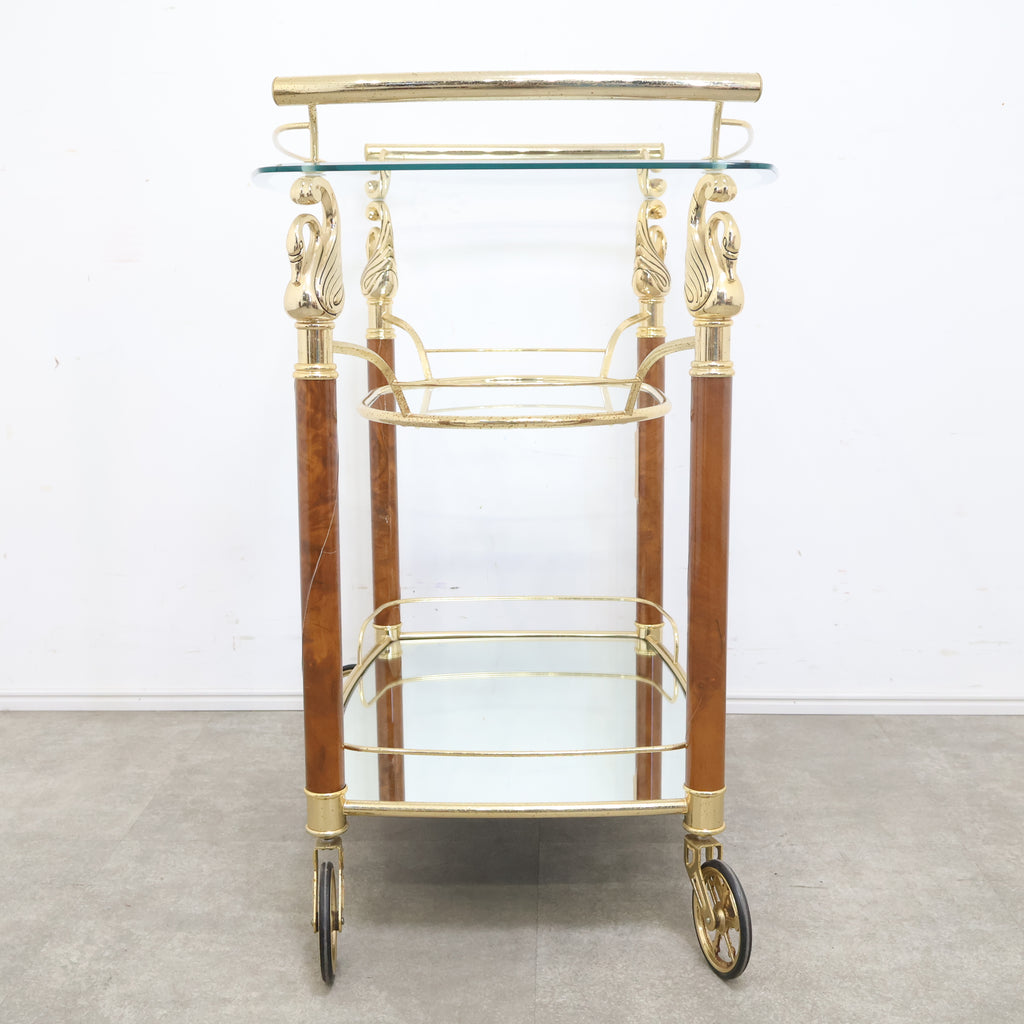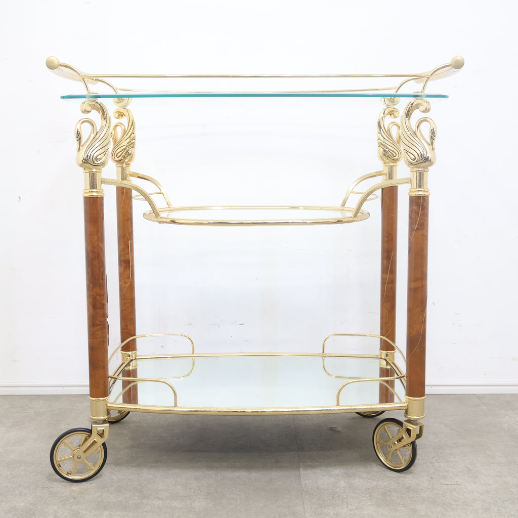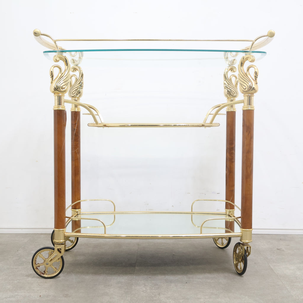 フレームの各所に配されたスワン(白鳥)の立体的な彫刻が、このワゴンの格調高い美しさを際立たせています。艶やかなゴールドフレームと、ウォールナット材のような美しい木目調に装飾したポールが組み合わされ、イタリアンクラシックや優雅なホテルライクな空間に最適です。 上段はクリアなガラス天板、下段はミラー(鏡)天板で構成され、飲み物やグラス、ボトルを美しく演出します。