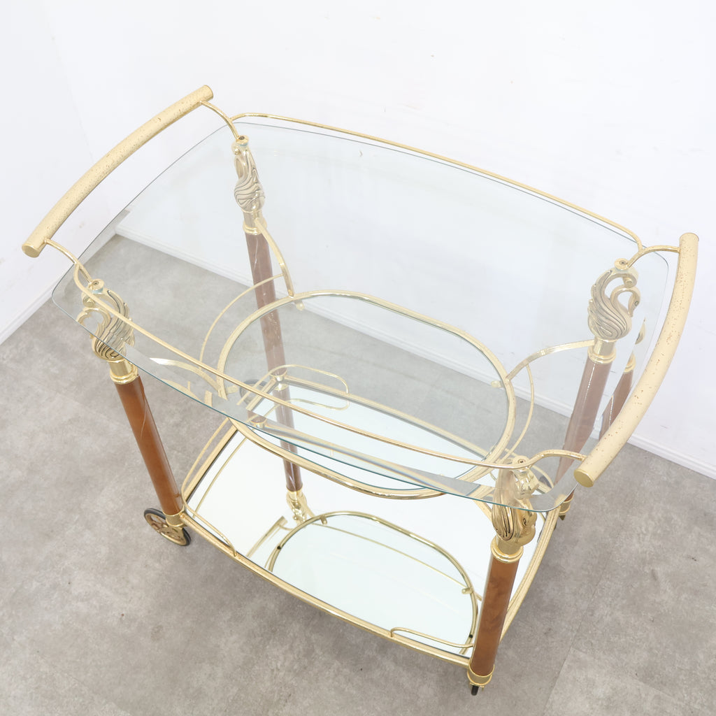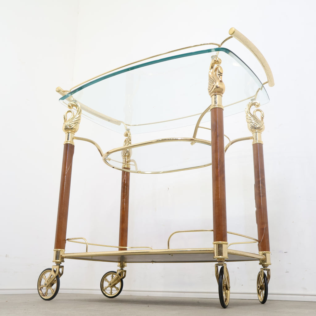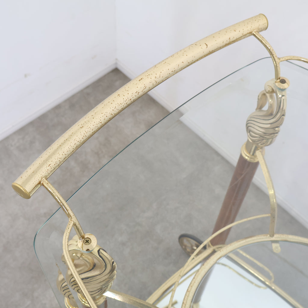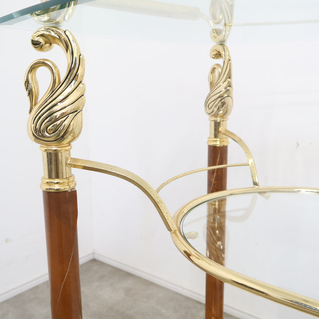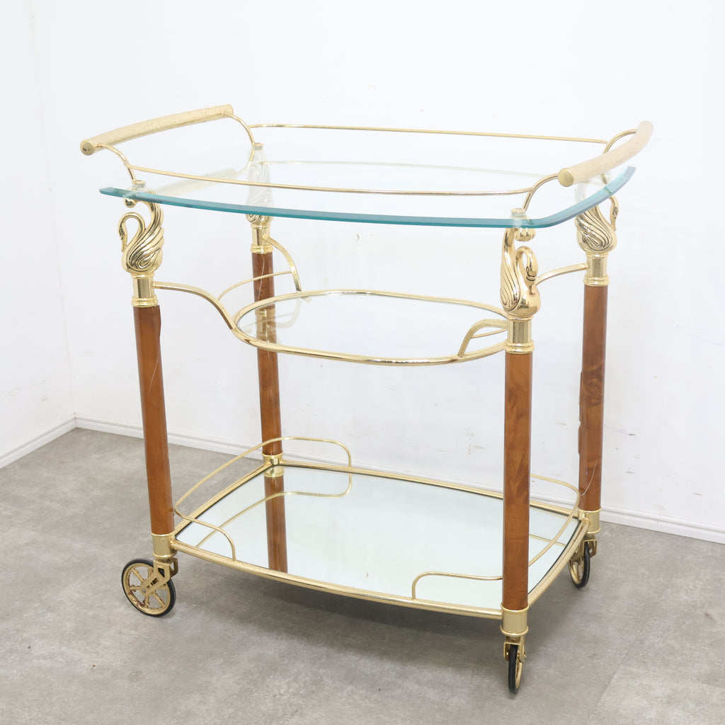 フレームの各所に配されたスワン(白鳥)の立体的な彫刻が、このワゴンの格調高い美しさを際立たせています。艶やかなゴールドフレームと、ウォールナット材のような美しい木目調に装飾したポールが組み合わされ、イタリアンクラシックや優雅なホテルライクな空間に最適です。 上段はクリアなガラス天板、下段はミラー(鏡)天板で構成され、飲み物やグラス、ボトルを美しく演出します。