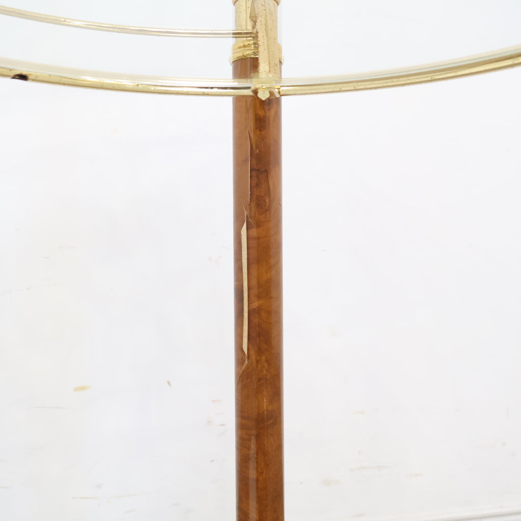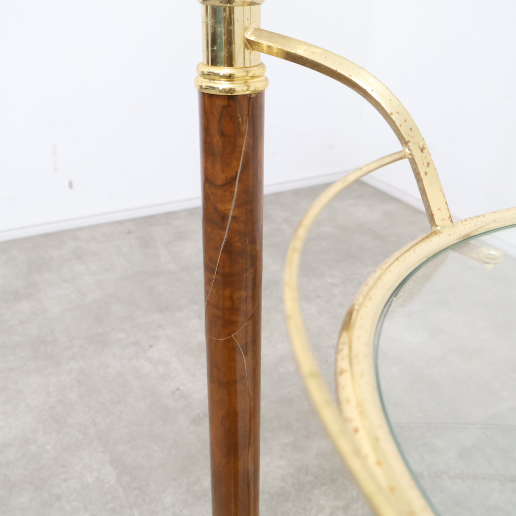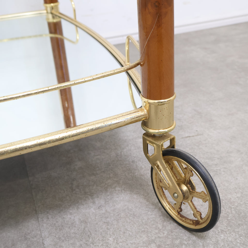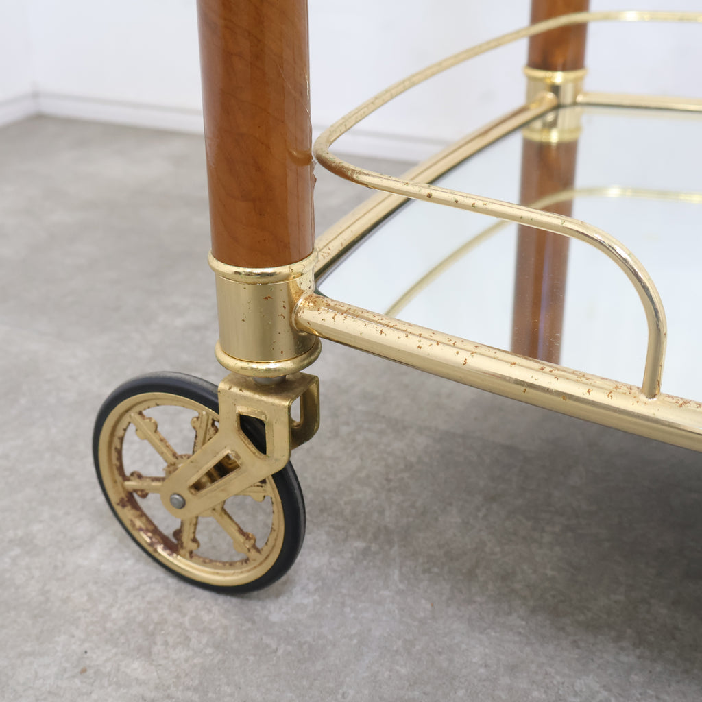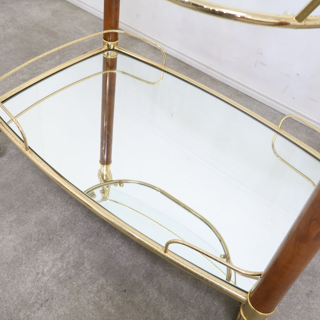 フレームの各所に配されたスワン(白鳥)の立体的な彫刻が、このワゴンの格調高い美しさを際立たせています。艶やかなゴールドフレームと、ウォールナット材のような美しい木目調に装飾したポールが組み合わされ、イタリアンクラシックや優雅なホテルライクな空間に最適です。 上段はクリアなガラス天板、下段はミラー(鏡)天板で構成され、飲み物やグラス、ボトルを美しく演出します。