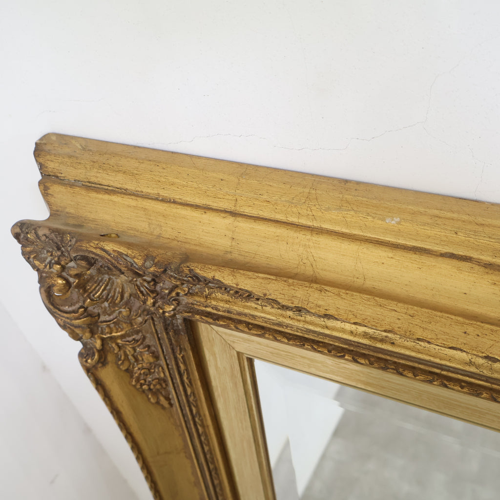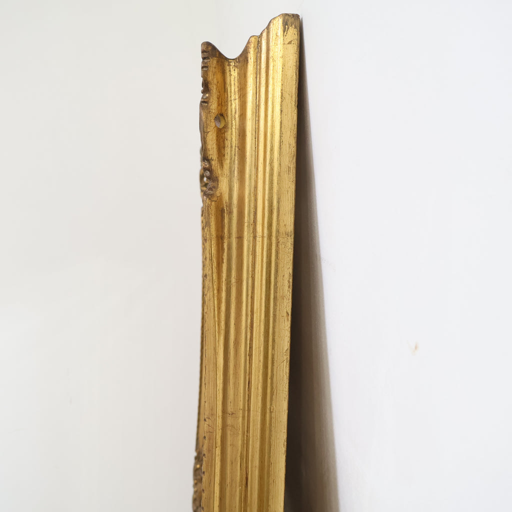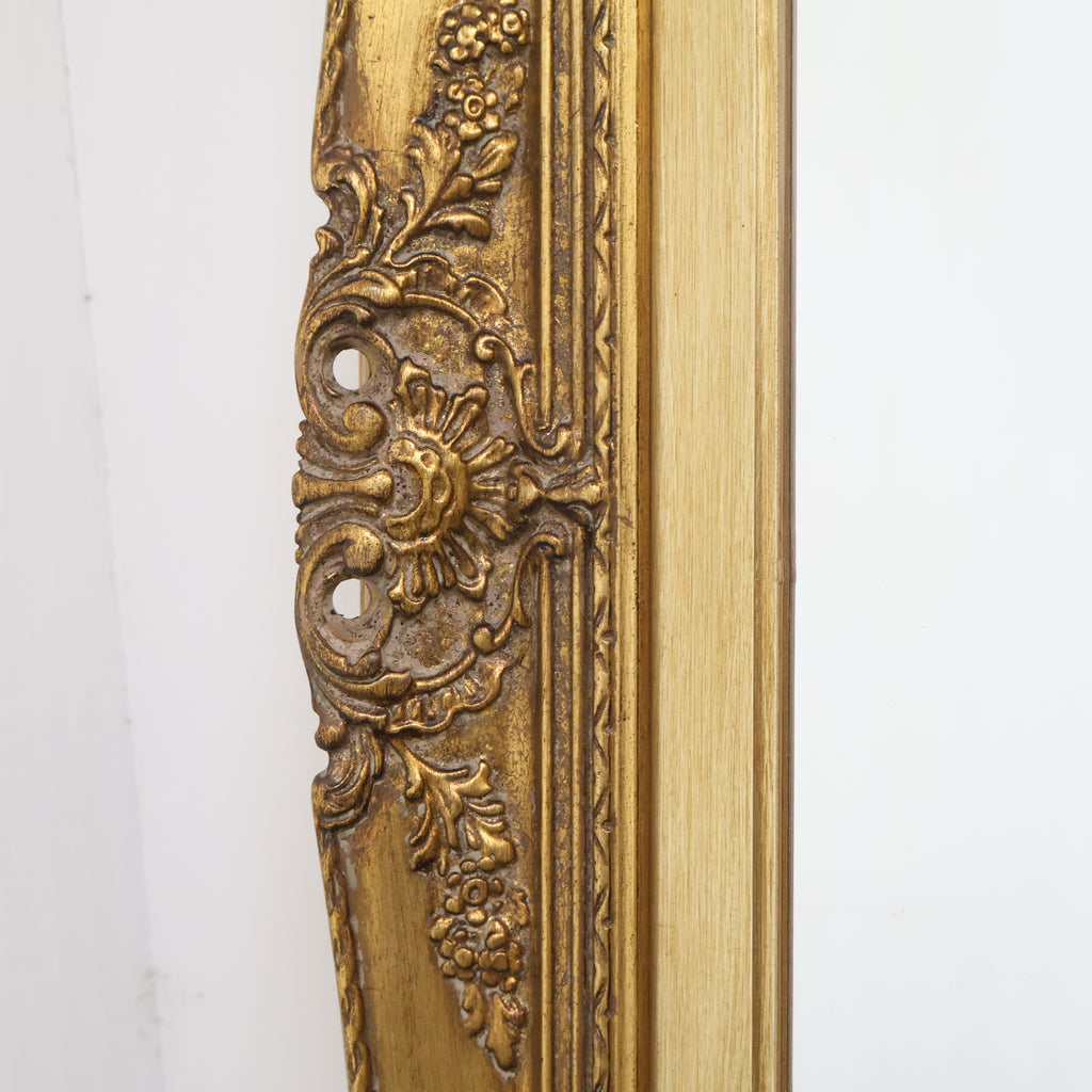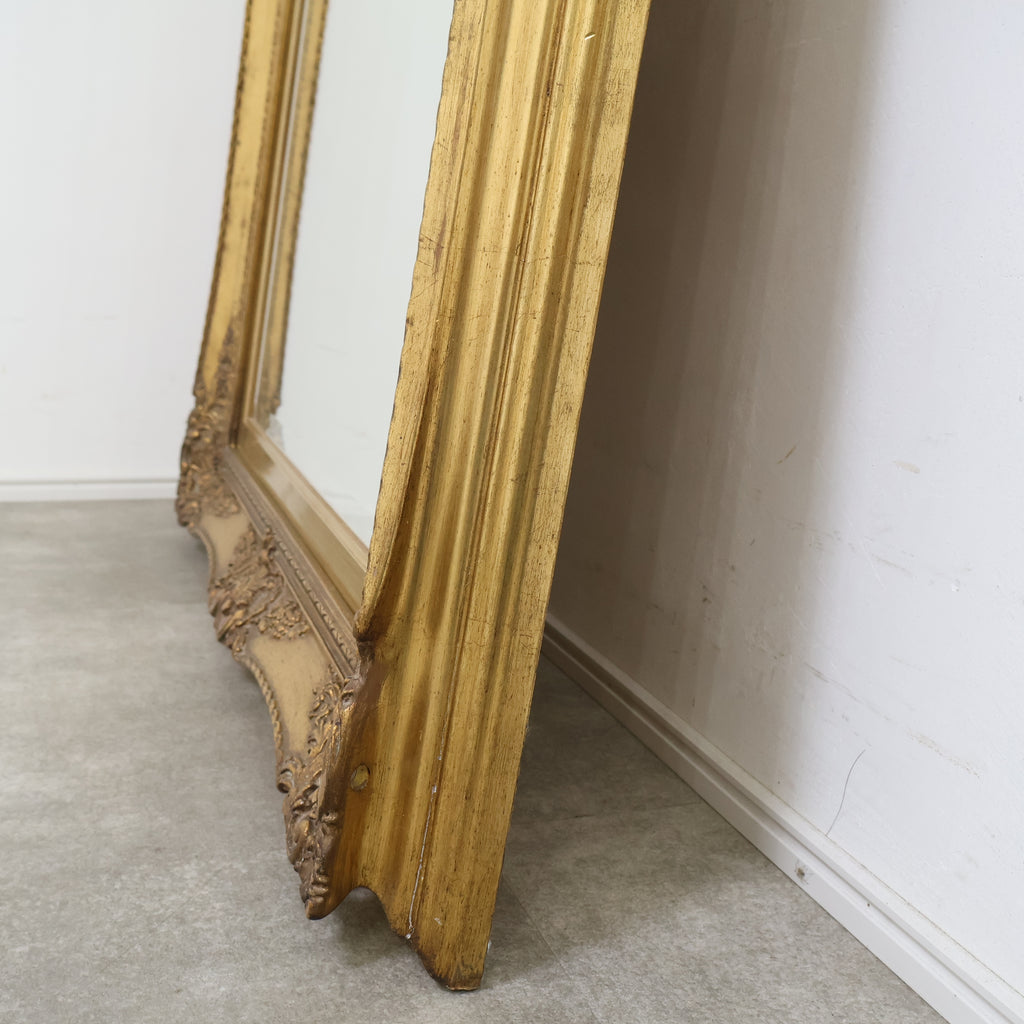 フレーム全体に、流れるような曲線と繊細な花や渦のモチーフが立体的に施されたロココ調デザイン。重厚な作りと、深みのあるアンティークゴールドの色合いが、空間を格調高く、華やかに演出します。
