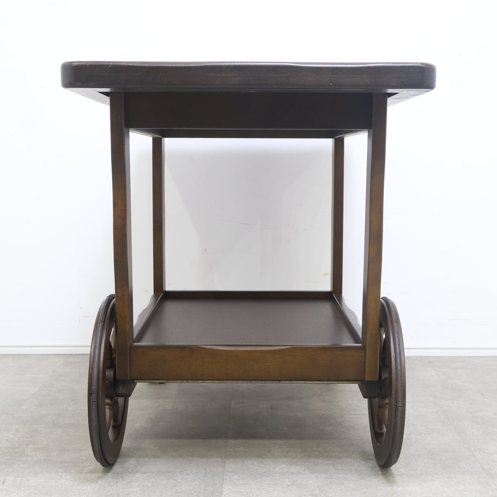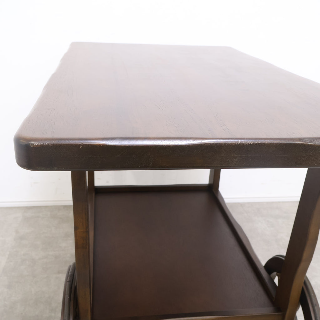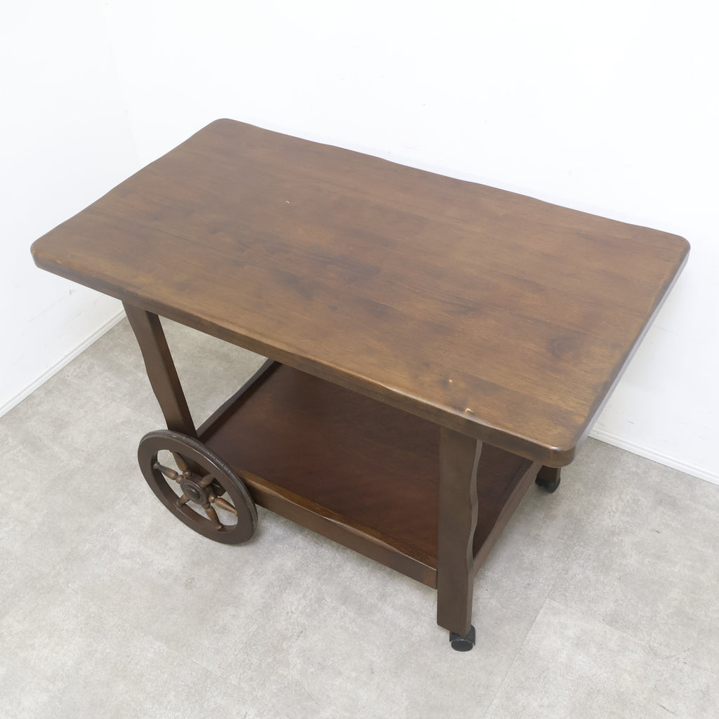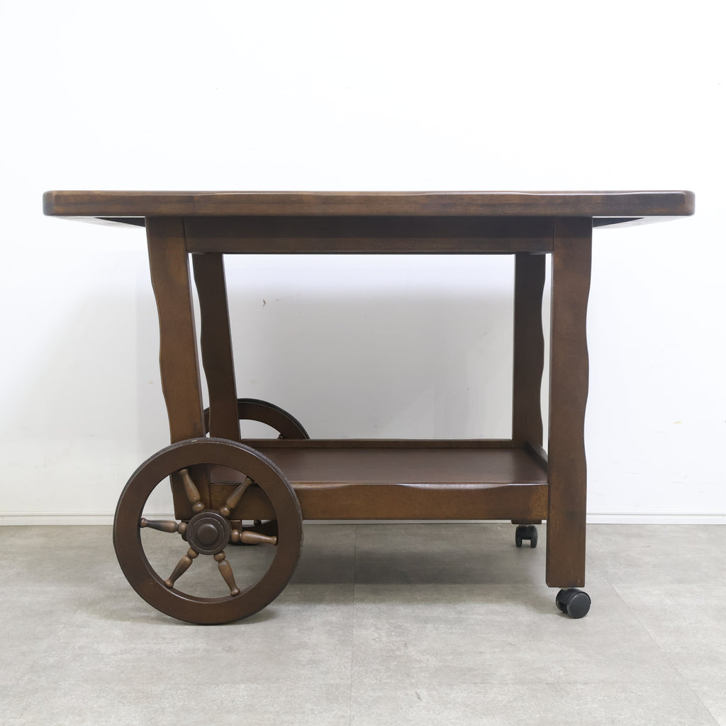 天板は広々としており、下段にも棚板があるため、十分な収納力と作業スペースを提供します。前脚にはクラシックな木製車輪が、後脚にはキャスターが付いており、安定性と移動のしやすさを両立しています。