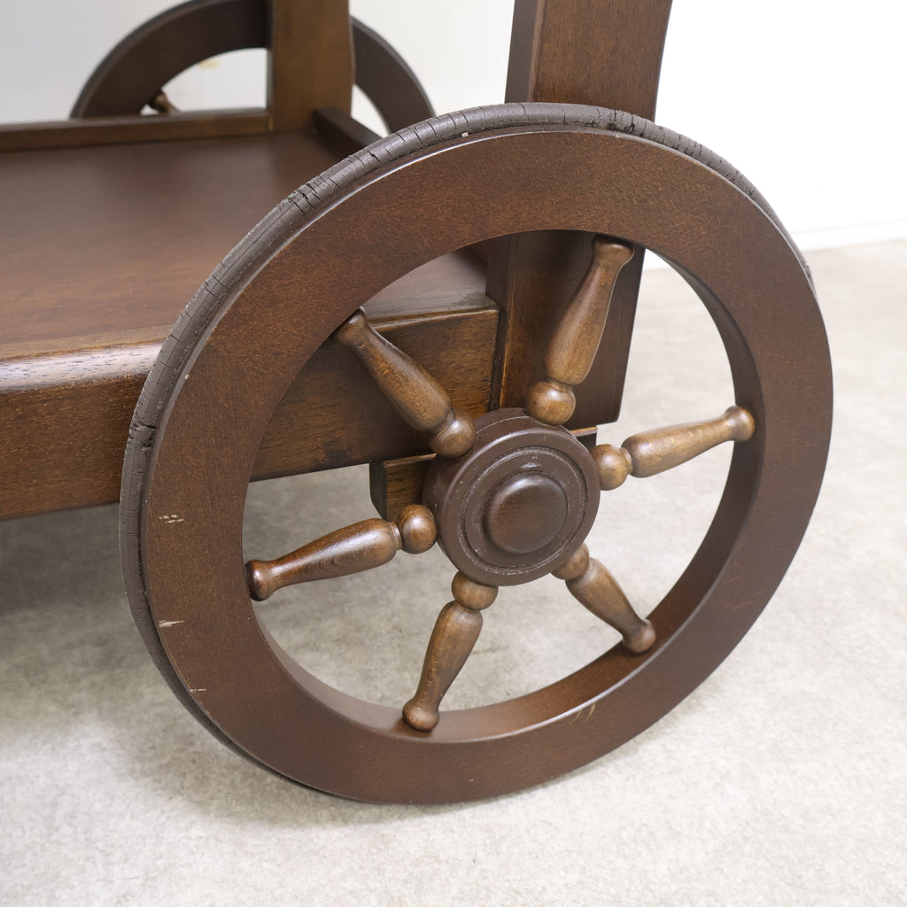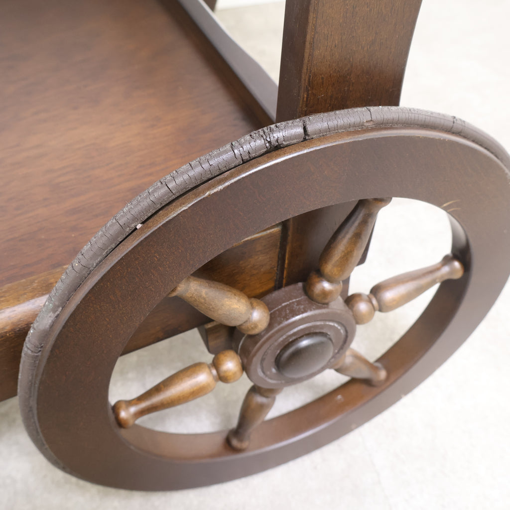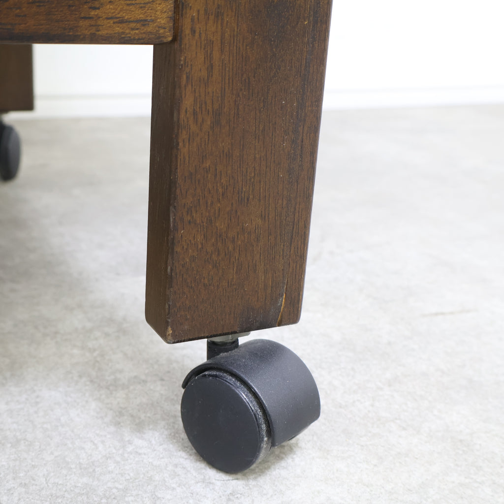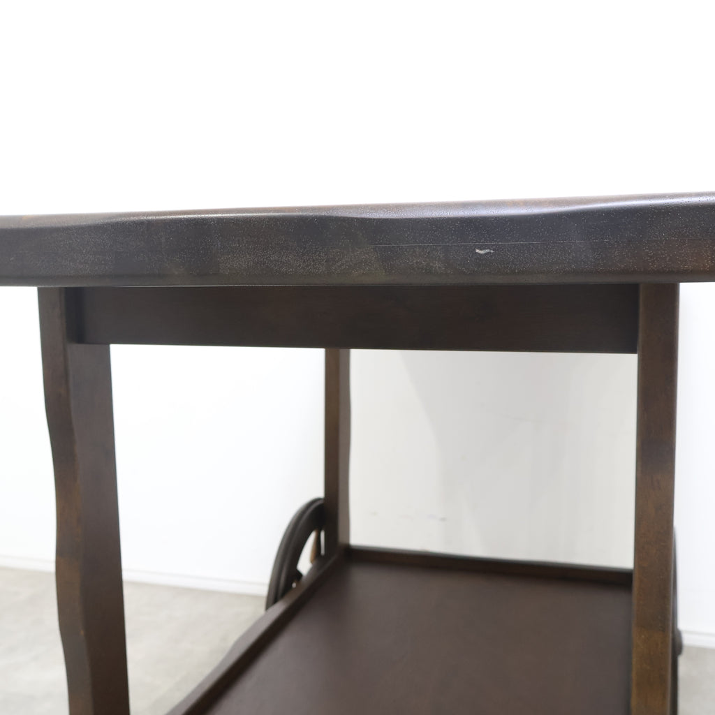 天板は広々としており、下段にも棚板があるため、十分な収納力と作業スペースを提供します。前脚にはクラシックな木製車輪が、後脚にはキャスターが付いており、安定性と移動のしやすさを両立しています。