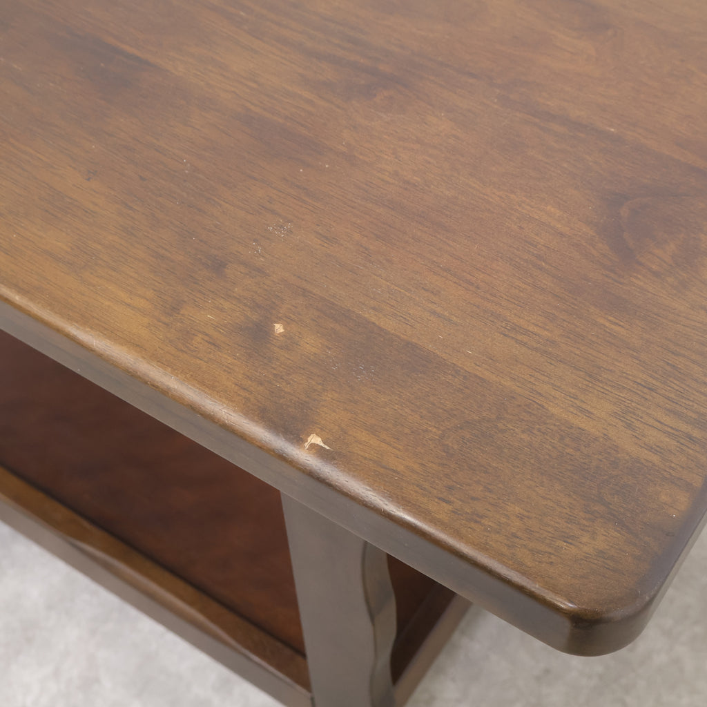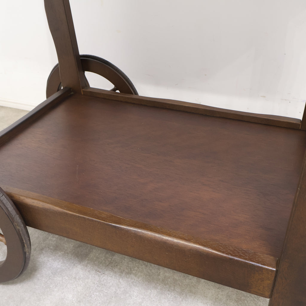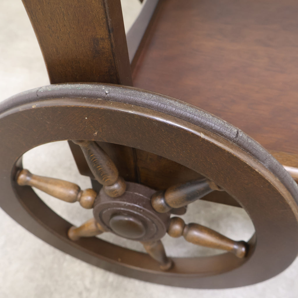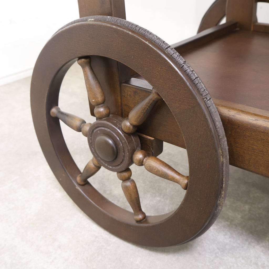 天板は広々としており、下段にも棚板があるため、十分な収納力と作業スペースを提供します。前脚にはクラシックな木製車輪が、後脚にはキャスターが付いており、安定性と移動のしやすさを両立しています。