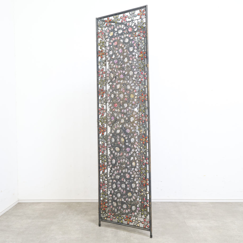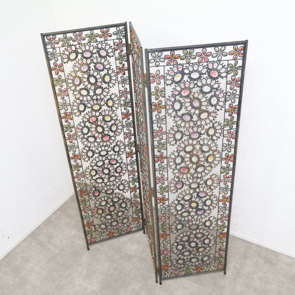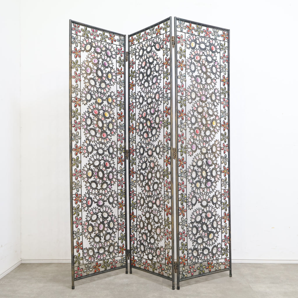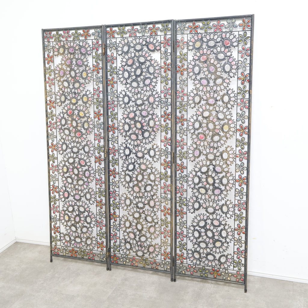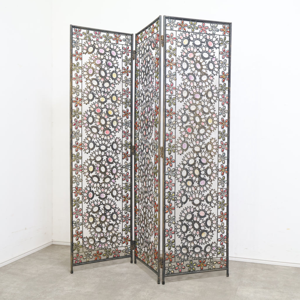 繊細なアイアンワークと色とりどりの装飾が光を受けてきらめき、空間にエキゾチックで華やかな表情を与えます。3連タイプのため、間仕切りとしてはもちろん、背景装飾やショップディスプレイとしても存在感抜群。透け感のあるデザインなので、圧迫感を与えず軽やかに空間を彩ります。ヴィンテージならではの風合いや経年の小キズがありつつも、唯一無二の魅力を持つアートピースのような一品。