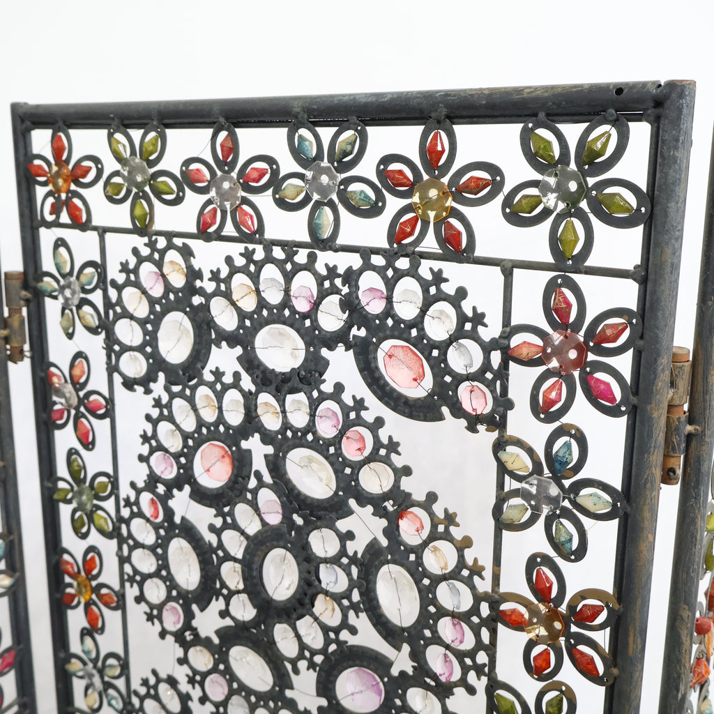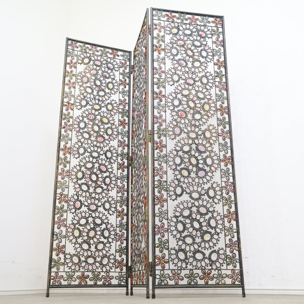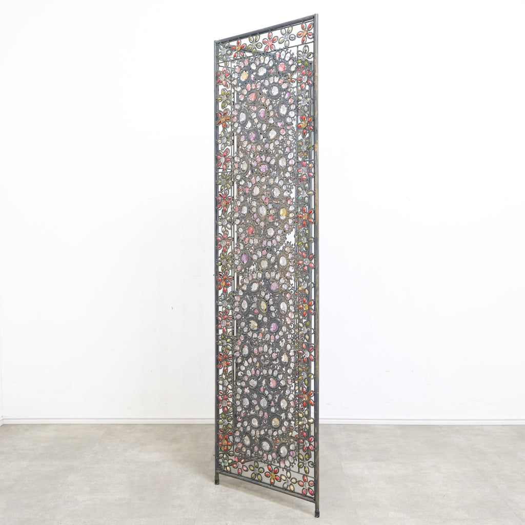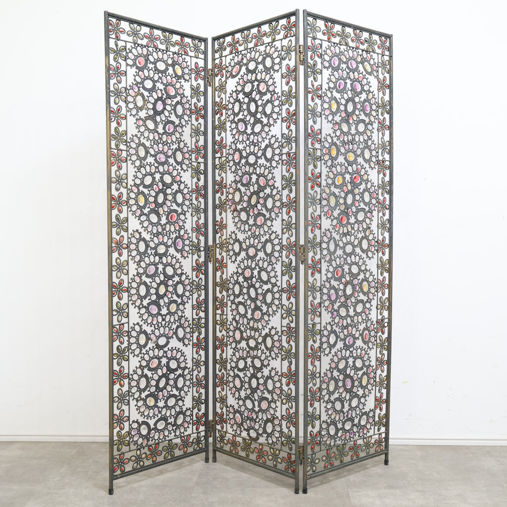 繊細なアイアンワークと色とりどりの装飾が光を受けてきらめき、空間にエキゾチックで華やかな表情を与えます。3連タイプのため、間仕切りとしてはもちろん、背景装飾やショップディスプレイとしても存在感抜群。透け感のあるデザインなので、圧迫感を与えず軽やかに空間を彩ります。ヴィンテージならではの風合いや経年の小キズがありつつも、唯一無二の魅力を持つアートピースのような一品。