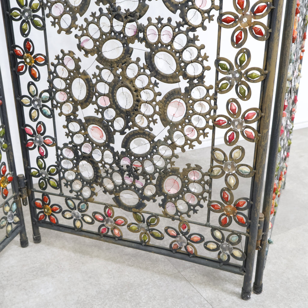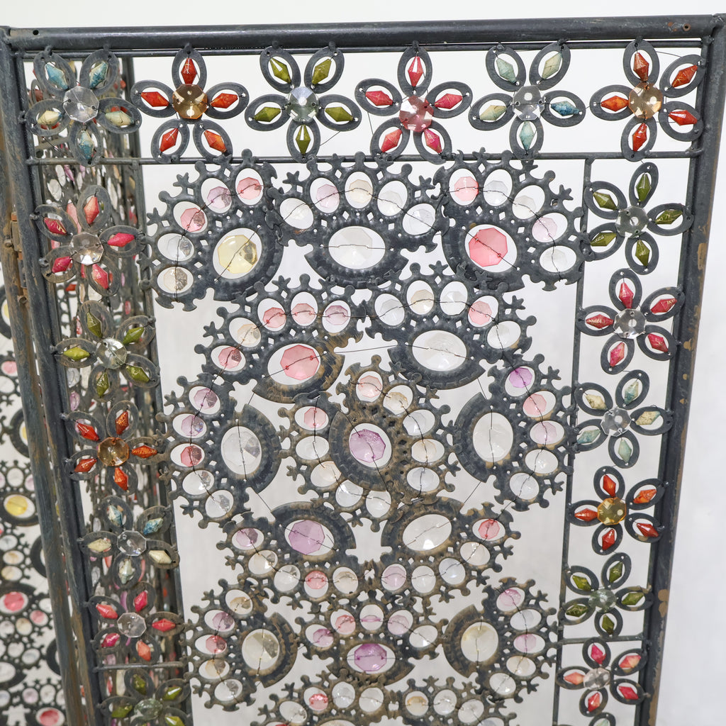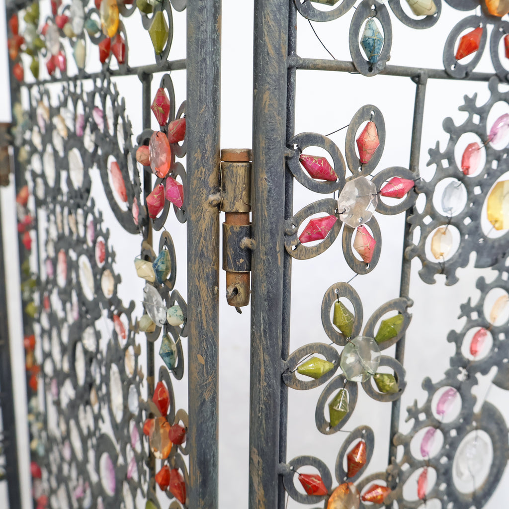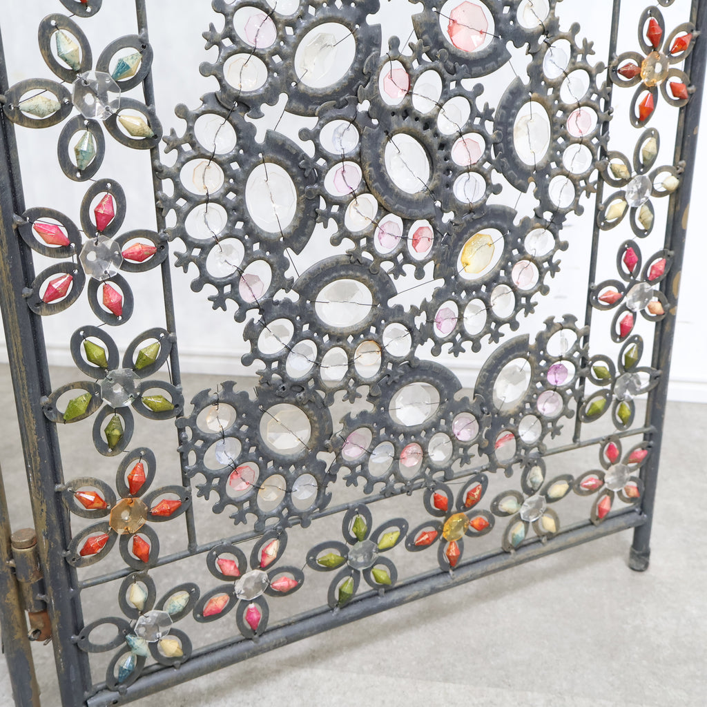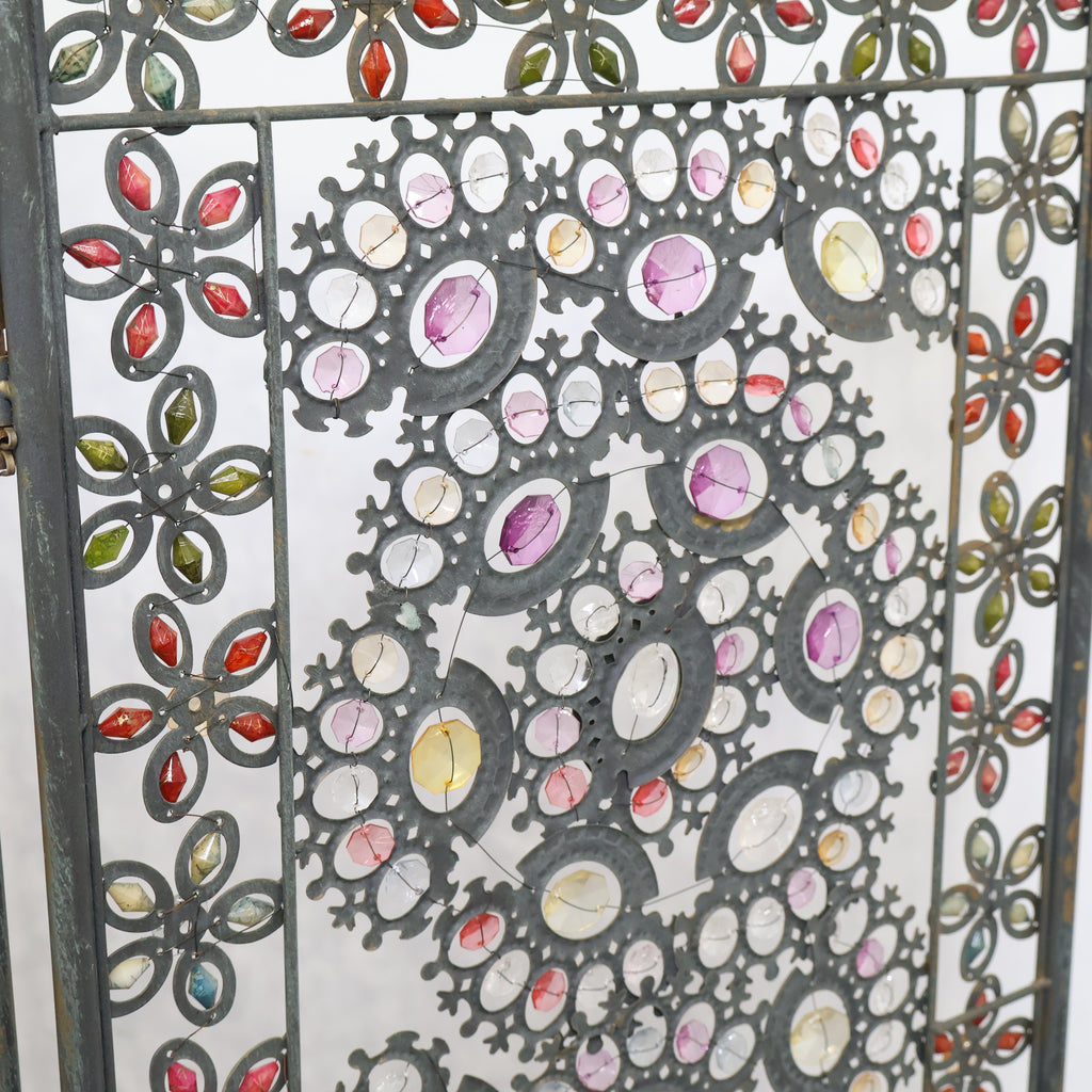 繊細なアイアンワークと色とりどりの装飾が光を受けてきらめき、空間にエキゾチックで華やかな表情を与えます。3連タイプのため、間仕切りとしてはもちろん、背景装飾やショップディスプレイとしても存在感抜群。透け感のあるデザインなので、圧迫感を与えず軽やかに空間を彩ります。ヴィンテージならではの風合いや経年の小キズがありつつも、唯一無二の魅力を持つアートピースのような一品。