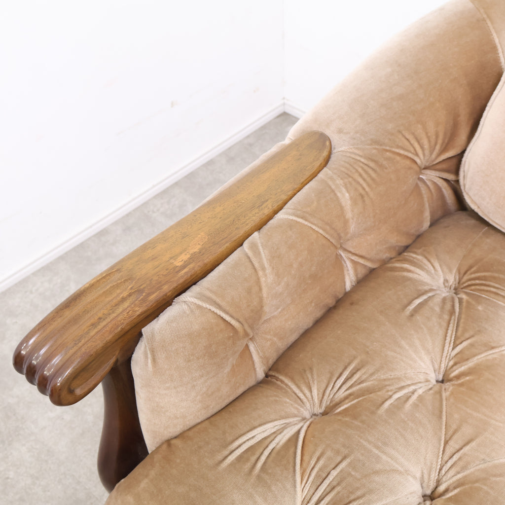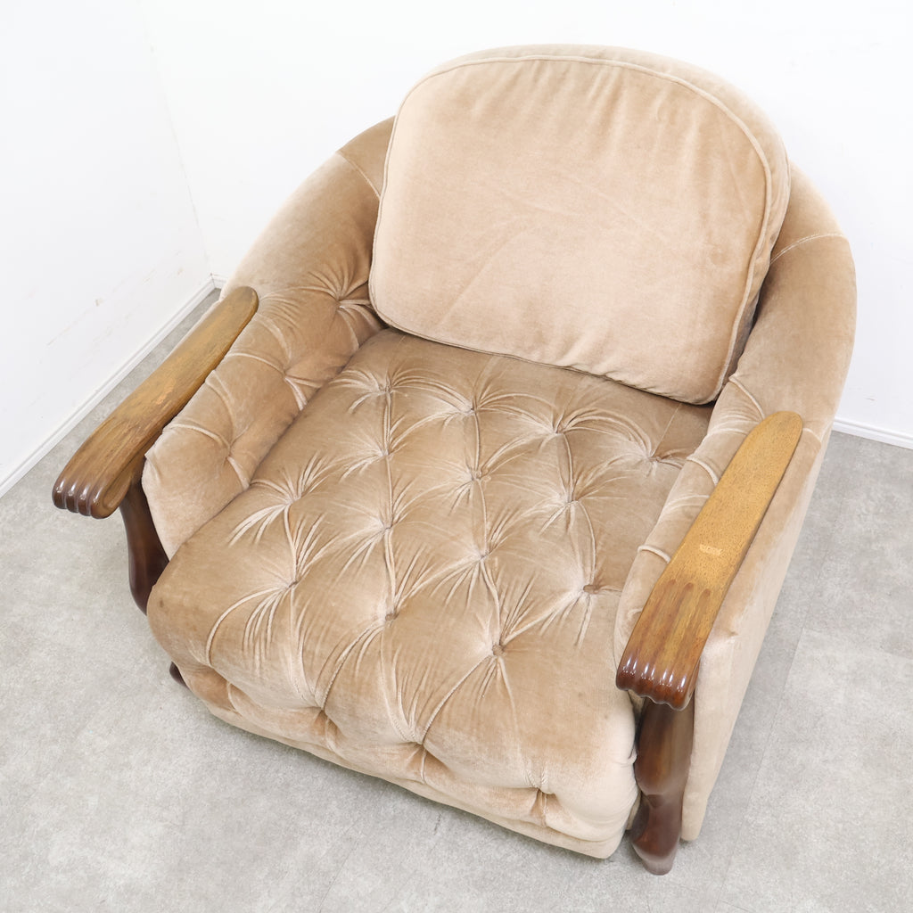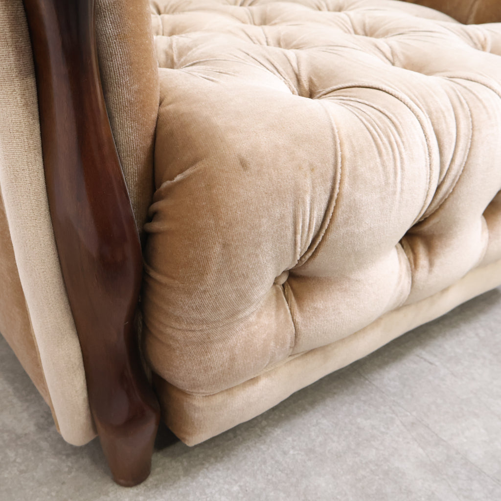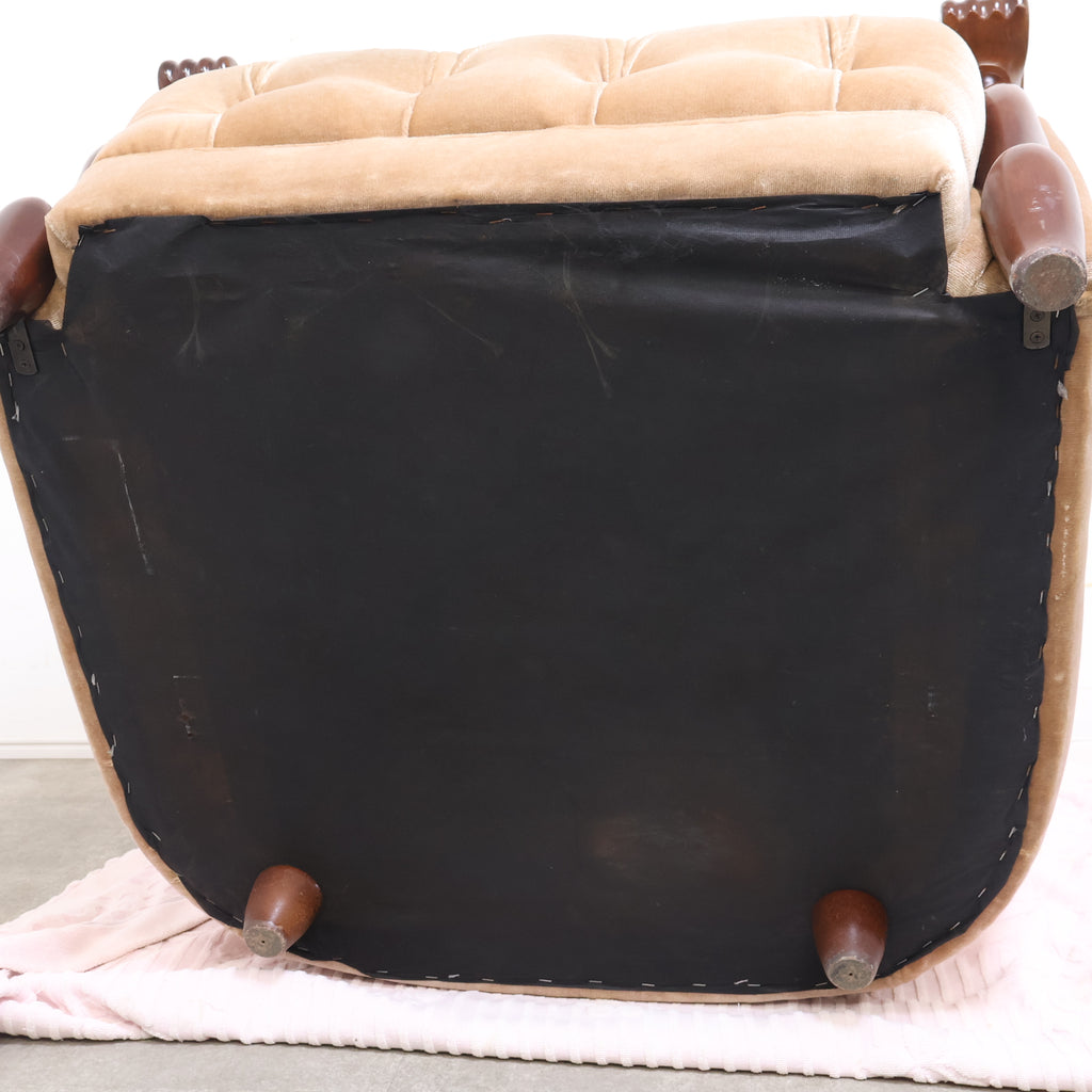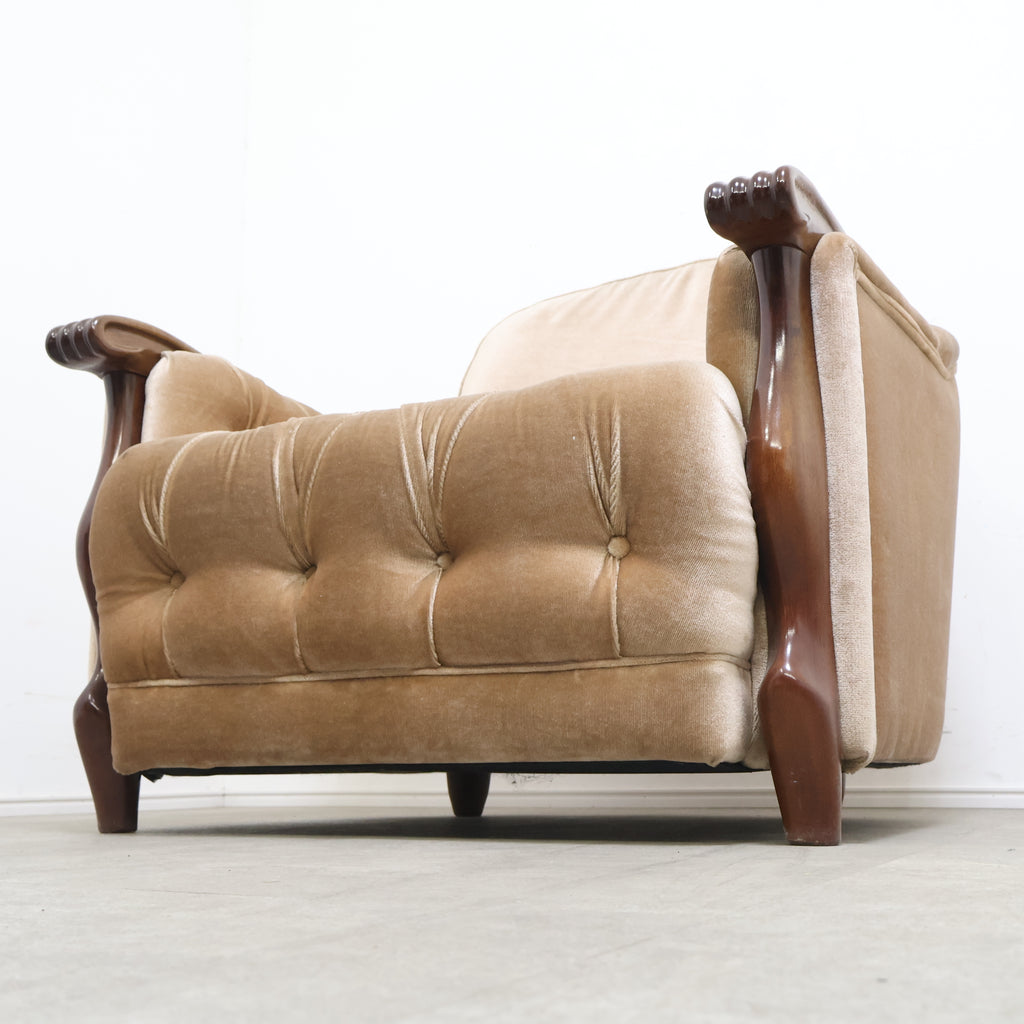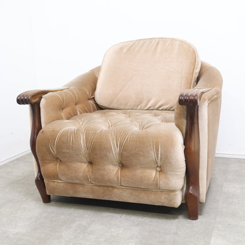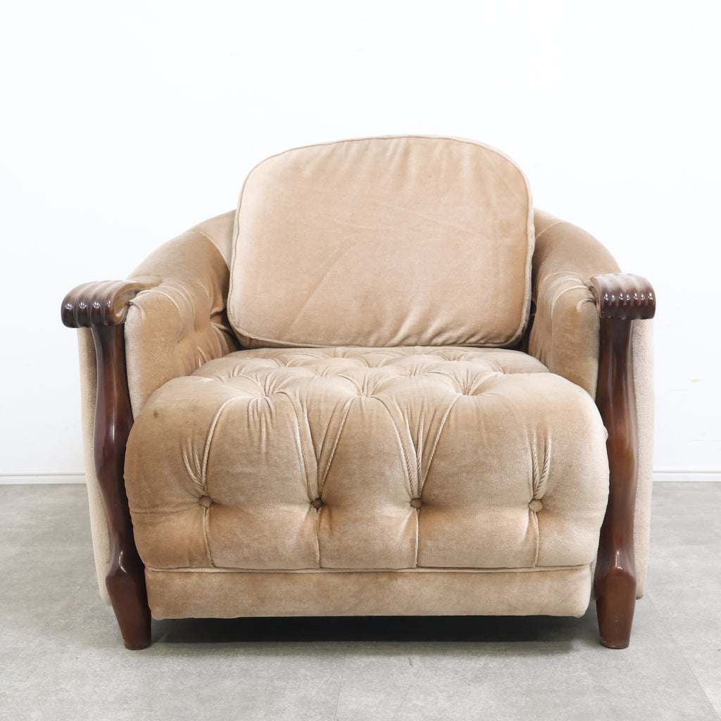 クラシック家具ならではの重厚感と、優雅な曲線を描く木製フレームが魅力の一脚。 柔らかなベロア調ファブリックに深いボタン留めを施した座面は高級感があり、座り心地もしっかり。 気品あるデザインは、クラシック、アンティーク、レトロモダンなど幅広いインテリアに調和します。