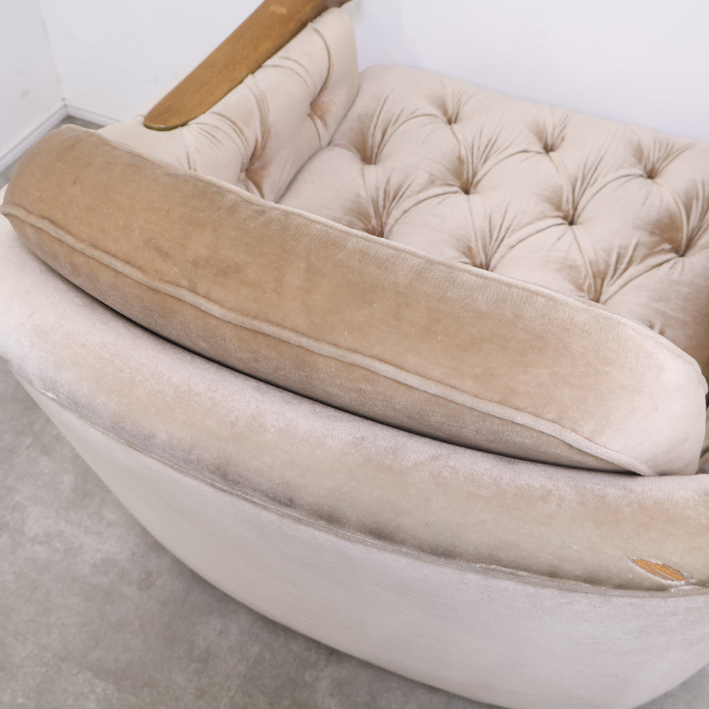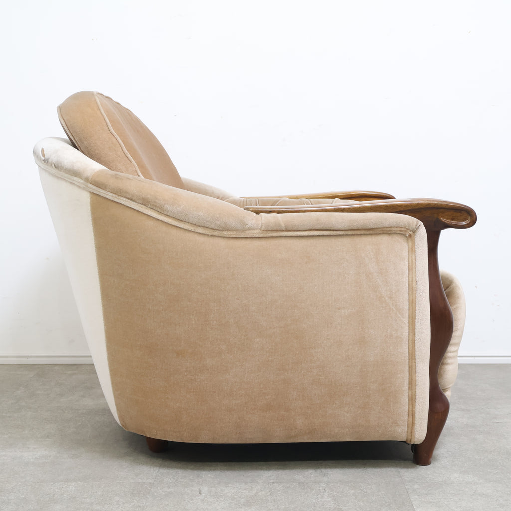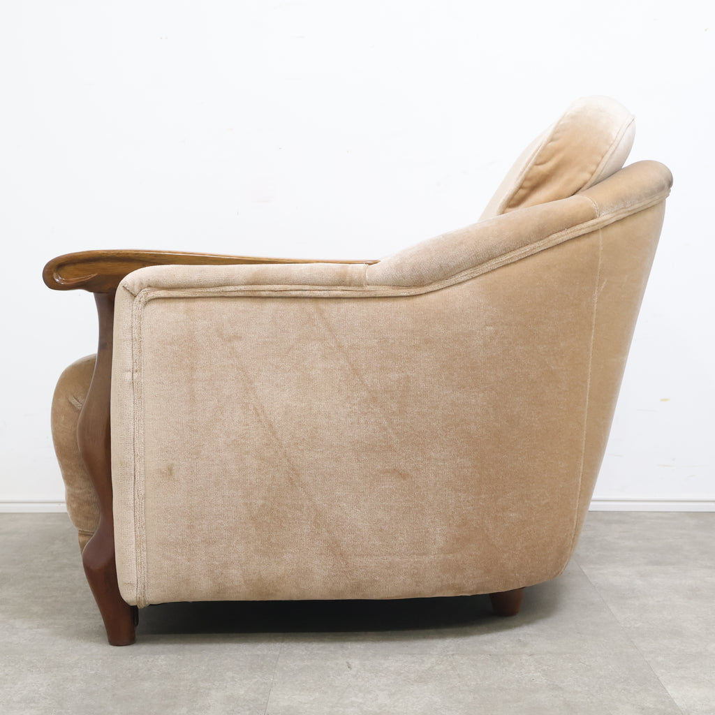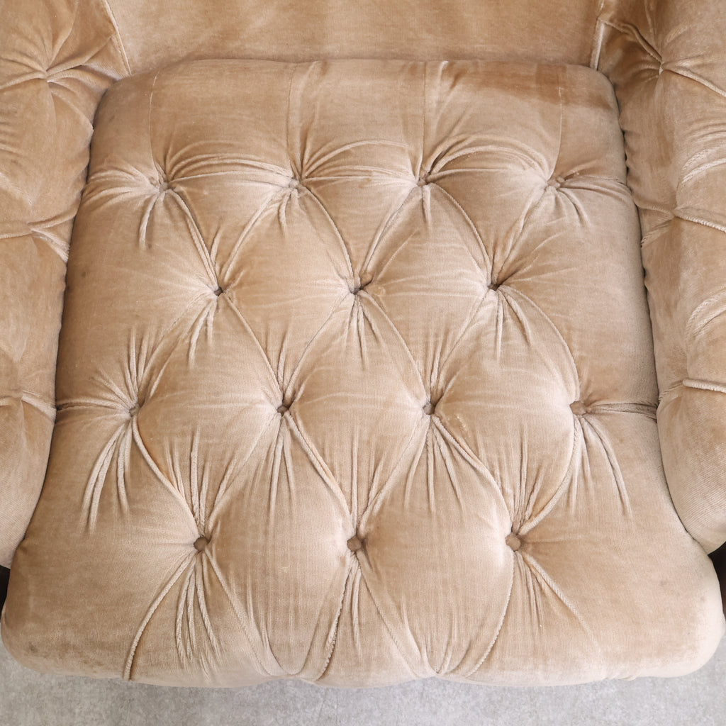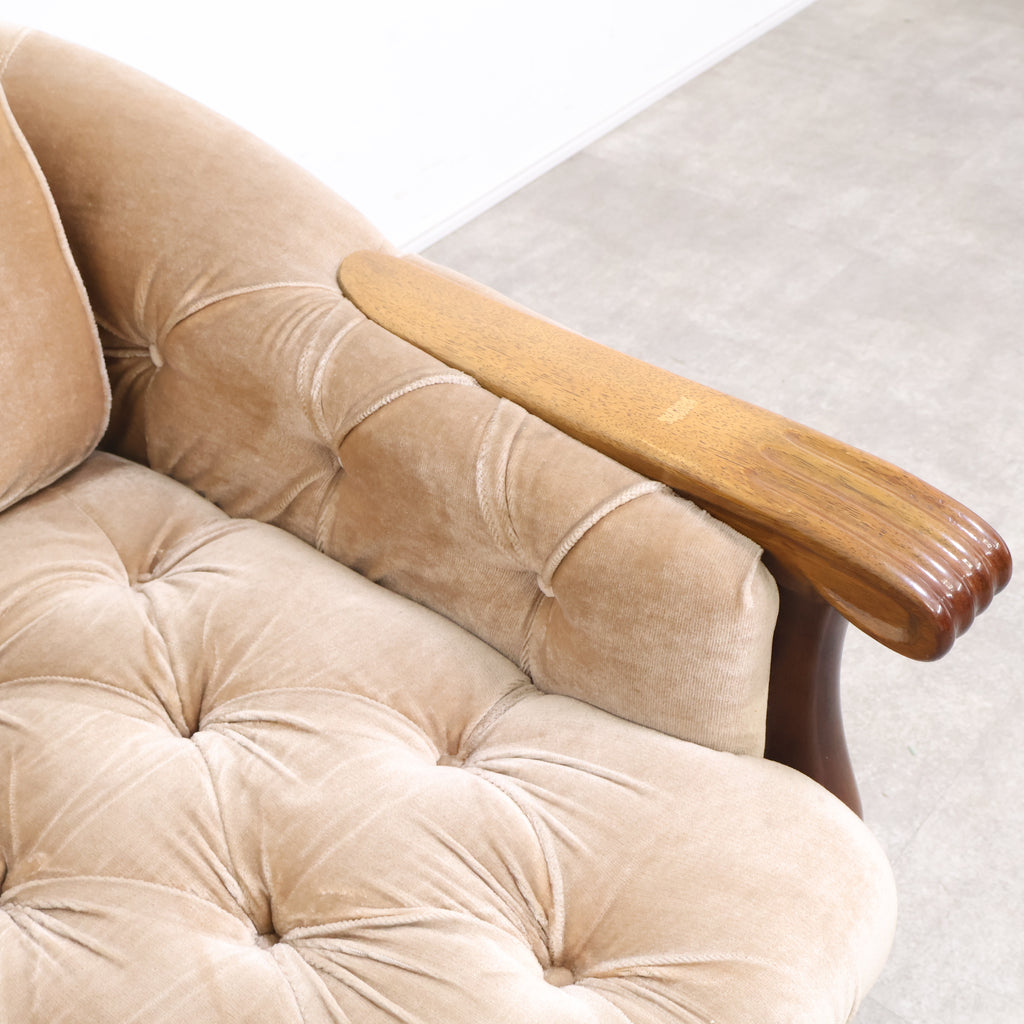 クラシック家具ならではの重厚感と、優雅な曲線を描く木製フレームが魅力の一脚。 柔らかなベロア調ファブリックに深いボタン留めを施した座面は高級感があり、座り心地もしっかり。 気品あるデザインは、クラシック、アンティーク、レトロモダンなど幅広いインテリアに調和します。