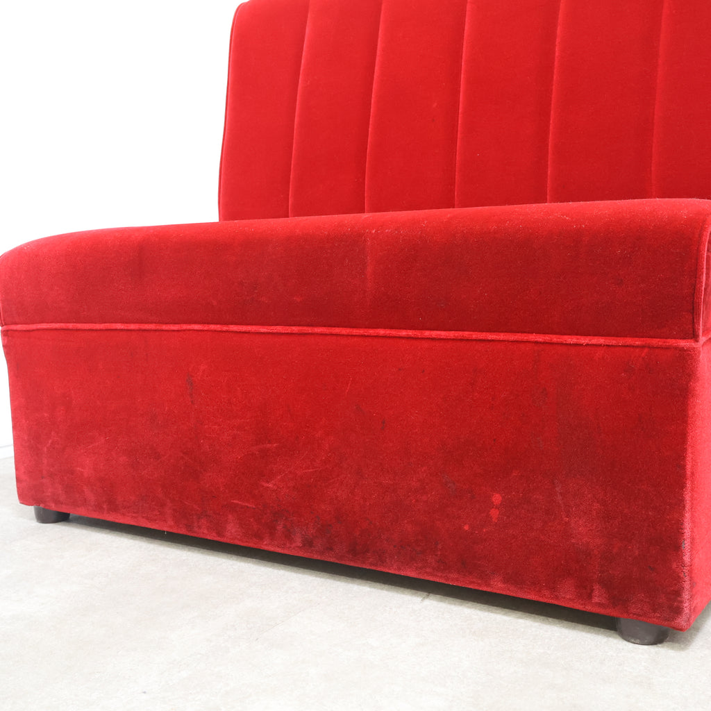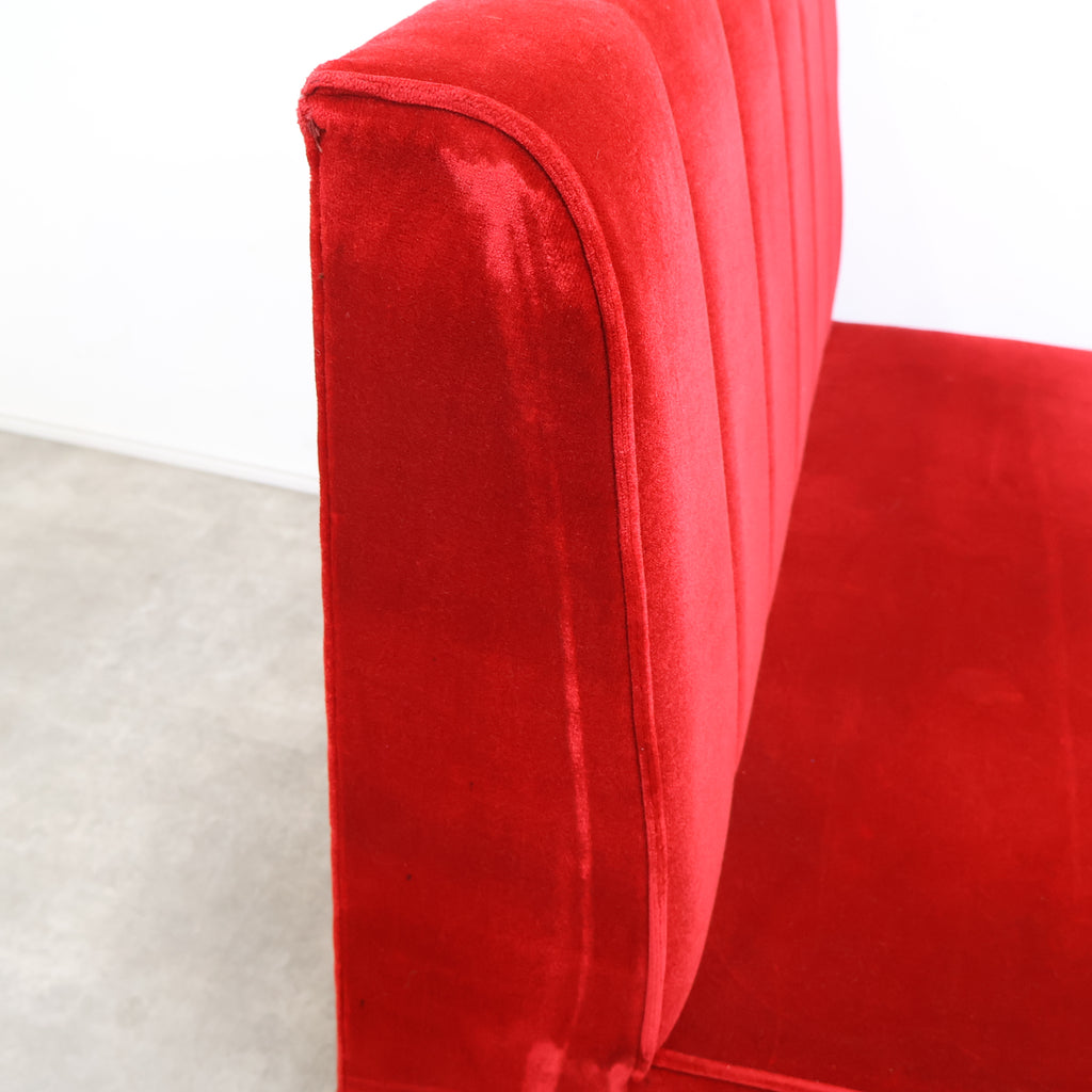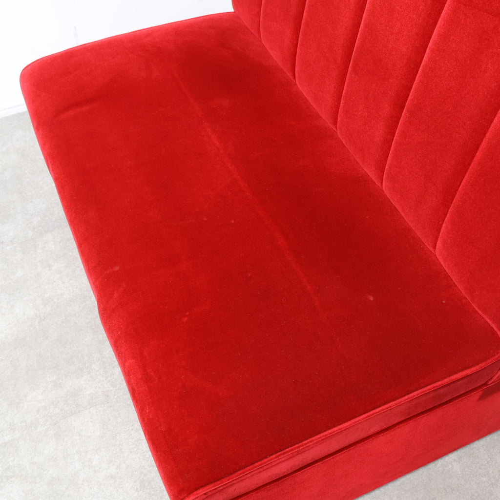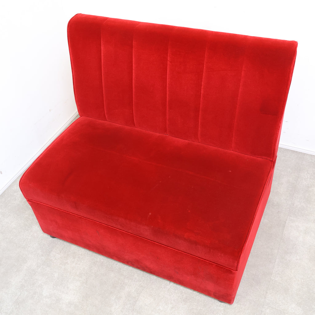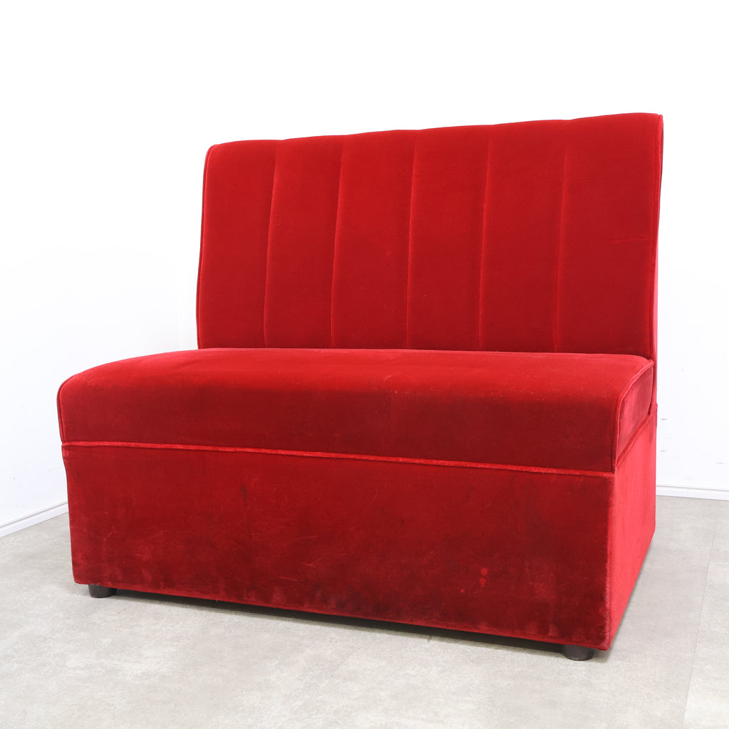 鮮やかなレッドカラーが印象的な、喫茶店・ラウンジで使用されていた2人掛けボックスソファです。