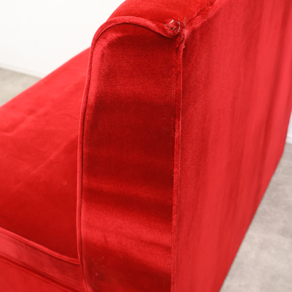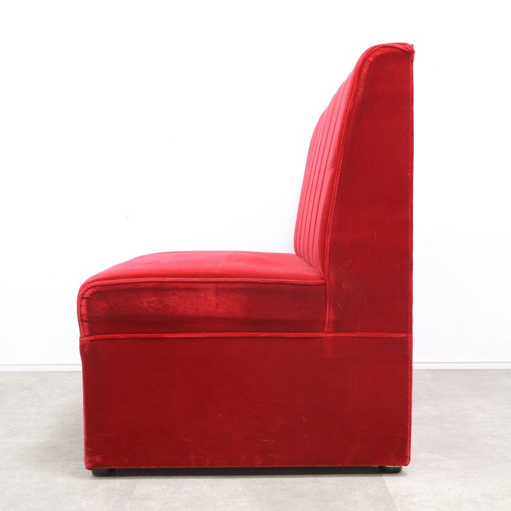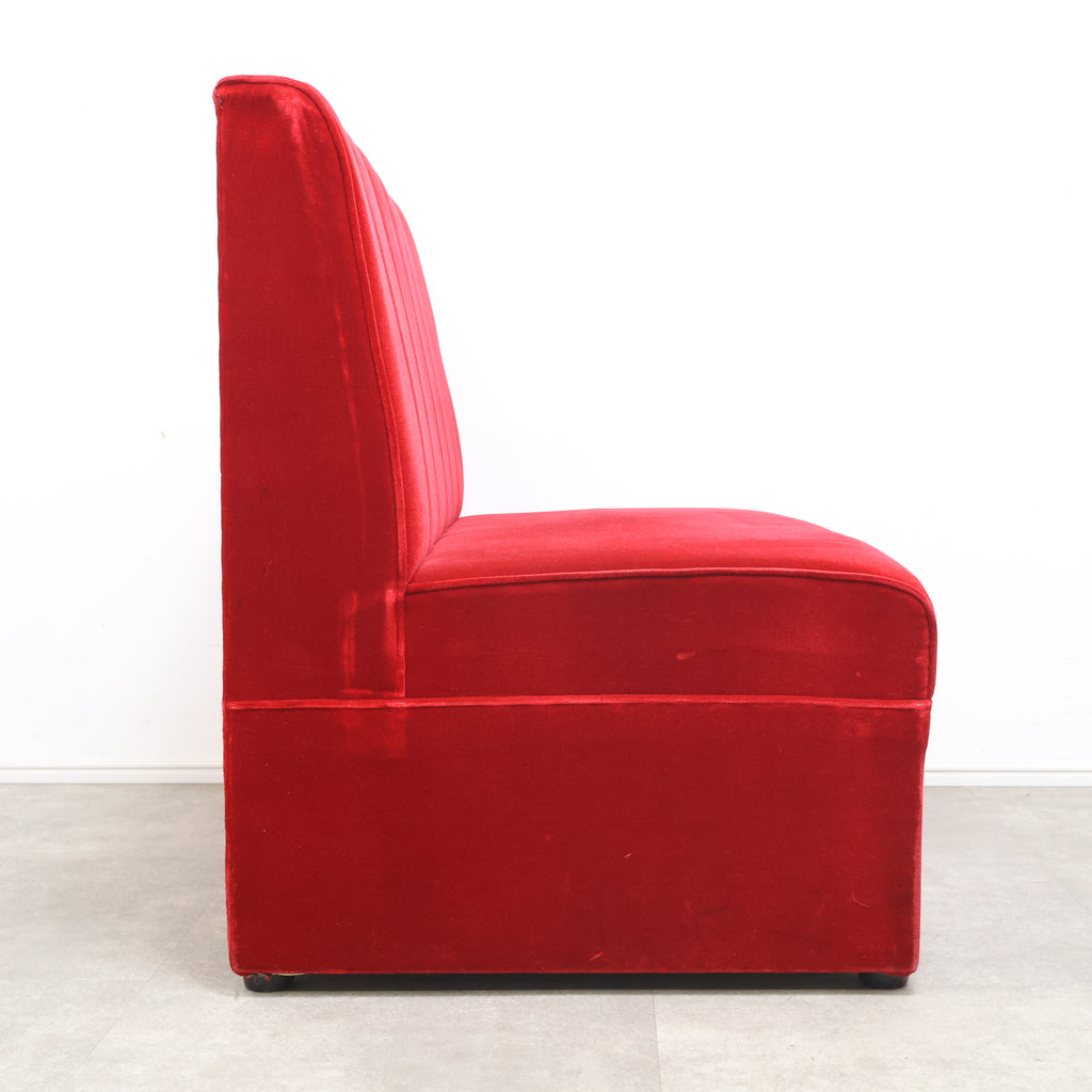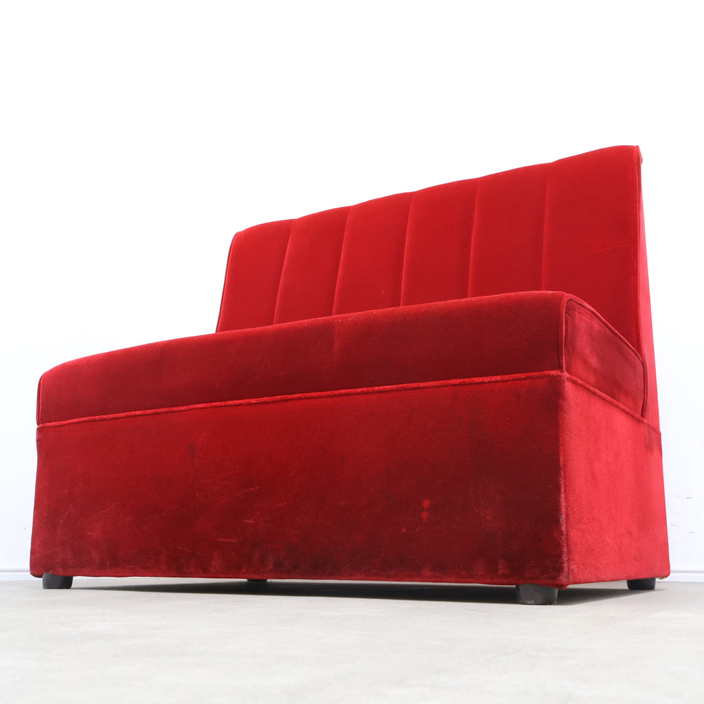 鮮やかなレッドカラーが印象的な、喫茶店・ラウンジで使用されていた2人掛けボックスソファです。