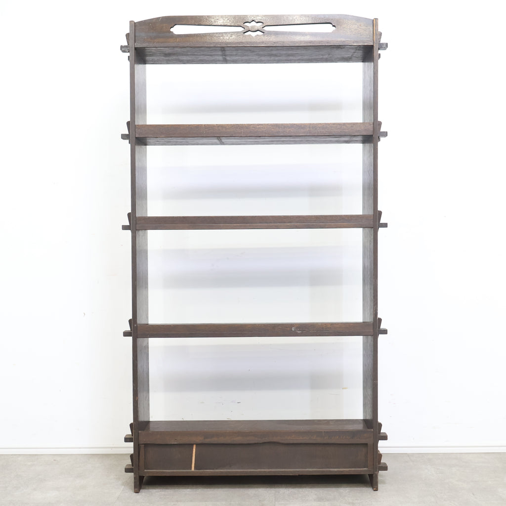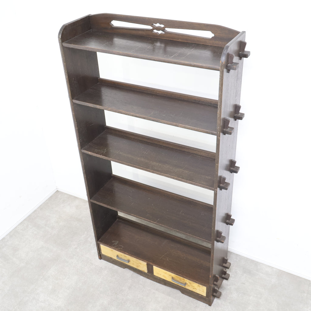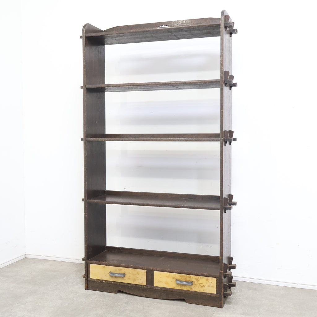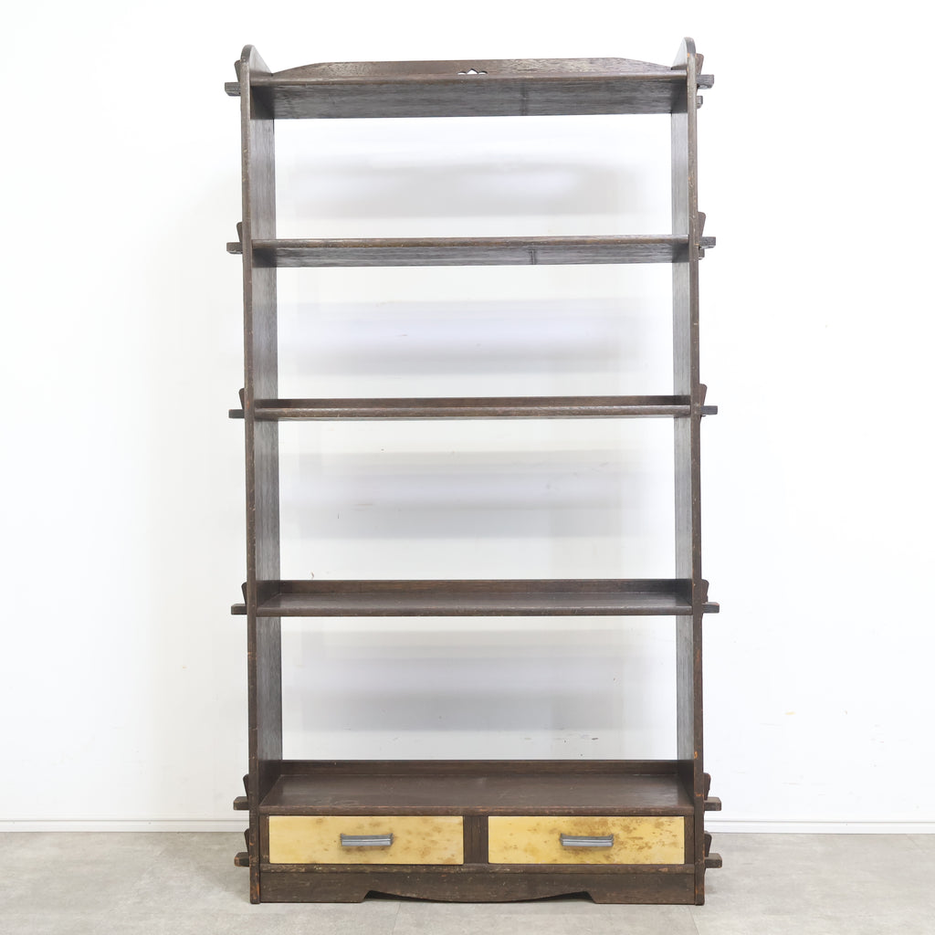 5段のオープンシェルフは収納力が高く、本の整理はもちろん、雑貨や植物、うつわのディスプレイにも最適。 下部には珍しい引き出しが2杯備わっており、細かなアイテムを収納できるのも魅力的なポイントです。 素朴で落ち着いた木の質感は、和家具・古民家インテリア・ナチュラルスタイルとの相性が良く、ショップ什器としても空間にあたたかみを与えてくれます。