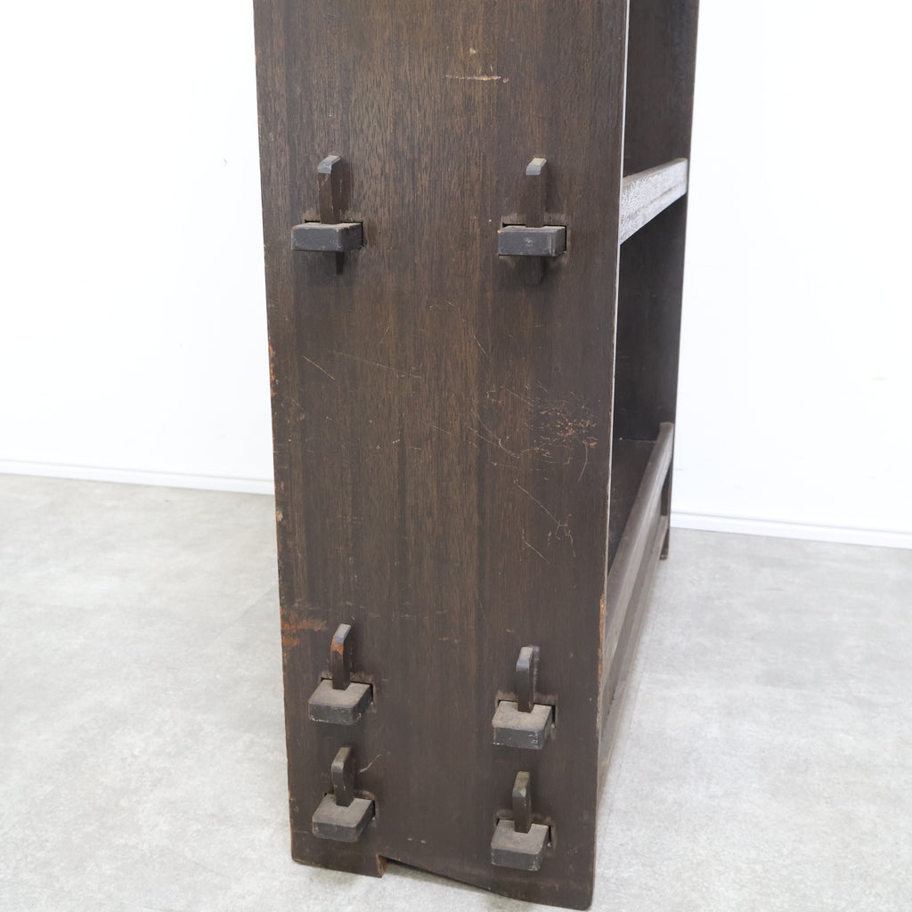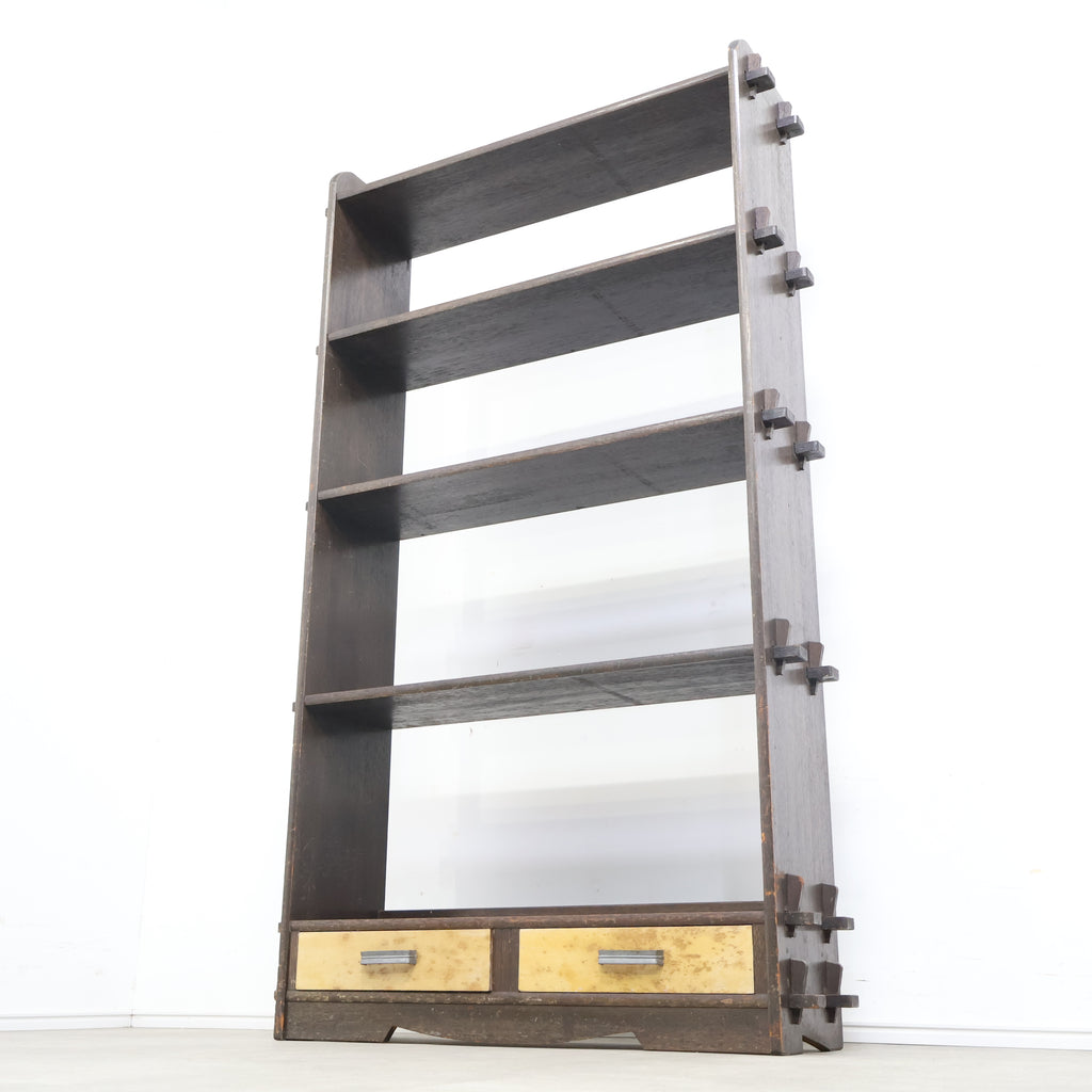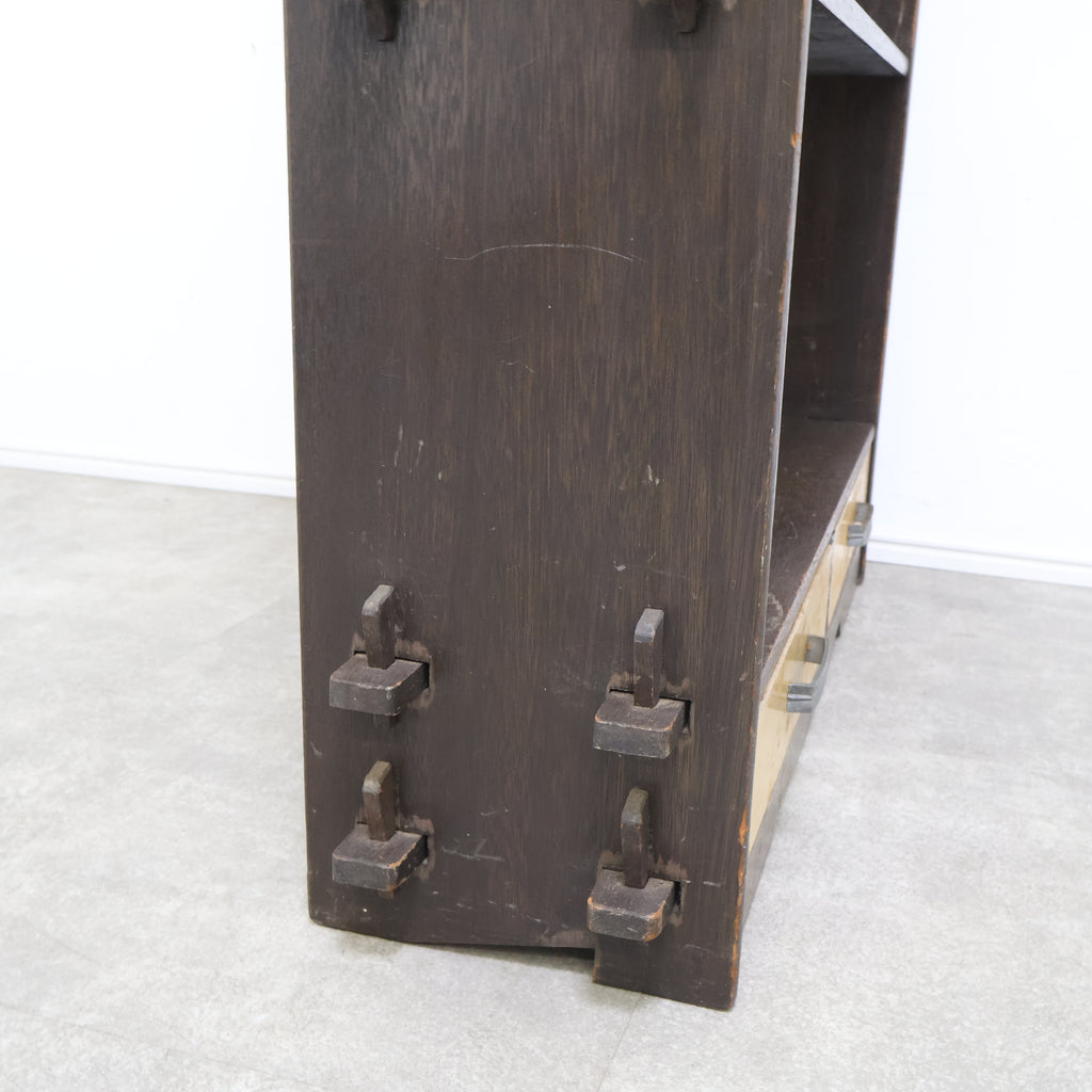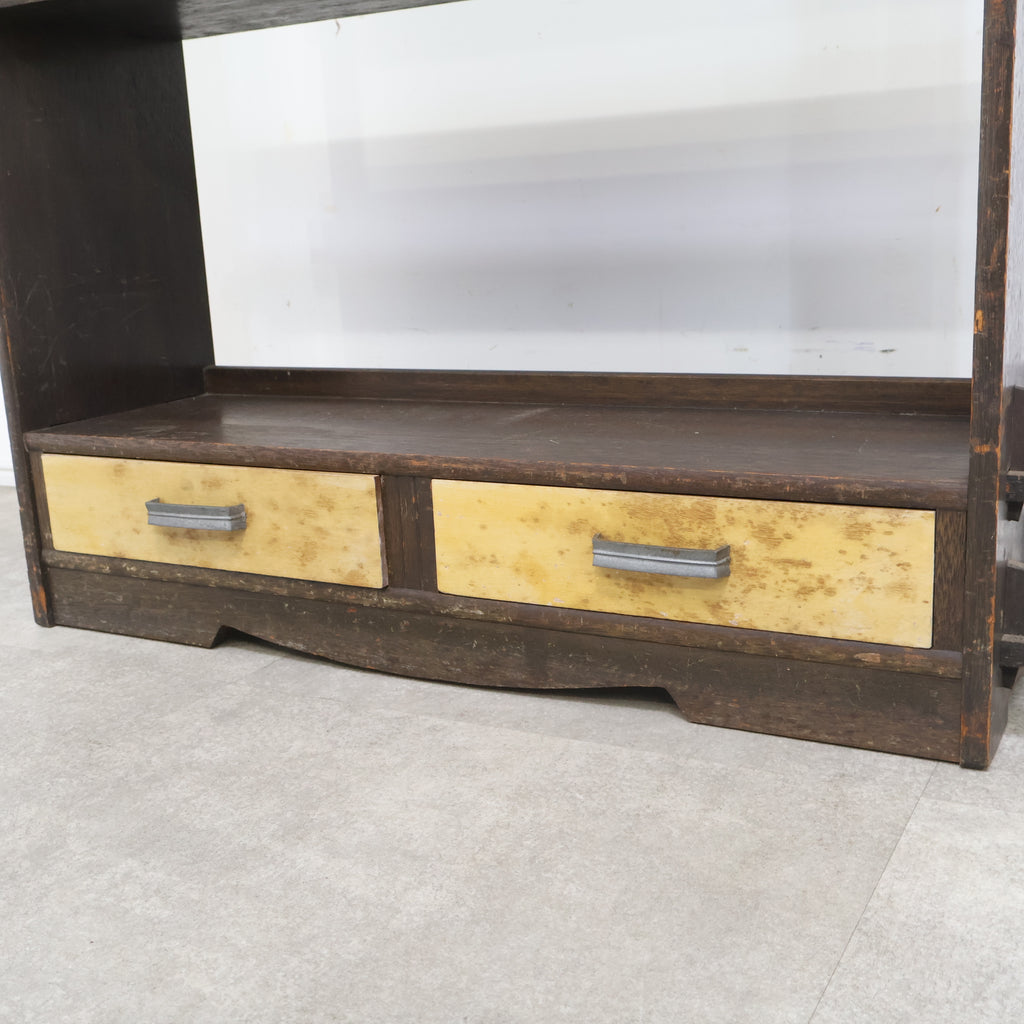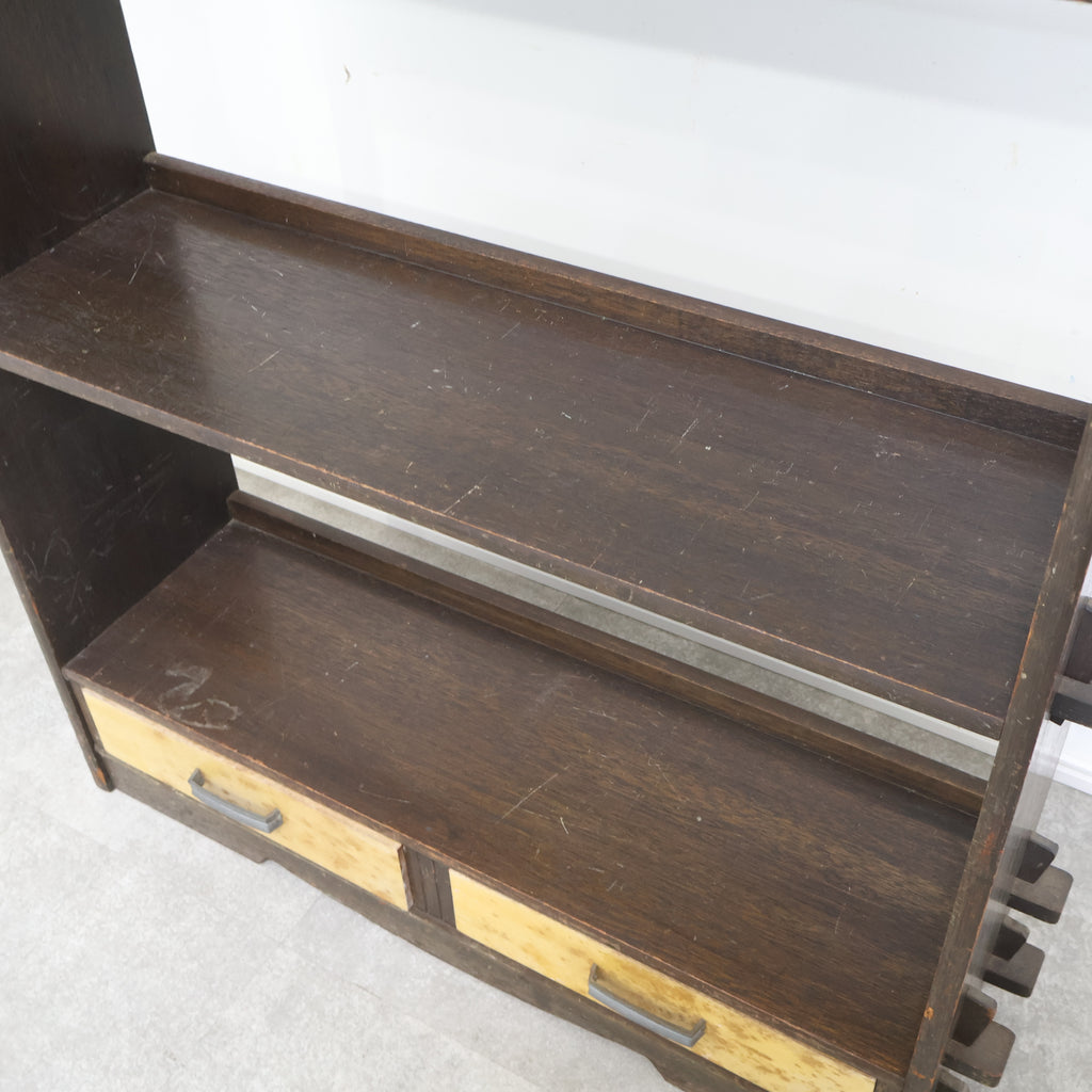 5段のオープンシェルフは収納力が高く、本の整理はもちろん、雑貨や植物、うつわのディスプレイにも最適。 下部には珍しい引き出しが2杯備わっており、細かなアイテムを収納できるのも魅力的なポイントです。 素朴で落ち着いた木の質感は、和家具・古民家インテリア・ナチュラルスタイルとの相性が良く、ショップ什器としても空間にあたたかみを与えてくれます。