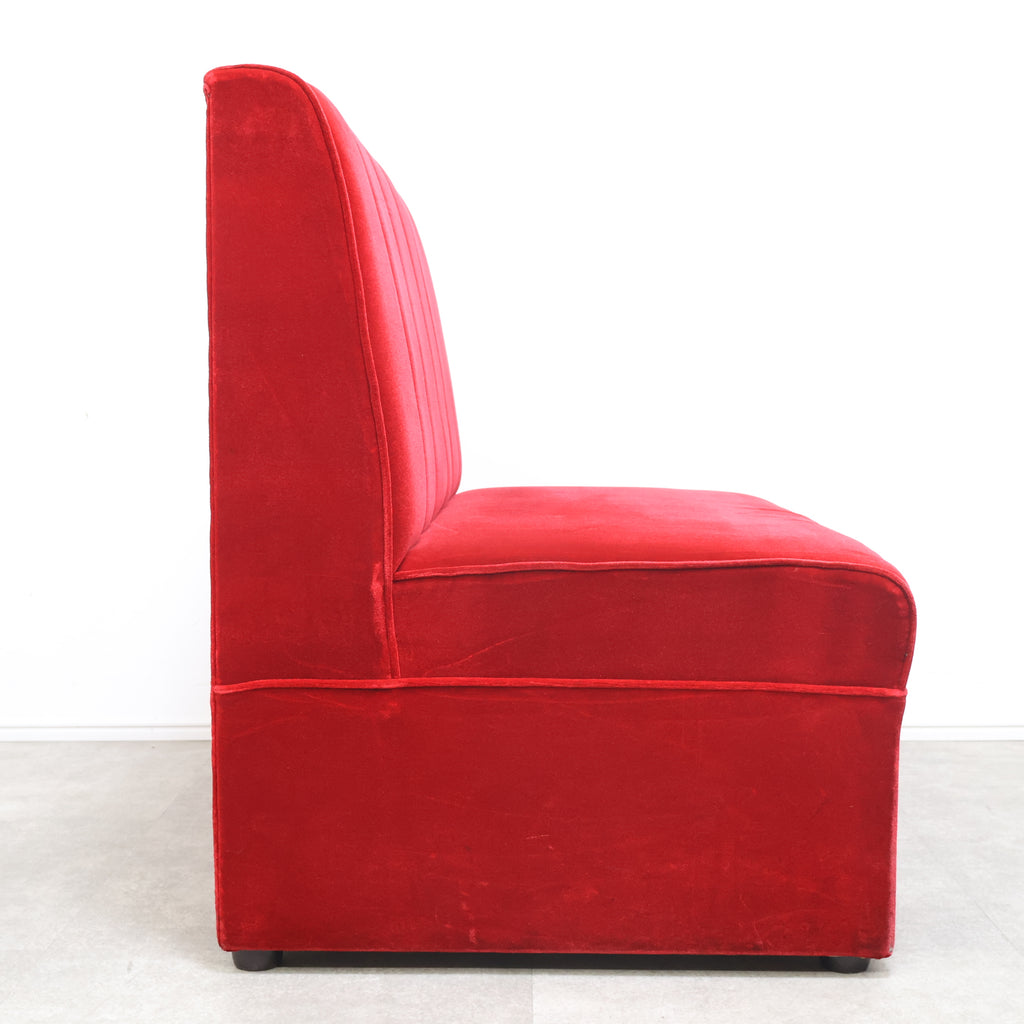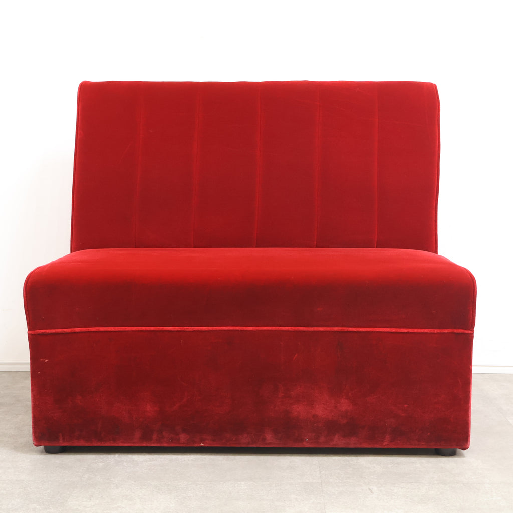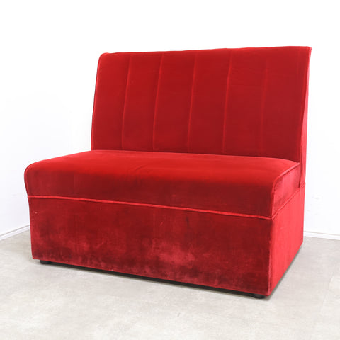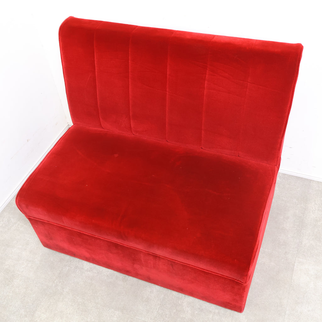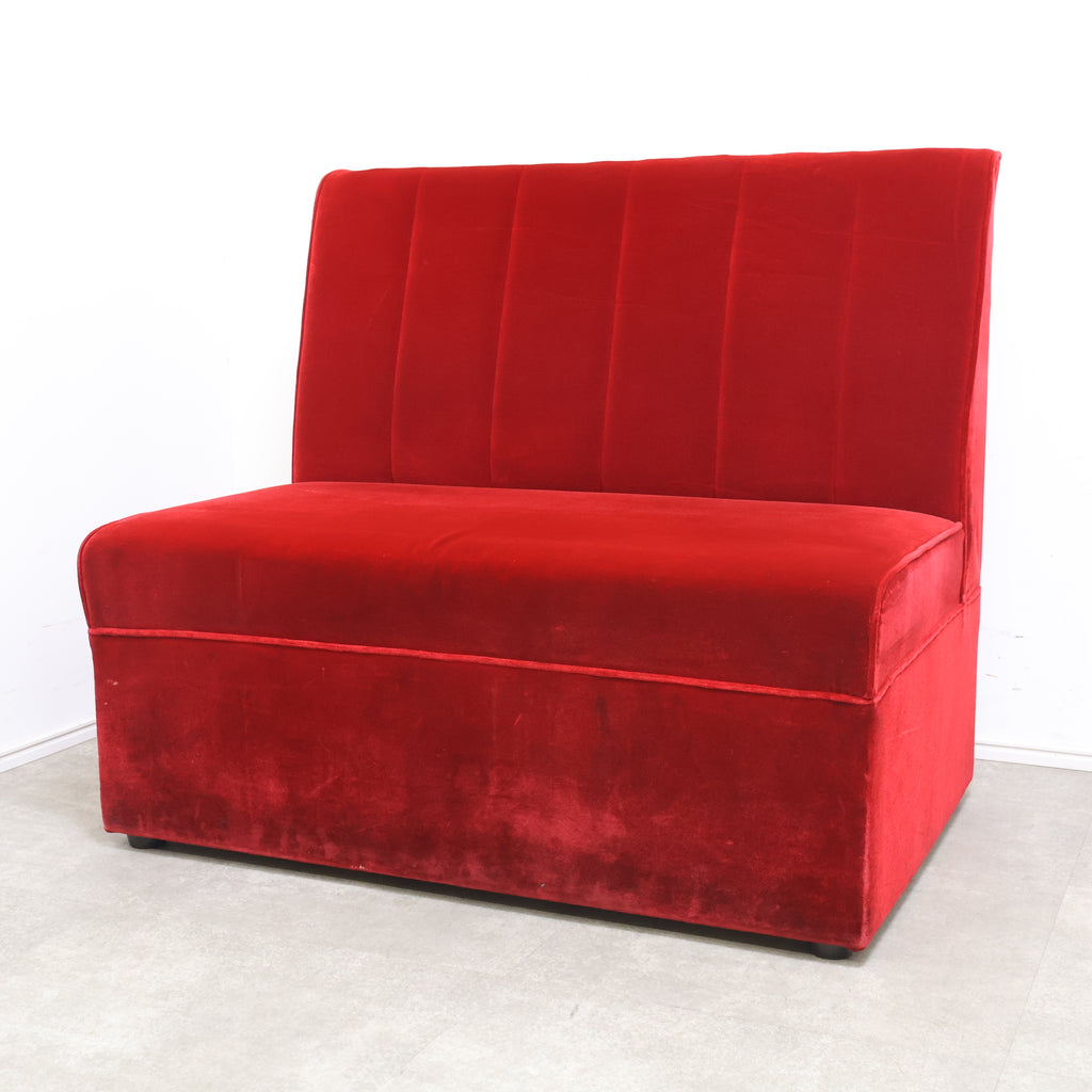 鮮やかなレッドカラーが印象的な、喫茶店・ラウンジで使用されていた2人掛けボックスソファです。