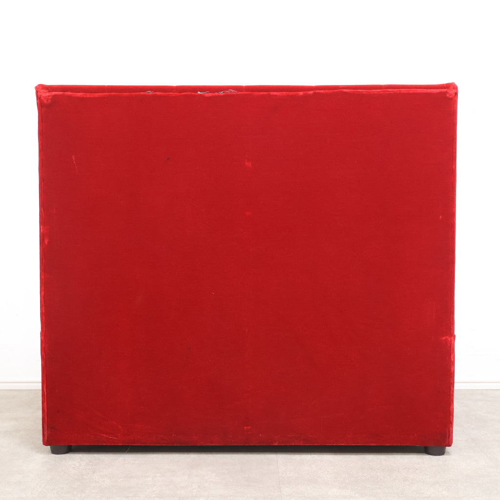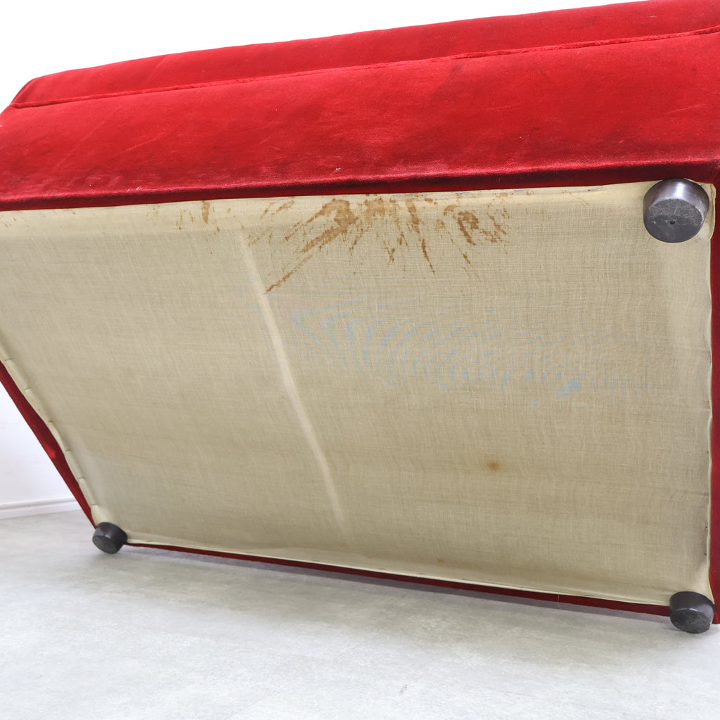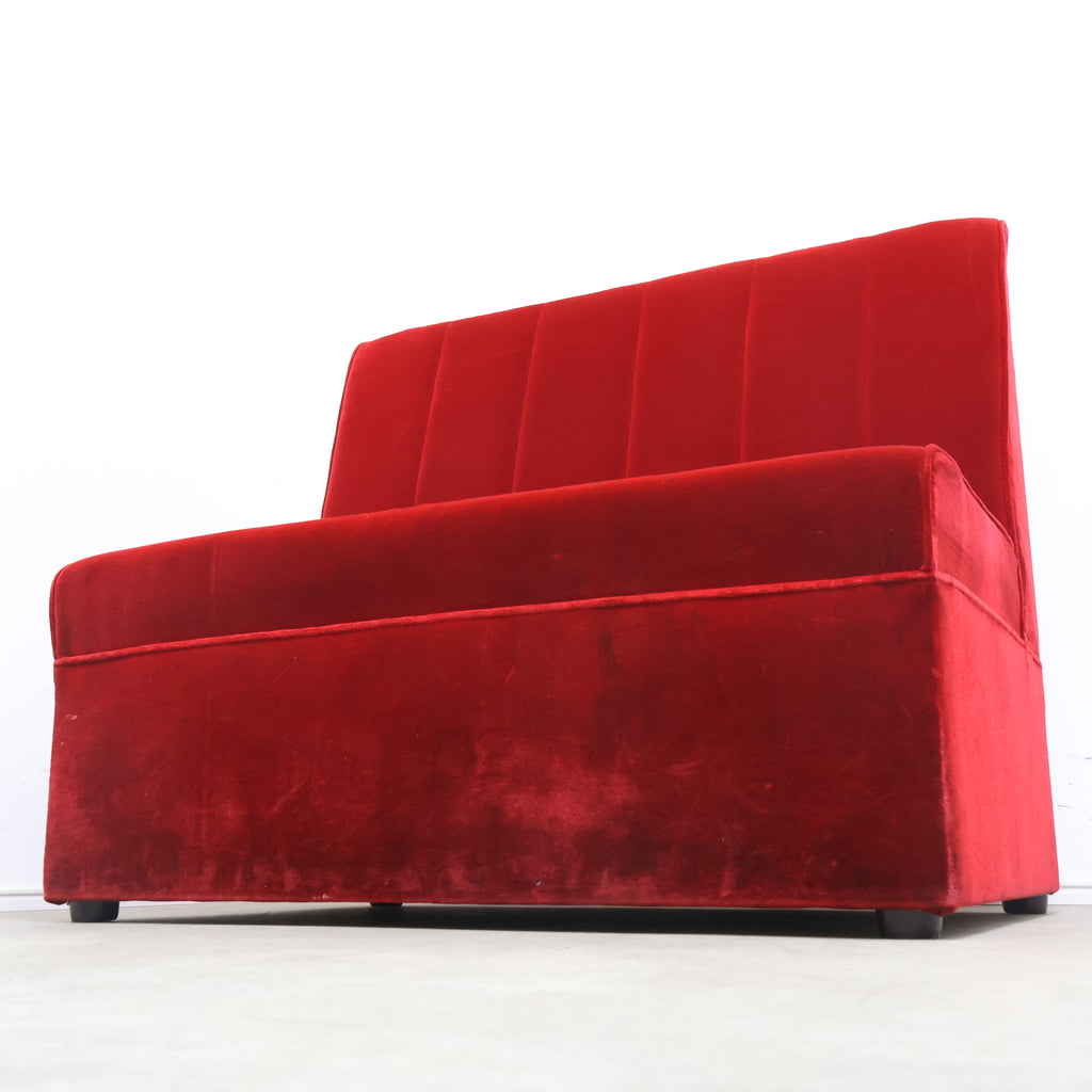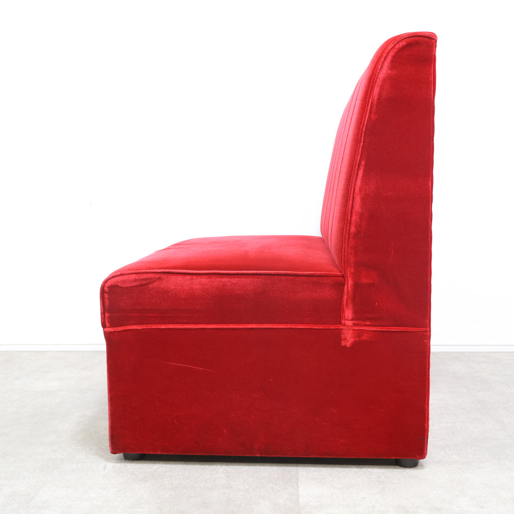 鮮やかなレッドカラーが印象的な、喫茶店・ラウンジで使用されていた2人掛けボックスソファです。