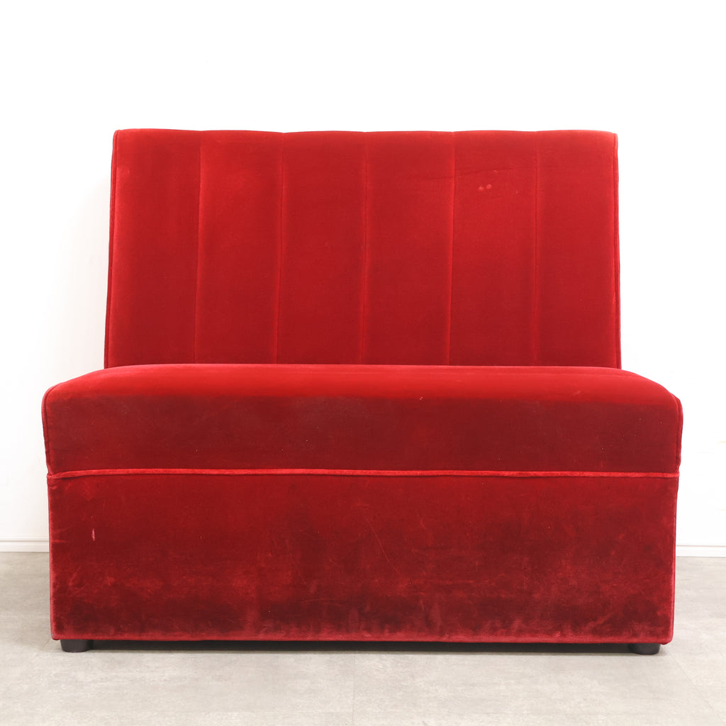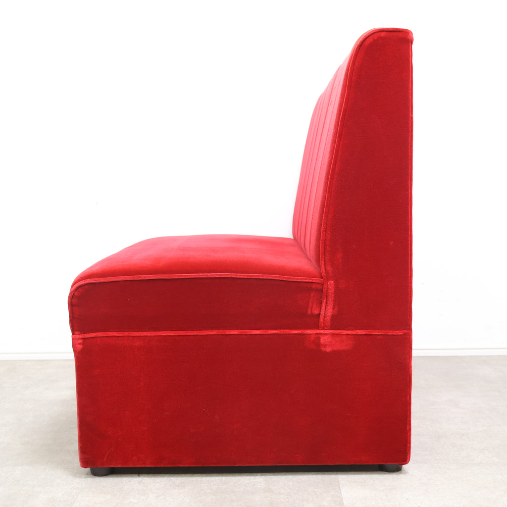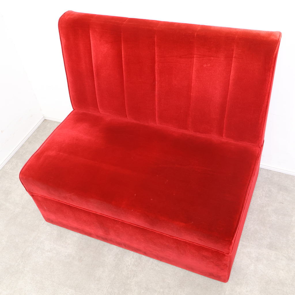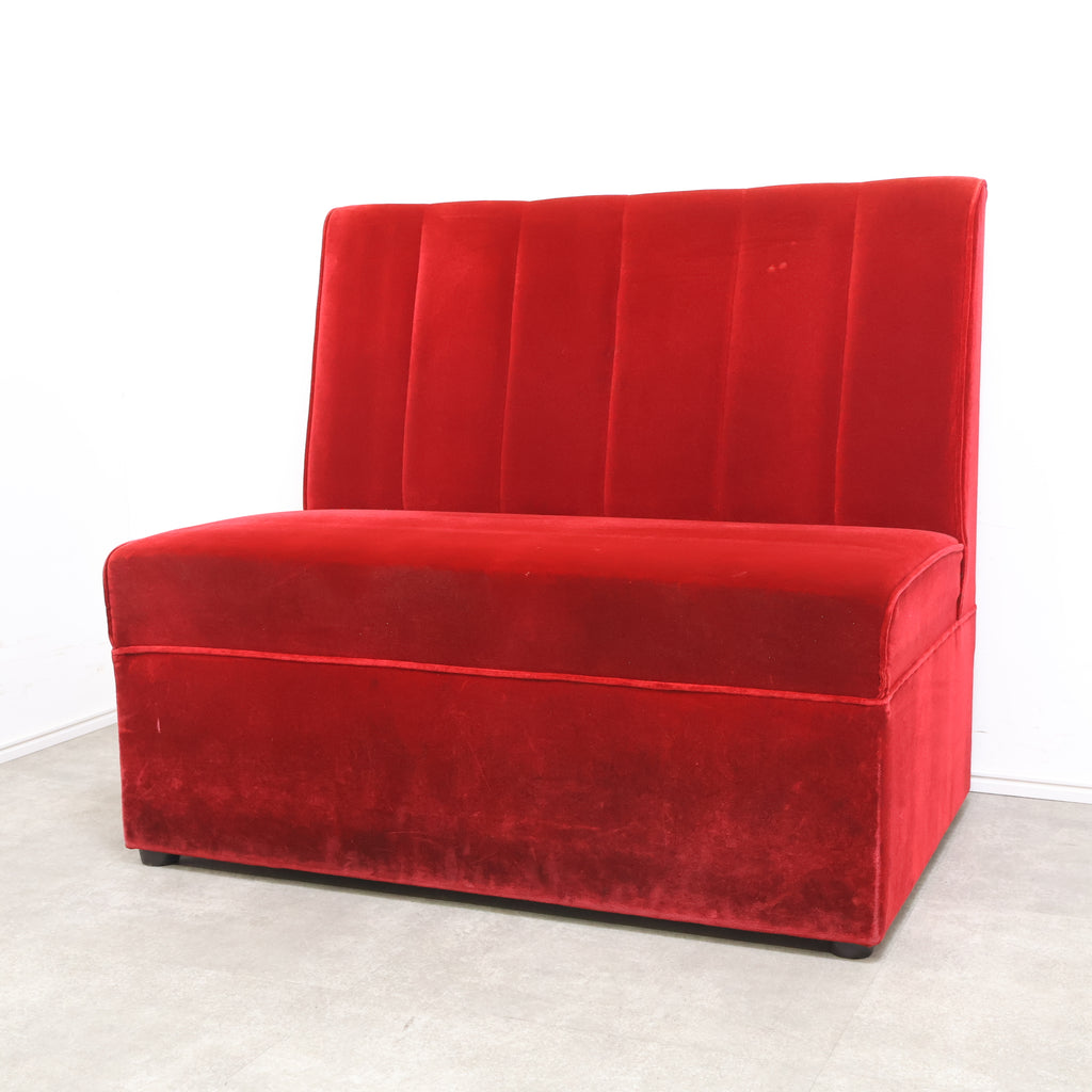 鮮やかなレッドカラーが印象的な、喫茶店・ラウンジで使用されていた2人掛けボックスソファです。