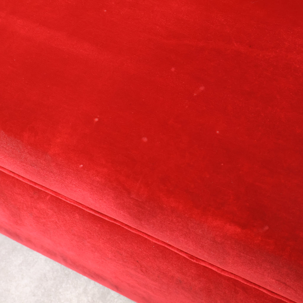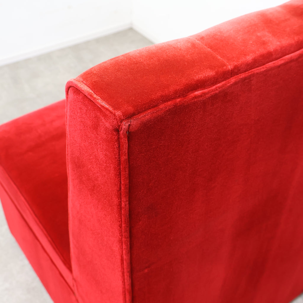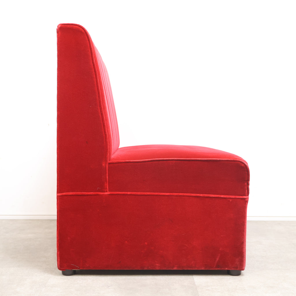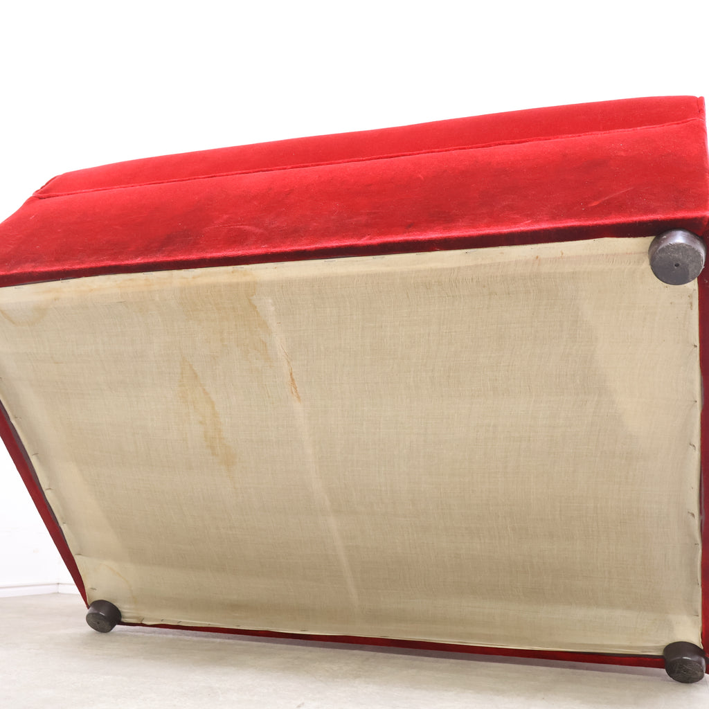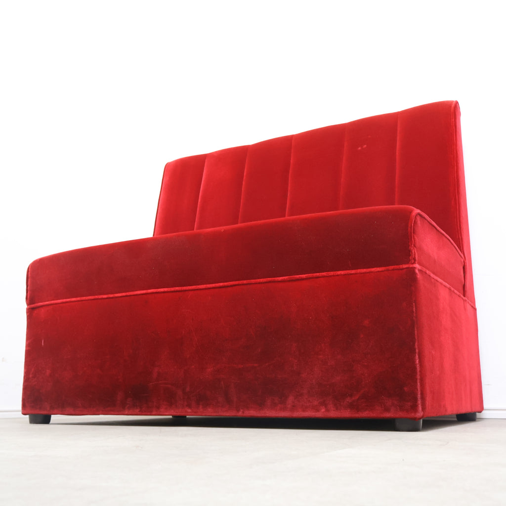 鮮やかなレッドカラーが印象的な、喫茶店・ラウンジで使用されていた2人掛けボックスソファです。