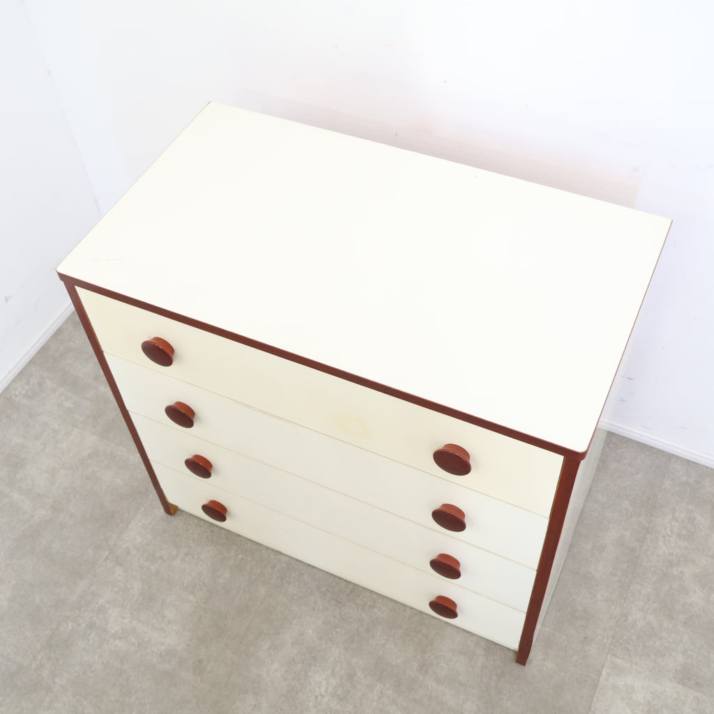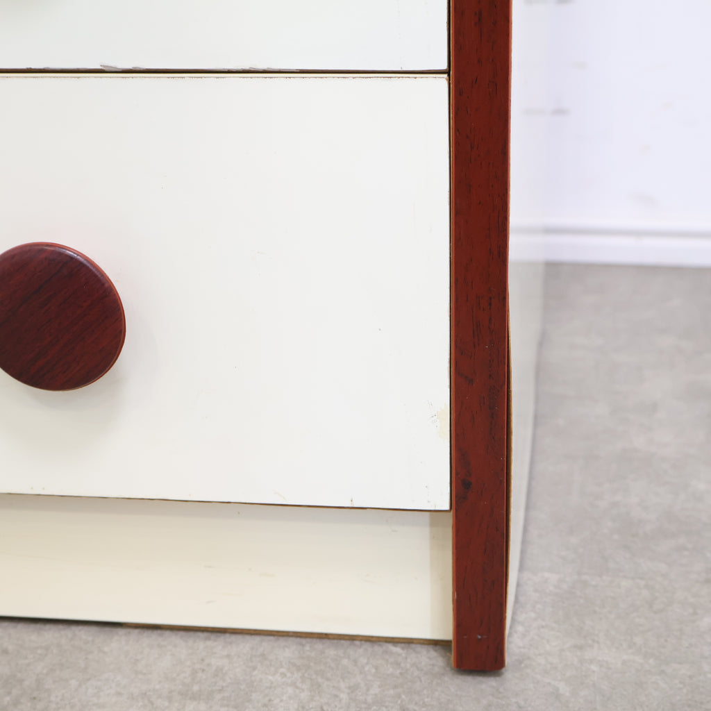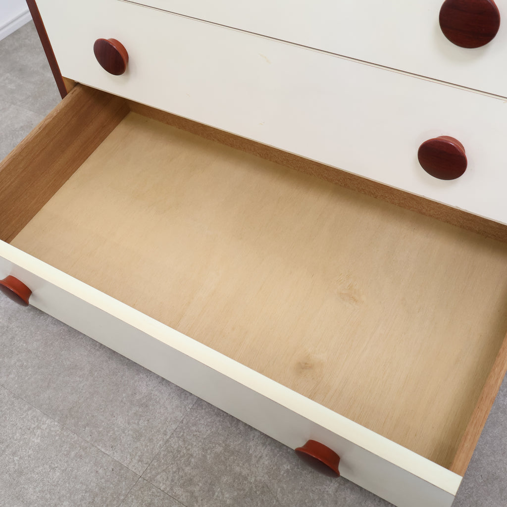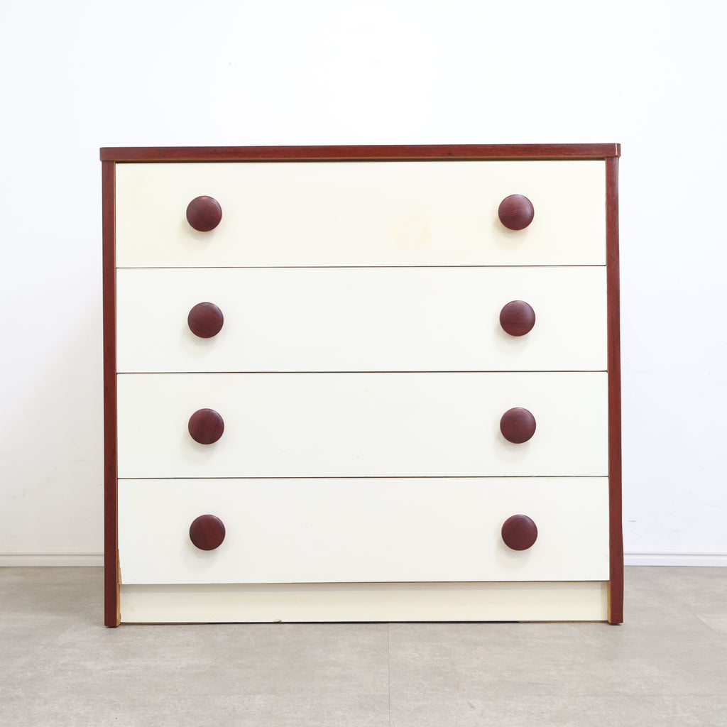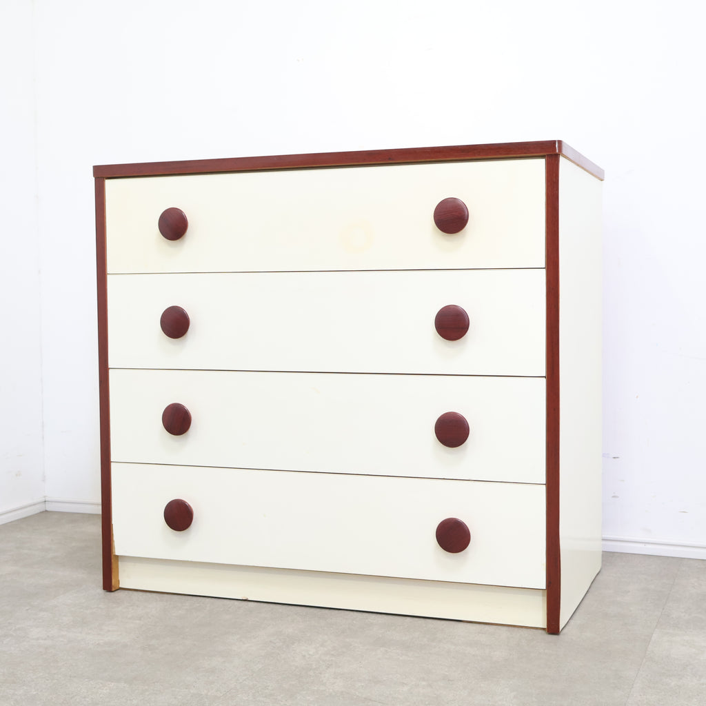 4段の引き出しは衣類や小物の整理に使いやすく、リビングや寝室、子ども部屋など幅広いシーンで活躍。 主張しすぎない配色のため、昭和レトロはもちろん、北欧テイストやナチュラルインテリアとも相性良く馴染みます。