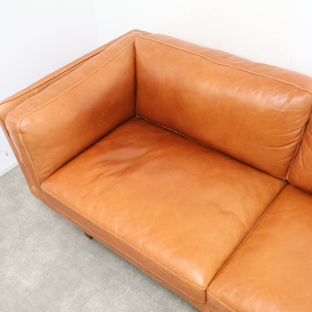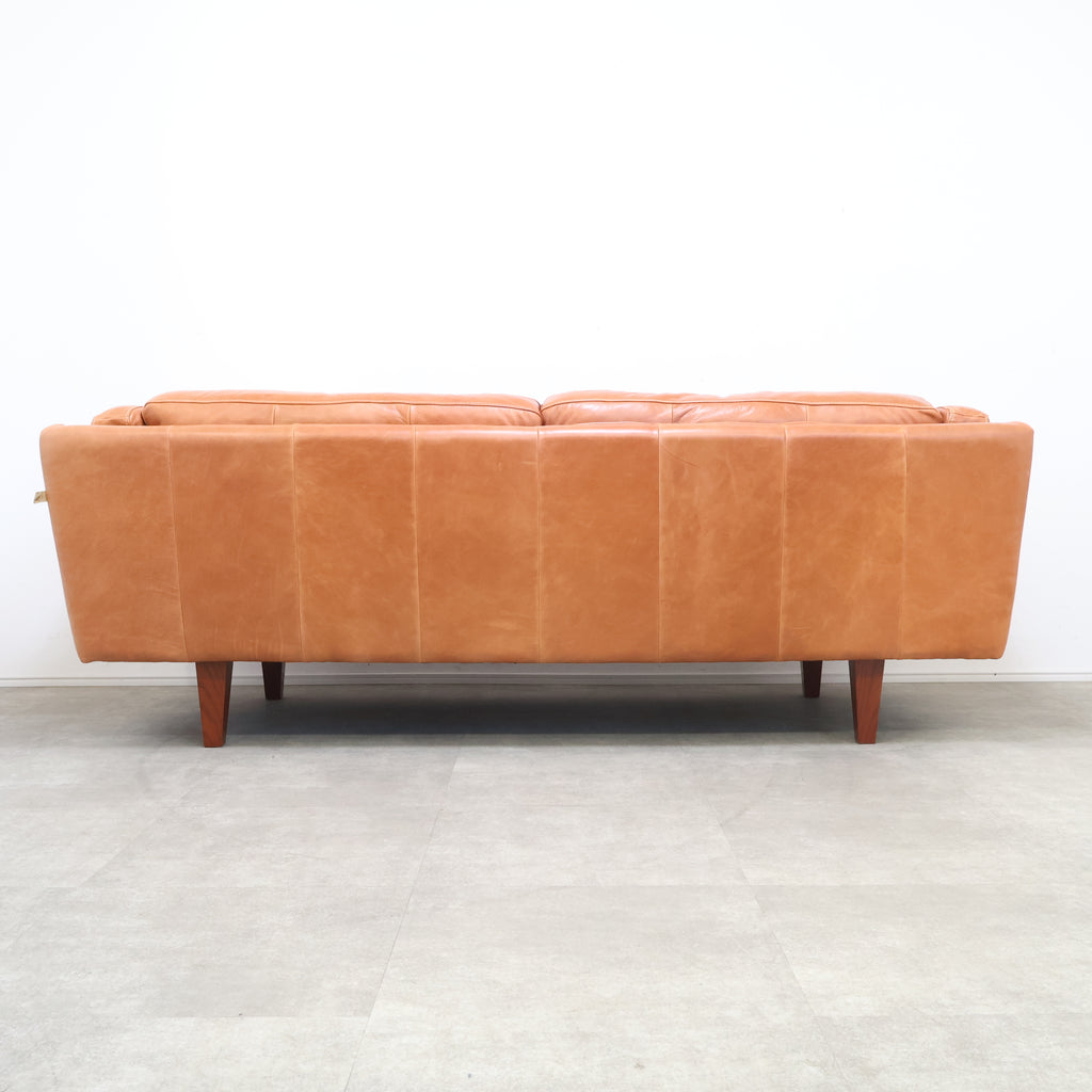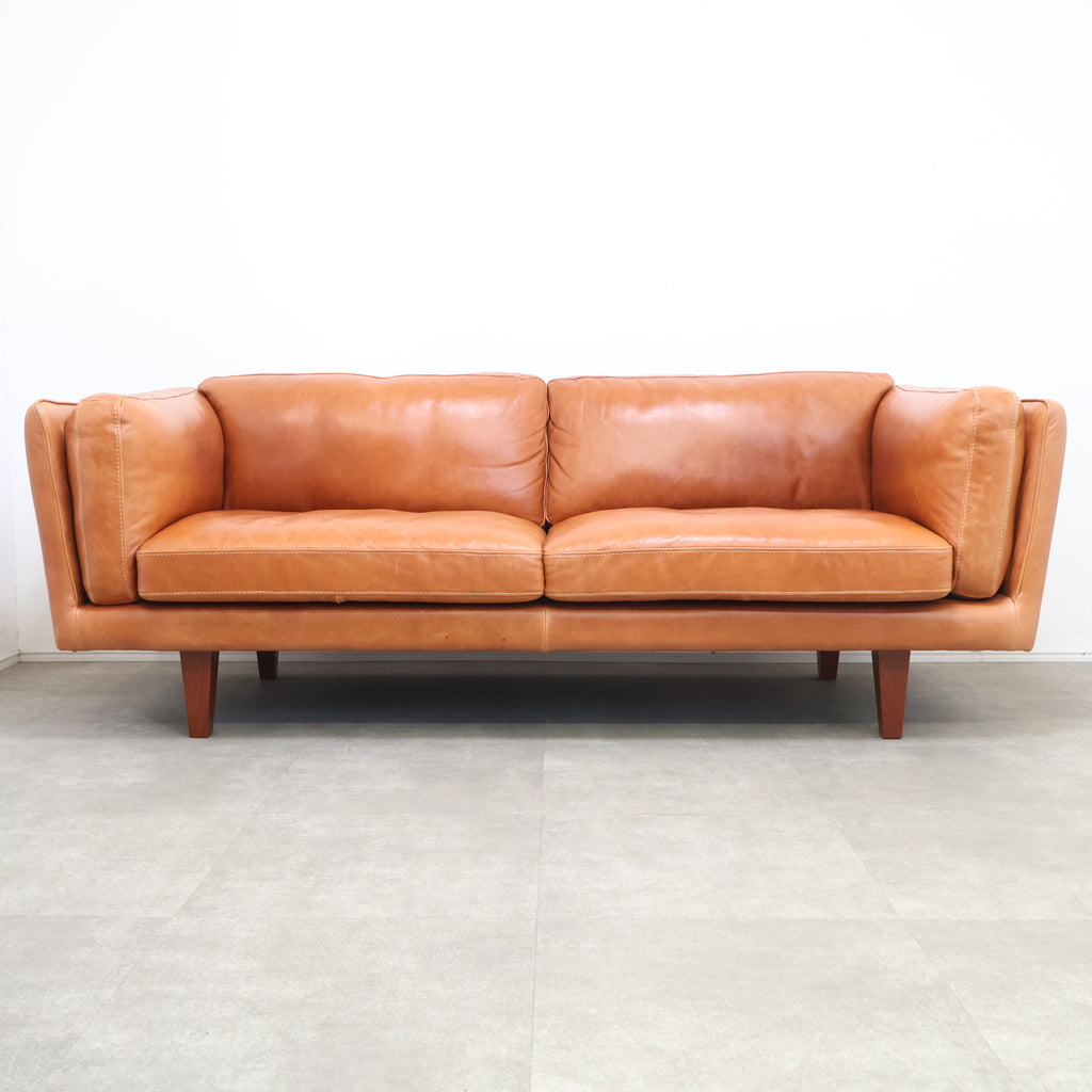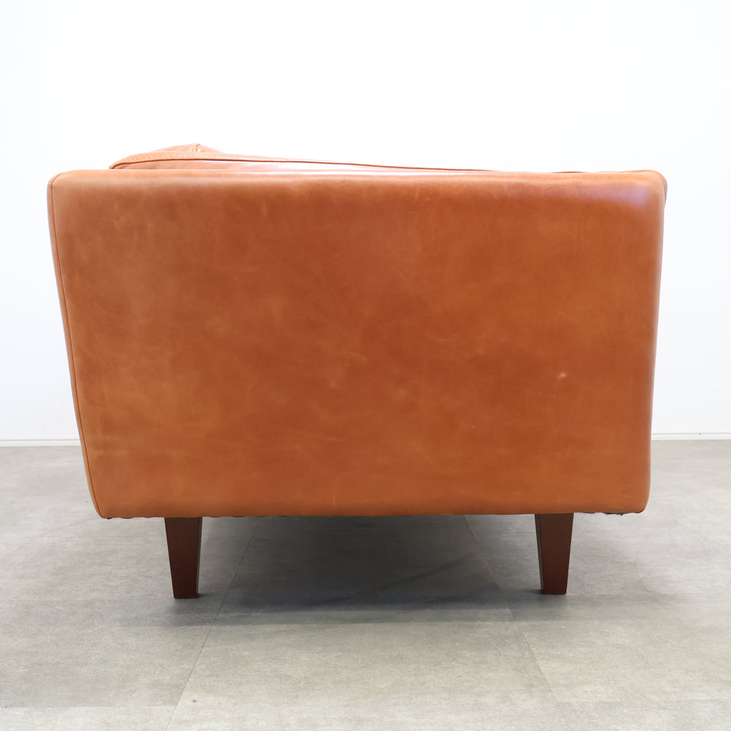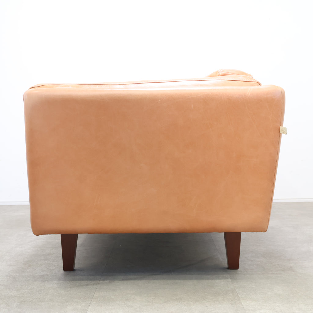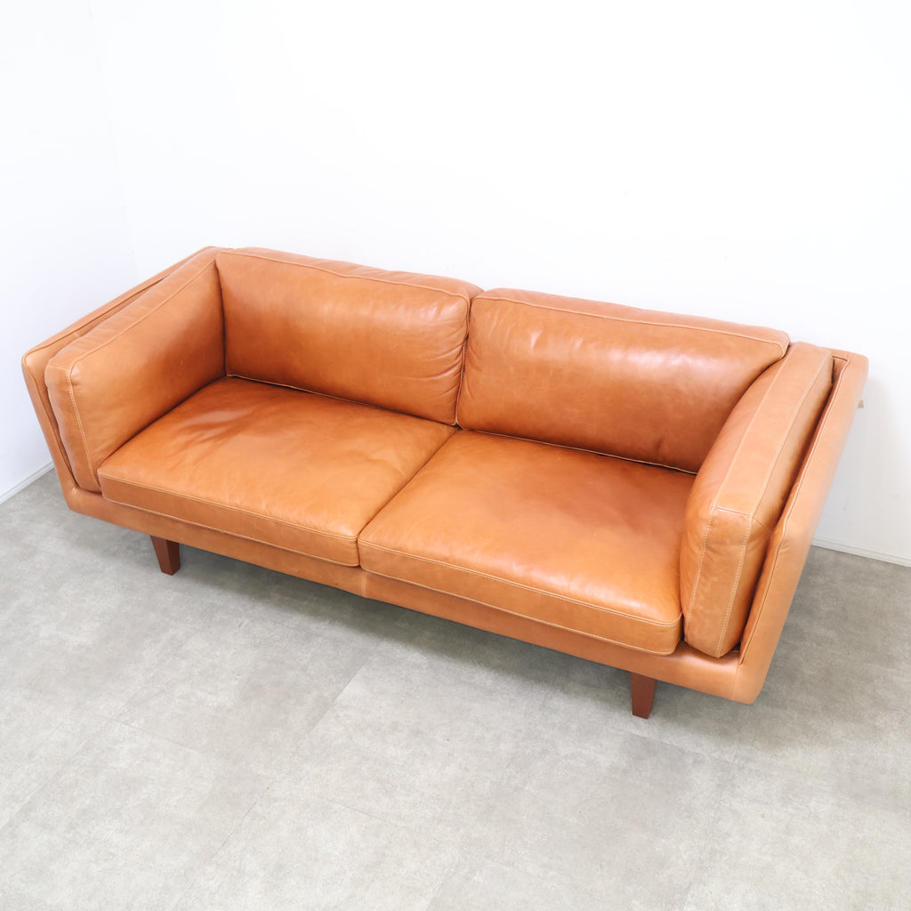 厚みのあるレザーを贅沢に使用し、使い込むほどに表情が深まるキャメルカラーが魅力です。 直線的で無駄のないフォルムに、低めの脚部を組み合わせたデザインは、リビングに程よい存在感をプラス。