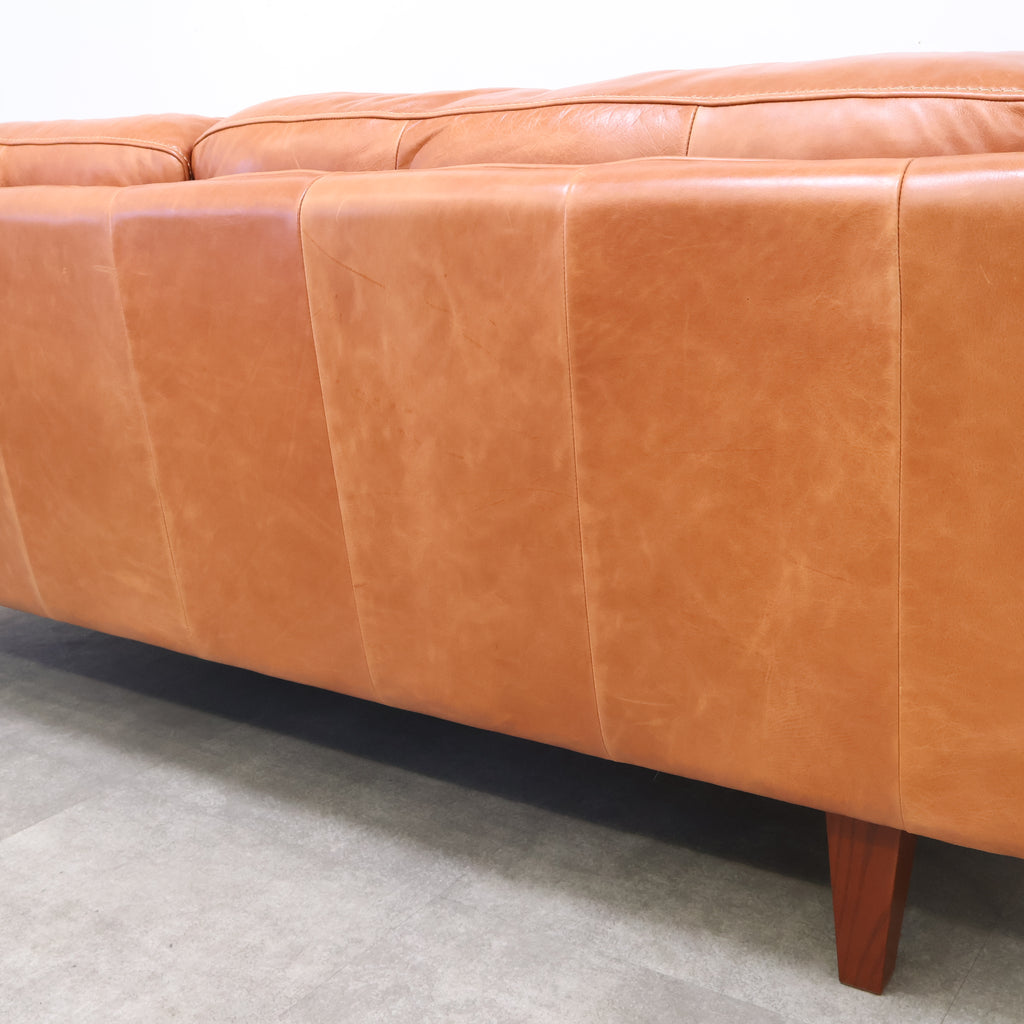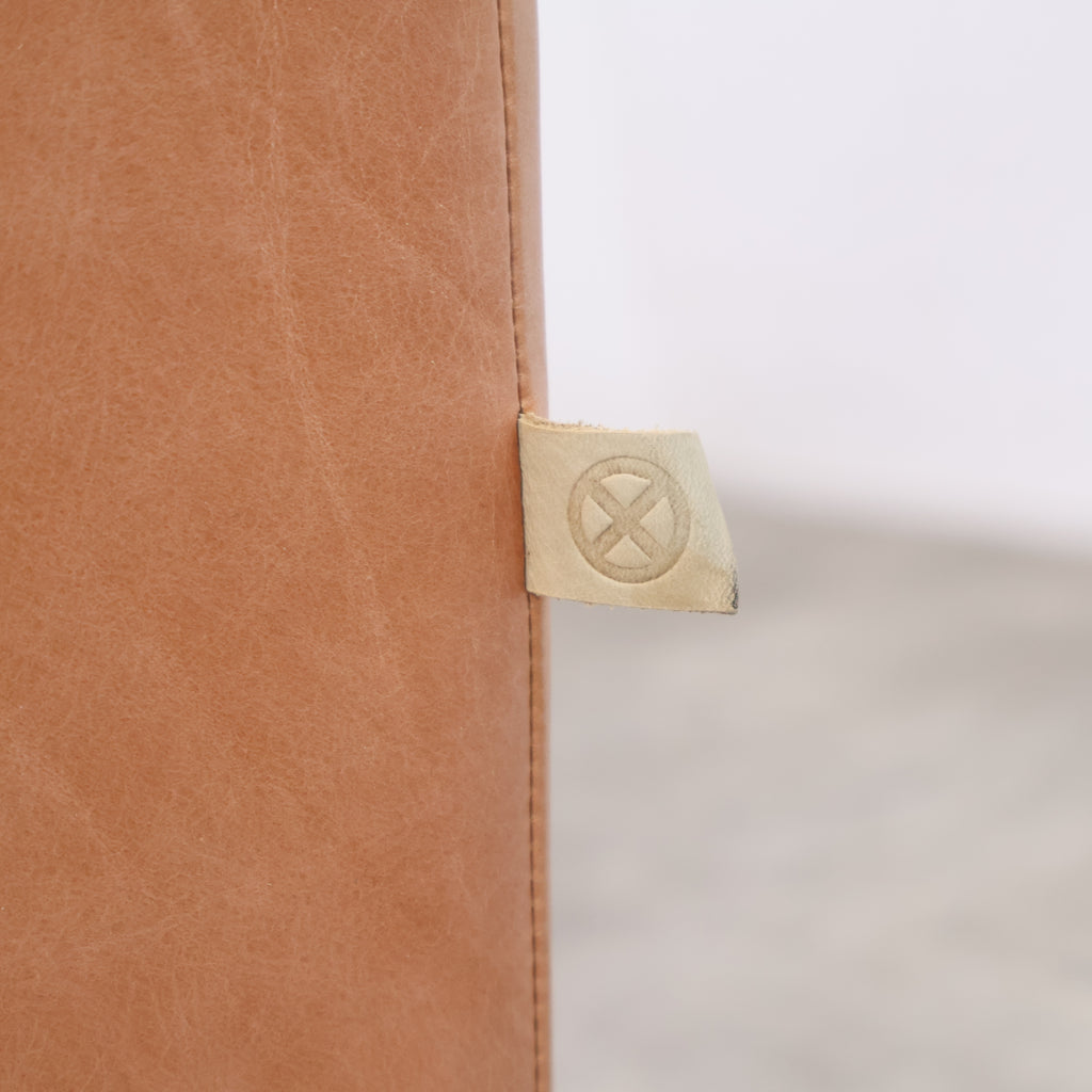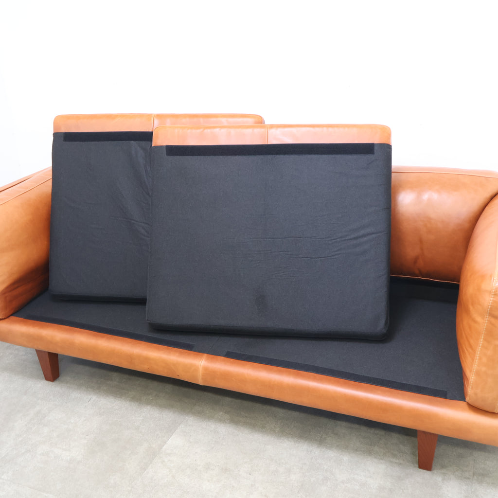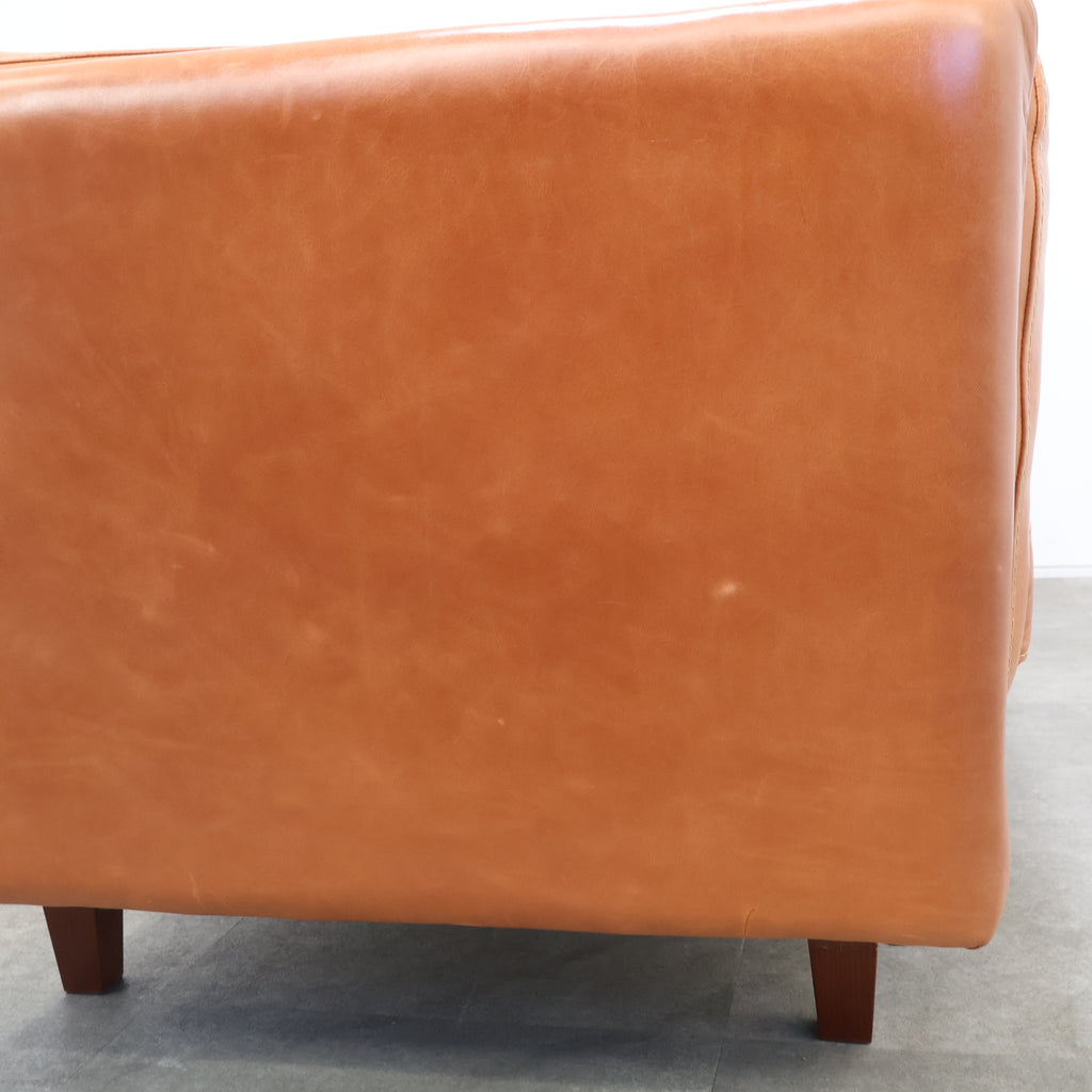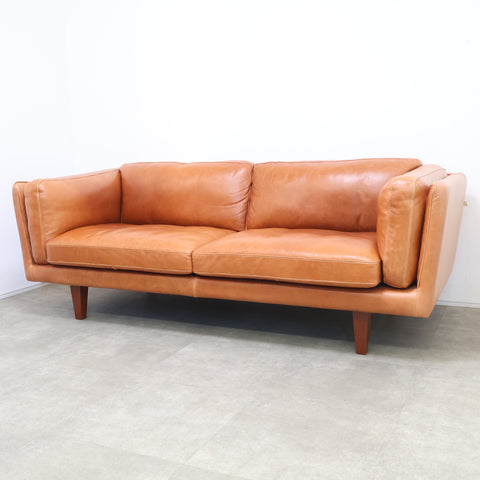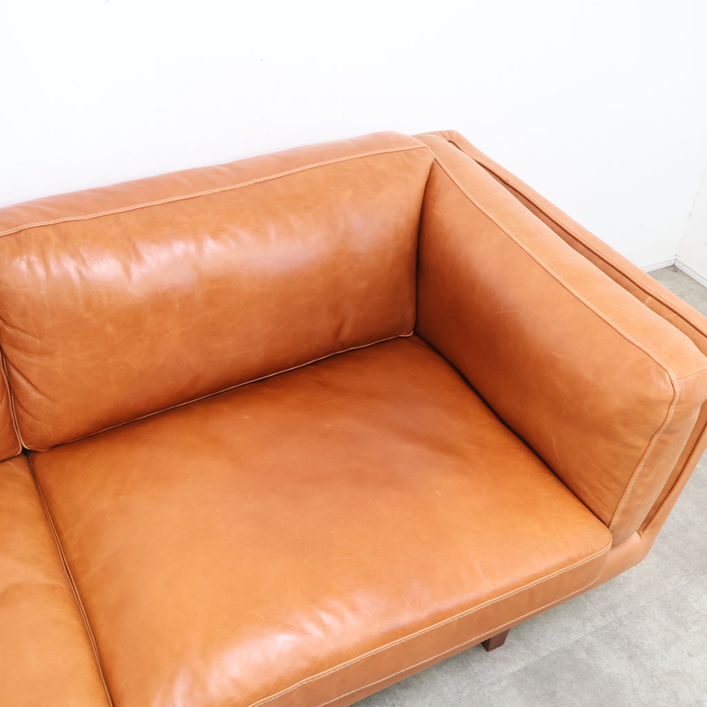 厚みのあるレザーを贅沢に使用し、使い込むほどに表情が深まるキャメルカラーが魅力です。 直線的で無駄のないフォルムに、低めの脚部を組み合わせたデザインは、リビングに程よい存在感をプラス。