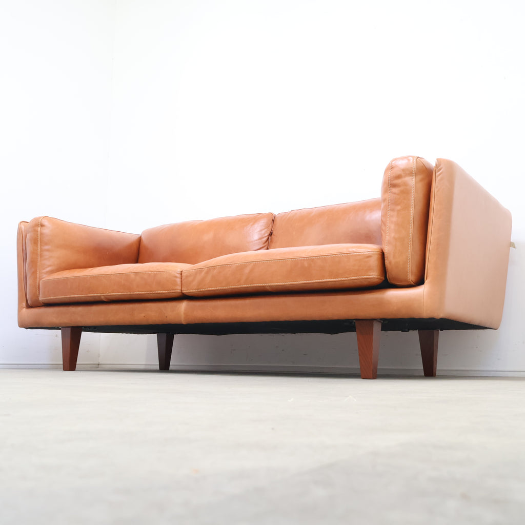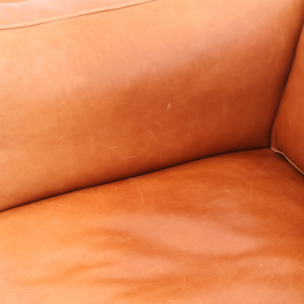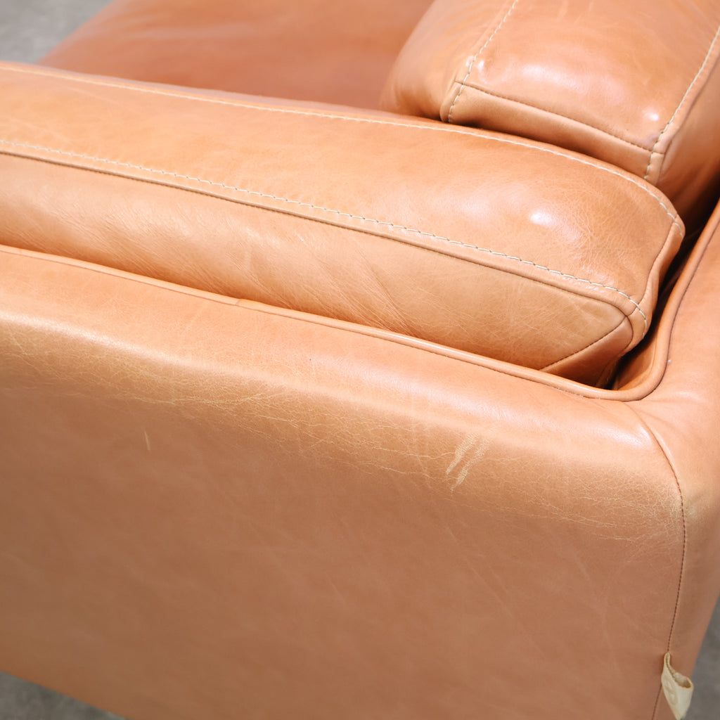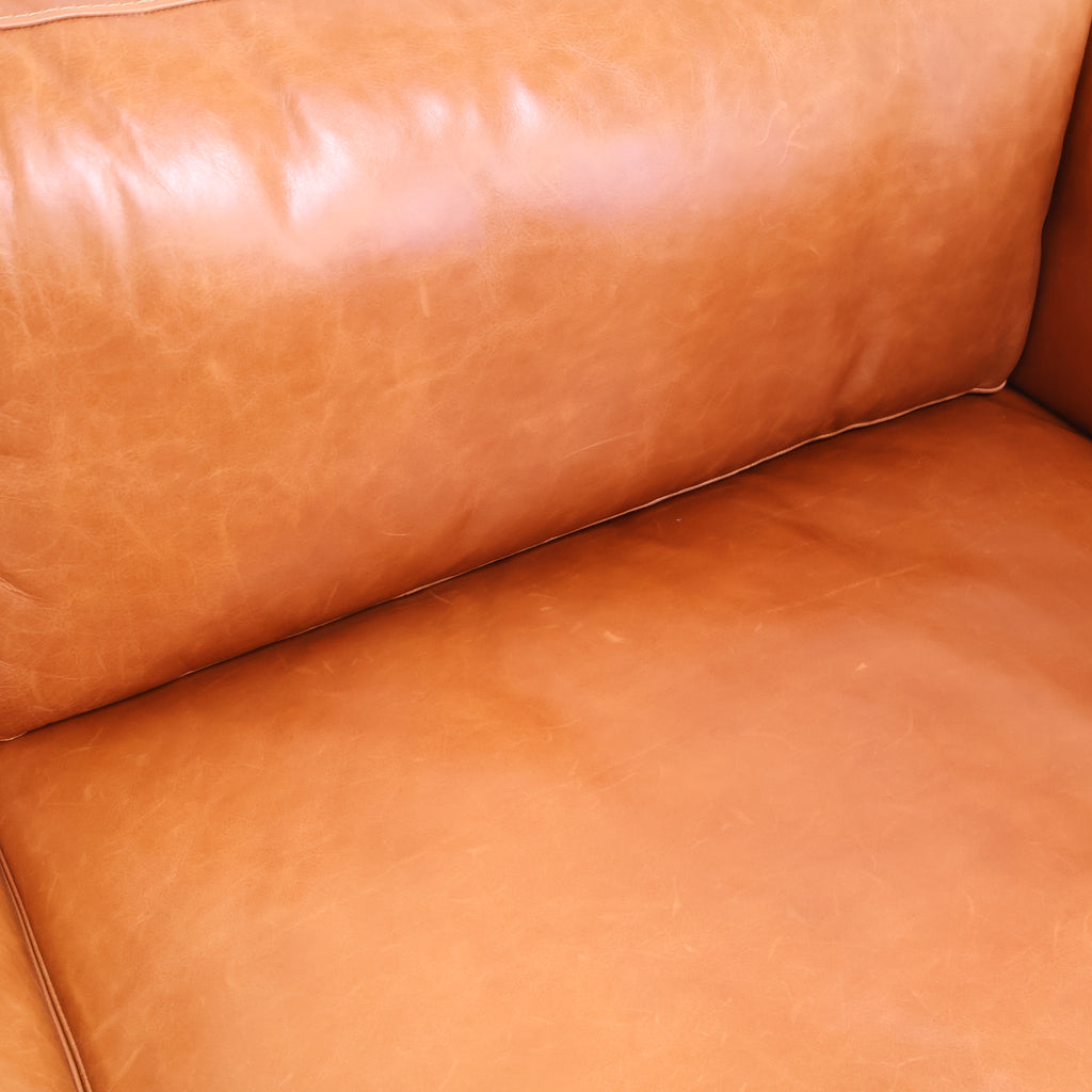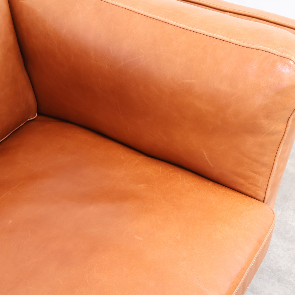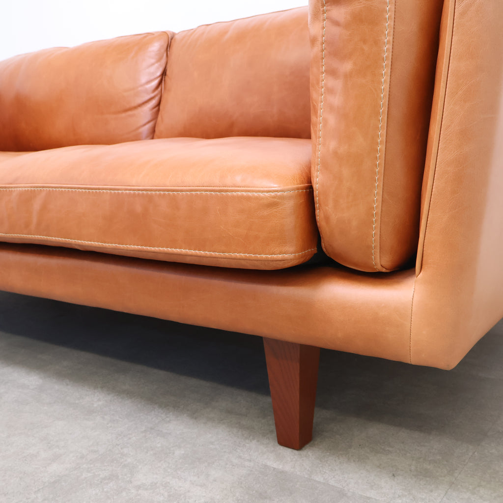 厚みのあるレザーを贅沢に使用し、使い込むほどに表情が深まるキャメルカラーが魅力です。 直線的で無駄のないフォルムに、低めの脚部を組み合わせたデザインは、リビングに程よい存在感をプラス。