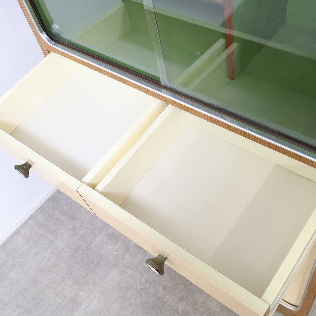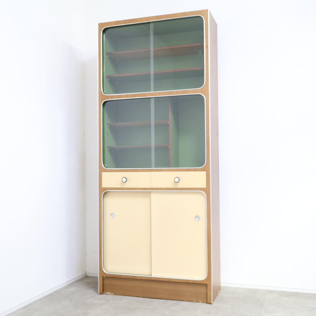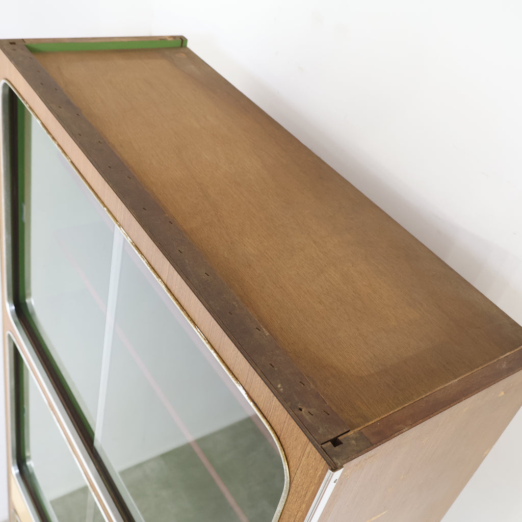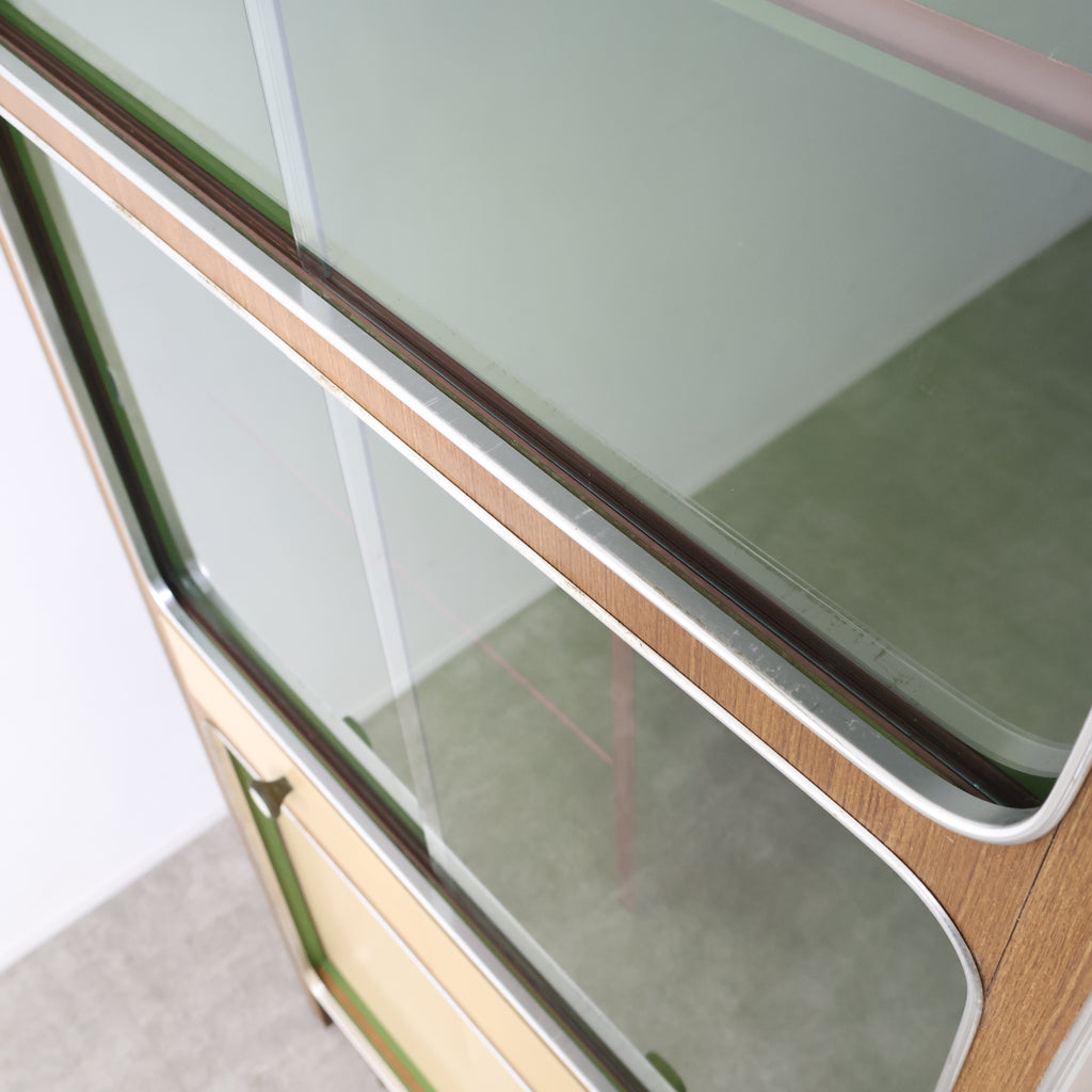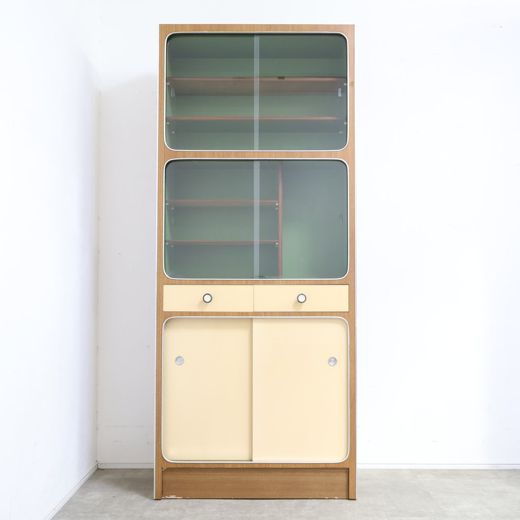 木目のフレームに、丸みのあるガラス窓とやさしいクリームカラーの引き戸を組み合わせた、昭和レトロらしい佇まいのキャビネット。